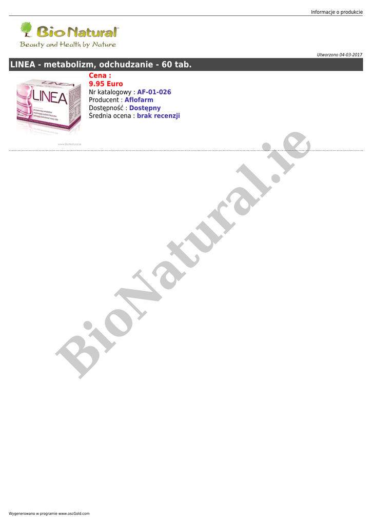 Informacje o produkcie Utworzono 04-03-2017 LINEA - metabolizm, odchudzanie - 60 tab. Cena : 9.95 Euro B io N at ur al .ie Nr katalogowy : AF-01-026 Producent : Aflofarm Dostępność : Dostępny Średnia ocena : brak recenzji Wygenerowano w programie www.oscGold.com Skuteczność produktu Linea wynika ze skorelowanego działania specjalnie dobranych składników, które redukują tkankę tłuszczową, zapobiegają tworzeniu się nowych komórek tłuszczowych, pobudzają procesy przemiany Składniki suplementu diety Linea: - pomagają kontrolować masę ciała, - przyspieszają metabolizm, - wspomagają spalanie tłuszczów, - pomagają w utrzymaniu prawidłowego poziomu glukozy we krwi. Opakowanie: 60 tabletek Charakterystyka składników Składniki aktywne (w 2 tabletkach): ilość L-karnityna 200 mg Wyciąg z zielonej herbaty Chrom - 200 mg - 60 g 150% 200 mg - 80 mg - N at Wyciąg z białej fasoli Ocet jabłkowy % ZDS ur Składniki al .ie - Wyciąg z zielonej herbaty przyczynia się do spalania tłuszczów oraz pobudza metabolizm, co z kolei pomaga kontrolować masę ciała. Przyczynia się do prawidłowego funkcjonowania dróg moczowych oraz wspiera funkcjonowanie nerek. - Chrom przyczynia się do utrzymania prawidłowego metabolizmu makroskładników odżywczych oraz pomaga w utrzymaniu prawidłowego poziomu glukozy we krwi. - L-karnityna jest organicznym związkiem syntezowanym w organizmie człowieka. Wytwarzana jest w nerkach i wątrobie przy udziale witaminy C, PP, B6 oraz żelaza. - Fasolamina - hamuje trawienie skrobi znajdującej się w produktach spożywczych (ziemniaki, pieczywo, makaron, pierogi). Białkowy składnik fasolaminy przyłącza się do enzymu zwanego alfa-amylazą, powstrzymując go rozkładem skrobi na cukry. W rezultacie, większość skrobi przechodzi niestrawiona przez jelita, a organizm nie absorbuje tylu kalorii. - Ocet jabłkowy - reguluje trawienie, pobudza procesy metaboliczne oraz zmniejsza wchłanianie cukrów i tłuszczy. *-%ZDS - Zalecanego Dziennego Spożycia Sposób użycia: Dorośli 1 tabletka 2-3 razy dziennie. Preparat zaleca się zażywać podczas posiłku . Nie należy przekraczać zalecanej porcji dziennego spożycia. io Przeciwwskazania: Uczulenie na którykolwiek ze składników produktu. Kobiety w ciąży i matki karmiące piersią powinny skonsultować możliwość stosowania preparatu z lekarzem. Nie stosować u dzieci. B strona www produktu: www.mojalinea.pl Środki bezpieczeństwa: Przechowywać: w suchym, nienasłonecznionym miejscu, w temp. do 25°C Przechowywać w szczelnie zamkniętym opakowaniu, w miejscach niedostępnych dla dzieci. Nie przekraczać zalecanej dawki dziennej. Suplementy diety nie mogą być stosowane jako substytut zróżnicowanej diety. Suplementy diety - preparaty zawierające niezbędne dla zdrowia i prawidłowego funkcjonowania organizmu składniki (witaminy, minerały i inne substancje egzogenne). Oferowane są w postaci skoncentrowanej - jako tabletki, kapsułki, proszek lub płyn. Nie leczą i nie zapobiegają chorobom. Jeśli zażywasz leki, zanim zaczniesz stosować suplement diety, zasięgnij porady lekarza lub farmaceuty. Niektóre połączenia mogą być bowiem niebezpieczne dla zdrowia. Firma NCI jest producentem i dystrybutorem preparatów ziołowych i kosmetyków. Nie leczymy i nie udzielamy porad medycznych. Informacje zawarte na naszej stronie internetowej mają charakter informacyjny i nie są poradami medycznymi. W razie problemów zdrowotnych należy skonsultować się z lekarzem lub farmaceutą. Nie wolno opierać się jedynie na suplementach i odrzucać klasyczne leki zalecane przez lekarzy. Informacje dodatkowe: Przed zastosowaniem produktu sugerujemy zapoznanie się z dokładnymi informacjami podanymi na opakowaniu lub załączonej ulotce. Informacje o produkcie B io N at ur al .ie Pochodzenie: Polska Najlepsze przed: 31/01/2017 Wygenerowano w programie www.oscGold.com