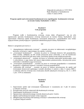 Załącznik do uchwały nr 15/IV/2016 Rady Miejskiej w Suchedniowie z dnia 31 marca 2016r. Program opieki nad zwierzętami bezdomnymi oraz zapobiegania bezdomności zwierząt na terenie Gminy Suchedniów w 2016 r. Rozdział 1 Cele programu 1.1 Program walki z bezdomnością zwierząt, zwany dalej „Programem”, ma na celu ograniczenie zjawiska bezdomności zwierząt domowych na terenie Gminy Suchedniów oraz zapewnienie właściwej opieki bezdomnym zwierzętom domowym i gospodarskim oraz wolno żyjącym kotom, przebywającym w granicach administracyjnych Gminy Suchedniów. 1.2 Ilekroć w programie jest mowa o: 1. „humanitarnym traktowaniu zwierząt” – rozumie się przez to traktowanie uwzględniające potrzeby zwierzęcia i zapewniające mu opiekę i ochronę; 2. „zwierzętach bezdomnych” – rozumie się przez to zwierzęta domowe lub gospodarskie, które uciekły, zabłąkały się lub zostały porzucone przez człowieka, a nie ma możliwości ustalenia ich właściciela lub innej osoby, pod której opieką trwale dotąd pozostawały; 3. „zwierzętach domowych” – rozumie się przez to zwierzęta tradycyjnie przebywające wraz z człowiekiem w jego domu lub innym odpowiednim pomieszczeniu, utrzymywane przez człowieka w charakterze jego towarzysza; 4. „zwierzętach gospodarskich” – rozumie się przez to zwierzęta gospodarskie w rozumieniu przepisów o organizacji hodowli i rozrodzie zwierząt gospodarskich; 5. ,,schronisku dla zwierząt” – rozumie się przez to miejsce przeznaczone do opieki nad zwierzętami domowymi spełniające warunki określone w ustawie z dnia 11 marca 2004 r. o ochronie zdrowia zwierząt oraz zwalczaniu chorób zakaźnych zwierząt (t.j. Dz. U. z 2014 r. poz. 1539 ze zmianami). Rozdział 2 Zadania 2.1 1. Zapewnienie opieki nad zwierzętami bezdomnymi w rozumieniu art. 4 pkt 16 ustawy o ochronie zwierząt. 2. Poszukiwanie nowych właścicieli dla bezdomnych zwierząt. 3. Zapobieganie bezdomności zwierząt. 4. Ograniczenie niekontrolowanego rozrodu domowych psów i kotów. 5. Opieka nad bezdomnymi kotami wolno żyjącymi. 6. Obligatoryjną sterylizację lub kastrację zwierząt w schroniskach dla zwierząt. 7. Usypianie ślepych miotów. 8. Poprawa bezpieczeństwa i porządku publicznego. 9. Edukacja społeczeństwa w zakresie obowiązków spoczywających na właścicielach zwierząt domowych, a w szczególności psów i kotów. 10. Promowanie prawidłowych postaw i zachowań człowieka w stosunku do zwierząt. 11. Zapewnienie całodobowej opieki weterynaryjnej zwierzętom objętym Programem na wypadek następstw zdarzeń drogowych. 2.2 Gmina może prowadzić poszukiwania nowych właścicieli dla bezdomnych psów i kotów poprzez: 1. prowadzenie akcji adopcyjnej bezdomnych zwierząt wyłapanych z terenu Gminy tj. stworzenie elektronicznej bazy danych na stronie internetowej oraz umieszczenie zdjęć i informacji dotyczącej wyłapywanych zwierząt na tej stronie oraz tablicy ogłoszeń w Urzędzie Miasta i Gminy; 2. prowadzenie akcji adopcyjnej bezdomnych zwierząt wyłapanych na terenie Gminy za pośrednictwem lekarza weterynarii, z którym Gmina zawarła umowę oraz podmiotem gospodarczym wyłapującym bezdomne zwierzęta; 3. prowadzenie za pomocą mediów akcji edukacyjnej zachęcającej do zaopiekowania się bezdomnym psem lub kotem; 4. współpraca z organizacjami pozarządowymi, których statutowym celem jest ochrona zwierząt w poszukiwaniu nowych właścicieli dla bezdomnych zwierząt. 2.3 Właściciel, który na skutek ważnych przyczyn życiowych lub zdrowotnych zmuszony jest zrezygnować z dalszego utrzymania swojego zwierzęcia domowego, winien zapewnić mu dalszą opiekę poprzez znalezienie mu nowego właściciela lub opiekuna. Rozdział 3 Odławianie bezdomnych zwierząt 3.1 Czynności odławiania bezdomnych zwierząt prowadzone będą przez Pana Macieja Glijera prowadzącego działalność gospodarczą pod firmą „ BAROS „- Maciej Glijer w Suchedniowie ul. Berezów 76 D, na podstawie wydanej decyzji. 3.2 Na terenie Gminy wprowadza się wyłapywanie bezdomnych zwierząt: 1. stałe na interwencje, zgłoszenie w sytuacji gdy zwierzę stwarza poważne zagrożenie dla ludzi lub innych zwierząt; 2. okresowe, po wcześniejszym ogłoszeniu. 3.3 Wyłapywaniem będą objęte bezdomne zwierzęta domowe pozostawione bez opieki, w stosunku do których nie istnieje możliwość ustalenia ich właściciela lub innej osoby, pod której opieką dotychczas pozostawały, a w szczególności chore lub zagrażające życiu, zdrowiu i bezpieczeństwu ludzi. 3.4 Wyłapywane bezdomne zwierzę domowe zostanie bezzwłocznie przekazywane do Schroniska BAROS ul. Berezów 85a lub Gabinetu Weterynaryjnego lekarza wet. Pana Jerzego Zajączkowskiego w Skarżysku – Kamiennej ul. Konarskiego 12 gdzie podlegać będzie następującym zabiegom: 1. ocenie stanu zdrowia; 2. niezbędnym zabiegom chirurgicznym dla ratowania ich zdrowia lub życia; 3. niezbędnym zabiegom profilaktycznym. 3.5 Wyłapywanie bezdomnych zwierząt będzie prowadzone wyłącznie przy użyciu specjalistycznego sprzętu przeznaczonego do wyłapywania zwierząt, które nie stwarza zagrożenia dla ich życia i zdrowia, a także nie będzie zadawało im cierpienia. 3.6 Informację o akcji okresowego wyłapywania bezdomnych zwierząt podawane będą do publicznej wiadomości poprzez ogłoszenie na tablicy ogłoszeń Urzędu, na stronie internetowej Urzędu oraz za pośrednictwem sołtysów. 3.7 Transport bezdomnych zwierząt będzie odbywał się środkiem transportu przystosowanym do bezpiecznego i humanitarnego przewozu zwierząt. 3.8 Odłowione zwierzęta, zarówno zdrowe jak i po zabiegach i leczeniu umieszczone będą w schronisku dla zwierząt, mieszczącym się w Suchedniowie przy ul. Berezów 85a w celu zapewnienia im opieki do czasu przekazania ich do adopcji. 3.9 Wzór wniosku o odłów zwierząt bezdomnych stanowi załącznik nr 3 do „Programu”, zaś zlecenie odłowu