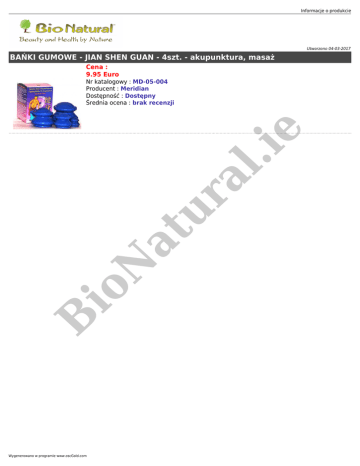 Informacje o produkcie Utworzono 04-03-2017 BAŃKI GUMOWE - JIAN SHEN GUAN - 4szt. - akupunktura, masaż Cena : 9.95 Euro B io N at ur al .ie Nr katalogowy : MD-05-004 Producent : Meridian Dostępność : Dostępny Średnia ocena : brak recenzji Wygenerowano w programie www.oscGold.com Bańki akupunkturowe stawia się w ściśle określonych punktach ciała w zależności od schorzenia. Według teoretycznych podstaw akupunktury energia życiowa Qi krąży w organizmie człowieka specjalnymi kanałami zwanymi meridianami. Działanie na meridiany w odpowiednich punktach ciała pobudza krążenie energii Qi i wyrównuje jej poziom. W ten sposób wpływa się na stan narządów wewnętrznych, przez które one przechodzą, przyśpieszając proces powrotu do zdrowia i pozbycia się dolegliwości. Zasada działania baniek polega na wywołaniu efektu zasysania, wskutek czego skóra pod bańką jest wciągana do jej środka. Celem tego procesu jest zainicjowanie silniejszego przepływu krwi i płynów ustrojowych w miejscu, które znajduje się bezpośrednio pod bańką. Przystawianie baniek w ściśle określonych punktach na meridianach powoduje przyśpieszenie krążenia, co inicjuje proces oczyszczania się organizmu ze wszystkich toksyn zarówno przyjętych z pokarmem, jak i powstałych w wyniku wadliwej przemiany materii oraz wytwarzanych przez niszczące organizm bakterie i wirusy. Ostatnio prócz swojego tradycyjnego zastosowania bańki gumowe z powodzeniem używane są również do zwalczania cellulitu. Trzeba przyznać, że jest to najtańsza i najbardziej efektywna metoda. Stąd też gumowe bańki cieszą się coraz większym zainteresowaniem nie tylko gabinetów kosmetycznych ale i Pań stosujących masaż bańkami we własnym zakresie. ur al .ie Zalety gumowych baniek akupunkturowych - zastosowanie elastycznego tworzywa umożliwia przystawianie ich w dowolnym miejscu bez względu na kształt powierzchni ciała (również na stawach), - są łatwe w użyciu; można je przystawiać samemu w dowolnie położonych punktach ciała (nawet na plecach); można regulować ciśnienie zasysania w zależności od stopnia ściśnięcia bańki; - przystawianie baniek nie ogranicza możliwości poruszania się, można je np. stosować w pracy, na spacerze, prowadząc samochód, - są lekkie, nie tłukące, odporne na uderzenia, zgniecenia, co umożliwia stosowanie ich nie tylko w warunkach domowych, ale i podczas wyjazdów turystycznych, - charakteryzują się bardzo dużą trwałością materiału zapewniając wieloletnie stosowanie, - są łatwe do utrzymania w czystości - myje się je wodą i mydłem, - w zestawie znajdują się cztery bańki o różnej wielkości, co pozwala na efektywne stosowanie ich na różnych częściach ciała oraz do leczenia dzieci. Stawianie baniek B io N at Bańki stawiane są na powierzchni skóry w punktach akupunkturowych zaznaczonych na rysunkach (patrz: następna zakładka). Dla każdej z chorób znajduje się po kilka takich punktów. Bańki stawia się na wszystkich punktach symetrycznie po obu stronach ciała. W zestawie znajdują się tylko 4 bańki, dlatego też przystawia się je kolejno w podanych punktach lub stosuje się kilka zestawów baniek. Aby przystawić bańkę, należy ją chwycić oburącz trzymając palcami wskazującymi i środkowymi za dolną krawędź bańki, natomiast kciukami naciskając jej szczyt. Ściskając bańkę w ten sposób wyciska się powietrze z jej wnętrza. Następnie lekko przyciskając do wybranego miejsca na ciele należy cofnąć palce z krawędzi bańki i zwolnić nacisk kciuków. W zależności od stopnia ściśnięcia uzyskuje się wyższe lub niższe ciśnienie zasysania. Wyższe ciśnienie zasysania stosuje się u dorosłych i na miejscach dobrze umięśnionych; niższe ciśnienie natomiast u dzieci oraz miejscach słabo umięśnionych i wrażliwych np. skronie, twarz. Duże bańki stawia się na stawach i powierzchniach silnie umięśnionych; mniejsze w punktach wrażliwych oraz u dzieci. Aby usunąć bańkę należy lekko nacisnąć skórę przy jej krawędzi i wpuścić do niej powietrze. W przypadku wątpliwości dotyczących precyzyjnej lokalizacji punktu można przystawić bańkę pokrywającą większą powierzchnię ciała. Bańki można stawiać co drugi dzień na 15 - 20 minut. Przebieg kuracji obejmuje do 10 zabiegów w jednej serii. Przy schorzeniach przewlekłych stosuje się siedmiodniowe przerwy pomiędzy seriami. W tym czasie można przeprowadzić kurację innej choroby działając na inne punkty akupunkturowe. Masaż bańką W przypadku przeziębień oraz grypy i innych infekcji stosuję się masaż pleców bańką. Przed przystąpieniem do zabiegu należy całą powierzchnię masowaną posmarować oliwką. Następnie przystawia się bańkę w okolicy ramienia np. lewego i przesuwa się ją raz przy razie z góry na dół i z dołu do góry masując całą okolicę pleców. Dla osób dorosłych stosuje się bańkę największą w zestawie, dla dzieci bańki odpowiednio mniejsze w zależności od wieku dziecka. Przy dolegliwościach mięśniowych innych części ciała masuje się bolące miejsca w ten sam sposób. Przeciwwskazania - nie stosować baniek przy zaburzeniach krzepliwości krwi - w przypadku wylewów podskórnych i obrzęków spowodowanych stłuczeniem lub skręceniem nie stosować baniek przed upływem 24 godzin od urazu - nie stosować na uszkodzoną skórę a w szczególności na otwarte rany. - u kobiet w ciąży nie stawiać dużych baniek na brzuchu i nie stosować wysokiego ciśnienia zasysania - u osób bardzo wychudzonych i u małych dzieci nie stosować baniek w okolicach łopatek, kręgosłupa, sutków, koniuszka serca, żołądka oraz jamy brzusznej. Przechowywanie baniek Bańki należy przechowywać czyste w suchym miejscu w temperaturze pokojowej z dala od grzejników, unikać ekspozycji słonecznych. B io N at ur al .ie Informacje o produkcie Wygenerowano w programie www.