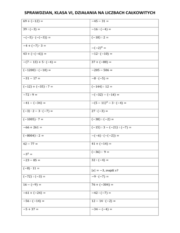 SPRAWDZIAN, KLASA VI, DZIAŁANIA NA LICZBACH CAŁKOWITYCH