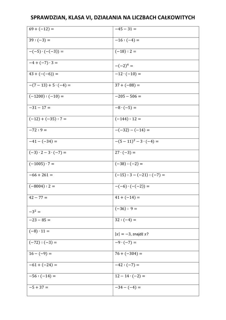 SPRAWDZIAN, KLASA VI, DZIAŁANIA NA LICZBACH CAŁKOWITYCH 69 + (−12) = −45 − 31 = 39 ∶ (−3) = −16 ∶ (−4) = −(−5) ∙ (−(−3)) = (−18) ∶ 2 = −4 + (−7) ∙ 3 = −(−2)4 = 43 + (−(−6)) = −12 ∙ (−10) = −(7 − 13) + 5 ∙ (−4) = 37 + (−88) = (−1200) ∶ (−10) = −205 − 506 = −31 − 17 = −8 ∙ (−5) = (−12) + (−35) ∶ 7 = (−144) ∶ 12 = −72 ∶ 9 = −(−32) − (−14) = −41 − (−34) = −(5 − 11)2 − 3 ∙ (−4) = (−3) ∙ 2 − 3 ∙ (−7) = 27 ∙ (−3) = (−1005) ∙ 7 = (−38) ∶ (−2) = −66 + 261 = (−15) ∶ 3 − (−21) ∶ (−7) = (−8004) ∶ 2 = −(−6) ∙ (−(−2)) = 42 − 77 = 41 + (−14) = −32 = −23 − 85 = (−8) ∙ 11 = (−36) ∶ 9 = 32 ∶ (−4) = |𝑥| = −3, znajdź 𝑥? (−72) ∶ (−3) = −9 ∙ (−7) = 16 − (−9) = 76 + (−304) = −61 + (−24) = −42 ∶ (−7) = −56 ∶ (−14) = 12 − 14 ∙ (−2) = −5 + 37 = −34 − (−4) = −31 + (−6) = (−11) + 19 = −41 ∙ (−2) = 41 − 69 = −(−12) + 18 = 28 ∶ (−(−4)) = (−35) ∶ 7 = 79 − (−19) = |1234| = (−10) ∙ (−10) = 63 ∙ (−3) = (−72) ∶ (−8) = (−16) ∙ 2 = −61 + 342 = (−12) − 15 = (−7) ∙ (−8) = 6 ∶ (−1) = −(−21) + (−21) = −305 + 606 = −143 ∶ (−13) = 29 − (−(−5)) = 13 ∙ (−(−4)) = (−34) ∙ 3 = −81 − (−22) = |−11| = −54 ∶ (−2) = 65 − 113 = −10 + (−10) ∙ 5 = 22 + (−9) = −56 − 285 = 23 ∙ (−5) = |𝑥| = 2, znajdź 𝑥? −17 − (−10) ∙ (−3) = 90 ∶ (−3) = −97 + 41 = −24 − 67 = (−45) ∶ (−3) − 24 ∶ (−8) = 4 ∙ (−7) = −42 + 49 = −7 − 27 = |𝑥 − 2| = 5, znajdź 𝑥? (−38) ∙ (−2) = 61 − 342 = −7 − (−7) ∙ (−15) ∙ 0 ∙ (−13) + (−21) = −(−17) + 13 = −57 ∙ 2 = −7 ∙ (−7) = −37 + 23 = −|15| = (−7)2 = −27 + 57 = −71 − (−52) = SPRAWDZIAN, KLASA VI, DZIAŁANIA NA LICZBACH CAŁKOWITYCH −54 ∶ (−2) = −305 + 606 = (−35) ∶ 7 = −7 − 27 = (−34) ∙ 3 = −(−17) + 13 = |1234| = −41 ∙ (−2) = −71 − (−52) = −37 + 23 = (−7) ∙ (−8) = −24 − 67 = −7 ∙ (−7) = −27 + 57 = −143 ∶ (−13) = −17 − (−10) ∙ (−3) = 29 − (−(−5)) = −31 + (−6) = −(−21) + (−21) = −42 + 49 = (−38) ∙ (−2) = −56 − 285 = 61 − 342 = −57 ∙ 2 = (−12) − 15 = 65 − 113 = |𝑥| = 2, znajdź 𝑥? 22 + (−9) = 28 ∶ (−(−4)) = 23 ∙ (−5) = (−11) + 19 = −10 + (−10) ∙ 5 = −97 + 41 = |𝑥 − 2| = 5, znajdź 𝑥? 90 ∶ (−3) = −|15| = −7 − (−7) ∙ (−15) ∙ 0 ∙ (−13) + (−21) = 6 ∶ (−1) = −61 + 342 = −81 − (−22) = −(−12) + 18 = 79 − (−19) = (−72) ∶ (−8) = (−45) ∶ (−3) − 24 ∶ (−8) = 63 ∙ (−3) = |−11| = (−16) ∙ 2 = (−7)2 = −(−2)4 = (−36) ∶ 9 = (−18) ∶ 2 = −31 − 17 = −32 = |𝑥| = −3, znajdź 𝑥? (−8004) ∶ 2 = (−12) + (−35) ∶ 7 = −(−32) − (−14) = −41 − (−34) = 4 ∙ (−7) = −16 ∶ (−4) = −(7 − 13) + 5 ∙ (−4) = −56 ∶ (−14) = (−72) ∶ (−3) = −23 − 85 = 16 − (−9) = −12 ∙ (−10) = 41 + (−14) = 37 + (−88) = 27 ∙ (−3) = −34 − (−4) = 32 ∶ (−4) = −8 ∙ (−5) = −66 + 261 = −(5 − 11)2 − 3 ∙ (−4) = 13 ∙ (−(−4)) = (−1005) ∙ 7 = 69 + (−12) = −4 + (−7) ∙ 3 = −205 − 506 = −61 + (−24) = −(−5) ∙ (−(−3)) = −9 ∙ (−7) = 76 + (−304) = −5 + 37 = (−38) ∶ (−2) = (−8) ∙ 11 = (−3) ∙ 2 − 3 ∙ (−7) = (−1200) ∶ (−10) = −72 ∶ 9 = −(−6) ∙ (−(−2)) = 41 − 69 = 42 − 77 = −45 − 31 = (−10) ∙ (−10) = (−15) ∶ 3 − (−21) ∶ (−7) = 39 ∶ (−3) = 12 − 14 ∙ (−2) = −42 ∶ (−7) = 43 + (−(−6)) = (−144) ∶ 12 =