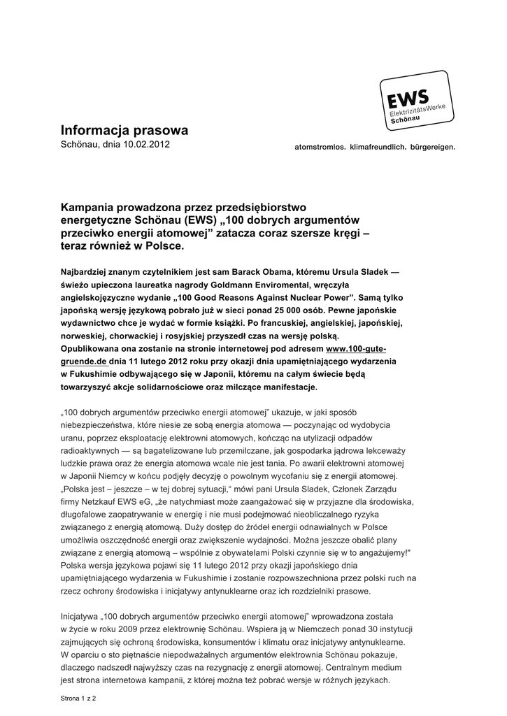 Informacja prasowa Schönau, dnia 10.02.2012 Kampania prowadzona przez przedsiębiorstwo energetyczne Schönau (EWS) „100 dobrych argumentów przeciwko energii atomowej” zatacza coraz szersze kręgi – teraz również w Polsce. Najbardziej znanym czytelnikiem jest sam Barack Obama, któremu Ursula Sladek — świeżo upieczona laureatka nagrody Goldmann Enviromental, wręczyła angielskojęzyczne wydanie „100 Good Reasons Against Nuclear Power”. Samą tylko japońską wersję językową pobrało już w sieci ponad 25 000 osób. Pewne japońskie wydawnictwo chce je wydać w formie książki. Po francuskiej, angielskiej, japońskiej, norweskiej, chorwackiej i rosyjskiej przyszedł czas na wersję polską. Opublikowana ona zostanie na stronie internetowej pod adresem www.100-gutegruende.de dnia 11 lutego 2012 roku przy okazji dnia upamiętniającego wydarzenia w Fukushimie odbywającego się w Japonii, któremu na całym świecie będą towarzyszyć akcje solidarnościowe oraz milczące manifestacje. „100 dobrych argumentów przeciwko energii atomowej” ukazuje, w jaki sposób niebezpieczeństwa, które niesie ze sobą energia atomowa — poczynając od wydobycia uranu, poprzez eksploatację elektrowni atomowych, kończąc na utylizacji odpadów radioaktywnych — są bagatelizowane lub przemilczane, jak gospodarka jądrowa lekceważy ludzkie prawa oraz że energia atomowa wcale nie jest tania. Po awarii elektrowni atomowej w Japonii Niemcy w końcu podjęły decyzję o powolnym wycofaniu się z energii atomowej. „Polska jest – jeszcze – w tej dobrej sytuacji,“ mówi pani Ursula Sladek, Członek Zarządu firmy Netzkauf EWS eG, „że natychmiast może zaangażować się w przyjazne dla środowiska, długofalowe zaopatrywanie w energię i nie musi podejmować nieobliczalnego ryzyka związanego z energią atomową. Duży dostęp do źródeł energii odnawialnych w Polsce umożliwia oszczędność energii oraz zwiększenie wydajności. Można jeszcze obalić plany związane z energią atomową – wspólnie z obywatelami Polski czynnie się w to angażujemy!" Polska wersja językowa pojawi się 11 lutego 2012 przy okazji japońskiego dnia upamiętniającego wydarzenia w Fukushimie i zostanie rozpowszechniona przez polski ruch na rzecz ochrony środowiska i inicjatywy antynuklearne oraz ich rozdzielniki prasowe. Inicjatywa „100 dobrych argumentów przeciwko energii atomowej” wprowadzona została w życie w roku 2009 przez elektrownię Schönau. Wspiera ją w Niemczech ponad 30 instytucji zajmujących się ochroną środowiska, konsumentów i klimatu oraz inicjatywy antynuklearne. W oparciu o sto piętnaście niepodważalnych argumentów elektrownia Schönau pokazuje, dlaczego nadszedł najwyższy czas na rezygnację z energii atomowej. Centralnym medium jest strona internetowa kampanii, z której można też pobrać wersje w różnych językach. Strona 1 z 2 Oprócz zwięzłych, jasnych argumentów przeciwko energii atomowej na stronie internetowej znajdują się również pocztówki elektroniczne, interaktywny trening argumentacji, pies tropiący znajomość argumentów oraz wiele innych materiałów do pogłębiania wiedzy na temat energii atomowej. Wydana do dziś w nakładzie 95 000 sztuk kieszonkowa wersja „100 dobrych argumentów” jest niezbitym kompendium wiedzy, która stanowi podstawę argumentacji w środowiskach antynuklearnych i zaangażowanych w ochronę środowiska. „Plakat 100 dobrych argumentów” typu „zrób to sam” pobrano już 40 000 razy. Od roku 2011 „100 dobrych argumentów przeciwko energii atomowej” dostępne jest też jako aplikacja dla użytkowników iPhone'ów i iPad'ów. Elektrownia Schönau dostarcza ekologiczny prąd 125 000 klientów na terenie całych Niemiec. Dzisiejsze przedsiębiorstwo energetyczne ma swój początek w inicjatywie zaangażowanych obywateli, która powstała po katastrofie w Czarnobylu. Obywatelskie przedsięwzięcie należy dziś w 100% do Netzkauf EWS eG, gdzie konsekwentnie dąży się do przejścia na odnawialne źródła energii i angażuje w oszczędzanie i wydajność energetyczną. Kontakt: Elektrizitätswerke Schönau Vertriebs GmbH Ursula Sladek Telefon: +49 7673 - 888 550 Adres e-mail: [email protected] Strona internetowa: http://www.ews-schoenau.de Strona internetowa kampanii EWS „100 dobrych argumentów” www.100-gute-gruende.de http://100-gute-gruende.de/pdf/g100rs_pl.pdf „Nie dla energii atomowej – 100 dobrych argumentów” jako aplikacja do iPhone'a i iPad'a http://itunes.apple.com/app/anti-atom-wrack-ab-100-gute/id427246102?mt=8 Informacje dotyczące krajowej milczącej manifestacji z okazji dnia upamiętniającego wydarzenia w Fukushimie http://www.ausgestrahlt.de/mitmachen/fukushima-jahrestag/mahnwachen-112.html Fotografia prasowa Poniższa fotografia w wersji przeznaczonej do druku znajduje się na stronie internetowej: http://www.ews-schoenau.de/ews/pressemitteilung.html Inne fotografie prasowe dotyczące kampanii znajdują się na stronie internetowej: https://100-gute-gruende.de/meta/presse.xhtml Ursula Sladek, Członek Zarządu Netzkauf EWS eG wręcza Barackowi Obamie »100 Good Reasons Against Nuclear Power« Strona 2 z 2