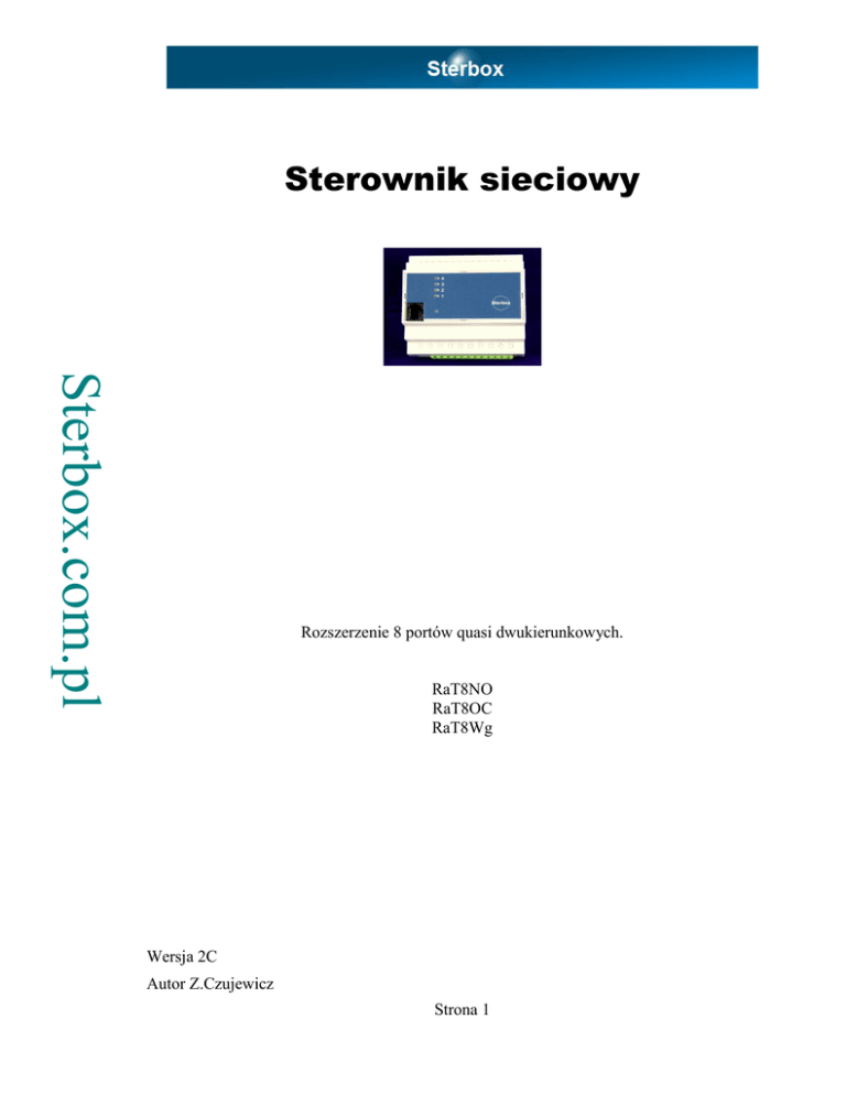 Sterownik sieciowy Sterbox.com.pl Rozszerzenie 8 portów quasi dwukierunkowych. RaT8NO RaT8OC RaT8Wg Wersja 2C Autor Z.Czujewicz Strona 1 Spis treści 1. Na skróty.............................................................................................................................3 2. Wersje modułów dodatkowych portów cyfrowych............................................................3 3. Ustawienie adresu modułu..................................................................................................3 4. Sposób podłączenia.............................................................................................................4 5. Jak użyć?.............................................................................................................................5 Sterbox.com.pl Strona 2 Instrukcja dotyczy modułu dodatkowych portów cyfrowych do Sterbox. Na wstępie należy zaznaczyć są to porty quasi dwukierunkowe, czyli mogą być użyte jako wejścia lub wyjścia. 1. Na skróty. 1. Wyłącz zasilanie sterownika Sterbox. 2. W module RaT ustaw adres przy pomocy zwory. Zobacz jak ustawić zworę w punkcie 2 niniejszej instrukcji. 3. W obudowie sterownika Sterbox, z lewej strony jest gniazdo 4 stykowe do dodatkowych akcesorii. Takie samo gniazdo jest w module. 4. Użyj przewodu aby połączyć masę Sterboxa i modułu RaT, oznaczone w złączach literą G. 5. Połącz powyższe gniazda kołkami stykowymi, zsuwając urządzenia do siebie. 6. Włącz zasilanie. Porty w module otrzymują nazwy od ww8 do wwF, dla modułu pierwszego i wwG do wwN dla modułu drugiego. Sterbox.com.pl 2. Wersje modułów dodatkowych portów cyfrowych. Możliwe są następujące wersje urządzenia. Poniższe oznaczenia dla modułu w obudowie na szynę TS35. Oznaczenie Wejścia Wyjścia RaT8Wg 8 Wejść z galwanicznie połączoną masą. Brak RaT8OC1 8 Wejść z galwanicznie połączoną masą. 8 Wyjść typu open collector (OC) 200mA 12VDC. RaT8NO2 8 Wejść z galwanicznie połączoną masą. 8 Wyjść typu open collector (OC) 200mA 12VDC i 8 wyjść przekaźnikowych o stykach normalnie otwartych – NO.3 3. Ustawienie adresu modułu. Zworka Z1 (umieszczenie zwory pokazane jest na rysunku niżej) powinna dla wejść o nazwach ww8 do wwF pozostać zwarta. Dla drugiego modułu RaT należy ją zdjąć, wtedy moduł będzie obsługiwał porty od wwG do wwN. Widok od strony złącza 16 stykowego TBMF3816R. Zwora Z1 pierwsza od lewej. 1 Wejścia i wyjścia korzystają z tych samych końcówek. Oznacza to że można je wykorzystać jako wejście lub jako wyjście → zależnie od ustawień! 2 Jak wyżej. 3 Nie oznacza to 16 wyjść, tylko to że wyprowadzone są wyjścia kolektora tranzystora który steruje cewką przekaźnika. Strona 3 4. Sposób podłączenia. R7 R6 R5 R4 R3 R2 R1 R0 Sterbox.com.pl U góry na złączu 16 stykowym TBMF3816R wyprowadzone wejścia i wyjścia OC. Gniazda „zas” nie są montowane. Podłączenie masy i zasilania +12V ze sterownika. Zworka Z1 słuzy do adresowania modułu. Dla zakresu ww8 do wwF powinna być zwarta. U dołu podłączone zestyki przekaźników o parametrach 4A/ 230V. Proszę zwrócic uwagę na pogrupowanie przekaźników po dwie sztuki i wyprowadzenie jednej strony końcówek zestyków grupy przekaźników na wspólny styk gniazda TBMF5112R. Proszę przy zamówieniach pamiętać o zamówieniu wtyków TBMF3816R i ewentualnie TBMF5112R. Powyższy rysunek pokazuje podłączenia dla wersji RaTNO. Gdy posiadamy moduł tylko z wejściami (RaT8Wg) lub z wyjściami OC: RaT8OC montowane jest jest złącze do wtyku TBMF3816R, brak złącza 12 stykowego. Nr Nazwa Pełniona rola styku 3 G Masa zasilania, należy połączyć z masą zasilania i masą (G) sterownika Sterbox (również z masą następnego modułu RaT (o ile jest). 4 +Z Zasilanie modułu RaT. Można lecz nie ma konieczności podłączania przewodem. Zasilanie prowadzone jest złączem czterostykowym z boku urządzeń. 5 R7 W module o ustawionym adresie 1 port → wwF, adresie 2 port → wwN. 6 R6 W module o ustawionym adresie 1 port → wwE, adresie 2 port → wwM. 7 R5 W module o ustawionym adresie 1 port → wwD, adresie 2 port → wwL. 8 R4 W module o ustawionym adresie 1 port → wwC, adresie 2 port → wwK. 9 G Tak jak dla złącza o numerze 4. Wewnątrz urządzenia oba styki są galwanicznie połączone. Strona 4 10 R3 W module o ustawionym adresie 1 port → wwB, adresie 2 port → wwJ. 11 R2 W module o ustawionym adresie 1 port → wwA, adresie 2 port → wwI. 12 R1 W module o ustawionym adresie 1 port → ww9, adresie 2 port → wwH. 13 R0 W module o ustawionym adresie 1 port → ww8, adresie 2 port → wwG. 5. Jak użyć? W celu podłączenia modułu do sterownika, należy wyłączyć zasilanie. UWAGA: gorąco zalecamy wyłączanie zasilacza urządzenia przed wyjęciem lub włożeniem wtyków! Po włożeniu wtyku do gniazda sprawdzamy jego prawidłowe włożenie i dopiero wtedy włączamy zasilanie. Oczywiście przewody podłączamy również przy całkowicie wyłączonym zasilaniu! Po lewej stronie sterownika znajduje się gniazdo które łączymy z gniazdem modułu kołkami stykowymi (w komplecie). Urządzenia zsuwamy ze sobą. Włączamy zasilanie. Porty modułu przyjmują nazwy od ww8 do wwF dla modułu 1 i wwG do wwN dla modułu 2. Pamiętajmy o tym że jest to moduł o 8 portach. Są to porty które zasadniczo można wykorzystać jako wejścia lub jako wyjścia. Sposób podłączania do portów wyjaśniony jest w instrukcji „Sterbox” opisującej sterownik. Moduł posiada ze swojej lewej strony złącze analogiczne jak po prawej. Służy ono do podłączania następnych modułów rozszerzających. Moduł nie posiada sygnalizacji świetlnej stanu wyjść. Parametry: 1 Zasilanie 12VDC realizowane ze sterownika. Pobierany prąd do 300mA. 2 Wejścia galwaniczne (8Wg) wewnętrznie podciągane do +12V. Przeznaczone do zestyków podłączonych do masy, wyjść typu OC lub wyjś