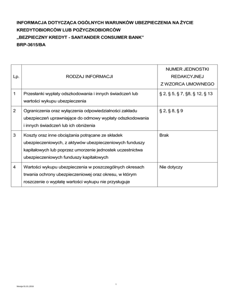 INFORMACJA DOTYCZĄCA OGÓLNYCH WARUNKÓW UBEZPIECZENIA NA ŻYCIE KREDYTOBIORCÓW LUB POŻYCZKOBIORCÓW „BEZPIECZNY KREDYT - SANTANDER CONSUMER BANK” BRP-3615/BA NUMER JEDNOSTKI Lp. RODZAJ INFORMACJI REDAKCYJNEJ Z WZORCA UMOWNEGO 1 Przesłanki wypłaty odszkodowania i innych świadczeń lub § 2, § 5, § 7, §8, § 12, § 13 wartości wykupu ubezpieczenia 2 Ograniczenia oraz wyłączenia odpowiedzialności zakładu § 2, § 8, § 9 ubezpieczeń uprawniające do odmowy wypłaty odszkodowania i innych świadczeń lub ich obniżenia 3 Koszty oraz inne obciążania potrącane ze składek Brak ubezpieczeniowych, z aktywów ubezpieczeniowych funduszy kapitałowych lub poprzez umorzenie jednostek uczestnictwa ubezpieczeniowych funduszy kapitałowych 4 Wartości wykupu ubezpieczenia w poszczególnych okresach trwania ochrony ubezpieczeniowej oraz okresu, w którym roszczenie o wypłatę wartości wykupu nie przysługuje Wersja 01.01.2016 1 Nie dotyczy OGÓLNE WARUNKI UBEZPIECZENIA NA ŻYCIE KREDYTOBIORCÓW LUB POŻYCZKOBIORCÓW „BEZPIECZNY KREDYT - SANTANDER CONSUMER BANK” BRP-3615/BA § 1. POSTANOWIENIA OGÓLNE 1. Niniejsze ogólne warunki ubezpieczenia na życie Kredytobiorców lub Pożyczkobiorców „Bezpieczny Kredyt - Santander Consumer Bank” o symbolu BRP-3615/BA (zwane dalej: OWU) stanowią integralną część Umowy ubezpieczenia zawartej pomiędzy Compensa Towarzystwo Ubezpieczeń na Życie Spółka Akcyjna Vienna Insurance Group (zwaną dalej: COMPENSA) z siedzibą w Warszawie, 02-342, Al. Jerozolimskie 162, a Santander Consumer Bank Spółka Akcyjna z siedzibą we Wrocławiu, ul. Strzegomska 42c (zwanym dalej: Ubezpieczającym), zwanymi łącznie Stronami, na podstawie których COMPENSA będzie udzielać ochrony ubezpieczeniowej wskazanym przez Ubezpieczającego Kredytobiorcom lub Pożyczkobiorcom. 2. Wszelkie postanowienia odmienne od treści OWU, pod rygorem nieważności, muszą być sporządzone na piśmie i dołączone do Umowy ubezpieczenia, jako jej integralna część. § 2. DEFINICJE Pojęcia użyte w OWU, Wniosku o przystąpienie do umowy ubezpieczenia, Ankiecie medycznej i innych dokumentach związanych z Umową ubezpieczenia oznaczają: 1) Ubezpieczony – Kredytobiorca lub Pożyczkobiorca, którego życie lub zdrowie jest przedmiotem ubezpieczenia. 2) Współubezpieczony – Kredytobiorca lub Pożyczkobiorca, którego życie lub zdrowie jest przedmiotem ubezpieczenia, zawierający wspólnie z Ubezpieczonym Umowę kredytu / pożyczki. 3) Kredytobiorca – osoba fizyczna w wieku 18 – 67 lat, posiadająca stałe zameldowanie na terenie Rzeczpospolitej Polskiej, która zawarła z Ubezpieczającym umowę kredytu. 4) Pożyczkobiorca – osoba fizyczna w wieku 18 – 67 lat, posiadająca stałe zameldowanie na terenie Rzeczpospolitej Polskiej, która zawarła z Ubezpieczającym umowę pożyczki. 5) Umowa kredytu / pożyczki – umowa zawarta pomiędzy Ubezpieczającym a Kredytobiorcą / Pożyczkobiorcą, której przedmiotem jest udzielenie kredytu / pożyczki i zgodnie z którą Pojazd samochodowy stanowi przedmiot zabezpieczenia spłaty kredytu / pożyczki. 6) Pojazd samochodowy – pojazd podlegający rejestracji i homologowany jako samochód osobowy, ciężarowy, ciężarowo-osobowy, lub za zgodą Ubezpieczającego – inny pojazd, o dopuszczalnej masie całkowitej nie przekraczającej 6,5 tony, a także podlegający rejestracji jako motocykl, quad lub motorower, który stanowi przedmiot kredytowania lub przedmiot zabezpieczenia spłaty udzielonego przez Ubezpieczającego kredytu / pożyczki. 7) Uposażony główny – osoba wyznaczona przez Ubezpieczonego, a w przypadku, gdy w danej Umowie kredytu/pożyczki występuje także Współubezpieczony również osobno przez Współubezpieczonego jako uprawniona do otrzymania świadczenia: z tytułu Ubezpieczenia podstawowego w przypadku, gdy Zdarzenie ubezpieczeniowe zaszło w okresie obowiązywania Umowy kredytu / pożyczki, nie później jednak niż do dnia wymagalności ostatniej Raty kredytu / pożyczki zgodnie z Harmonogramem spłaty rat. 8) Uposażony zastępczy – osoba wyznaczona przez Ubezpieczonego, a w przypadku, gdy w danej Umowie kredytu/pożyczki występuje także Współubezpieczony również osobno przez Współubezpieczonego jako uprawniona do otrzymania świadczenia: a) b) z tytułu Ubezpieczenia dodatkowego Kredytobiorców / Pożyczkobiorców na wypadek śmierci w następstwie Wypadku komunikacyjnego lub z tytułu Ubezpieczenia dodatkowego Kredytobiorców / Pożyczkobiorców na wypadek śmierci w następstwie Nieszczęśliwego wypadku w przypadku, gdy Zdarzenie ubezpieczeniowe zaszło w okresie obowiązywania Umowy kredytu / pożyczki, nie później jednak niż do dnia wymagalności ostatniej Raty kredytu / pożyczki wynikającej z Harmonogramu spłaty rat, z tytułu Ubezpieczenia podstawowego oraz z tytułu Ubezpieczenia dodatkowego Kredytobiorców / Pożyczkobiorców na wypadek śmierci w następstwie Wypadku komunikacyjnego lub z tytułu Ubezpieczenia dodatkowego Kredytobiorców / Pożyczkobiorców na wypadek śmierci w następstwie Nieszczęśliwego wypadku, gdy Zdarzenie ubezpieczeniowe zaszło po rozwiązaniu Umowy kredytu / pożyczki z tytułu spłaty kredytu / pożyczki, o ile rozwiązanie to nastąpiło przed dniem wymagalności ostatniej Raty kredytu / pożyczki wynikającej z Harmonogramu spłaty rat. 9) Akt terroryzmu – planowane i zorganizowane działanie pojedynczych osób lub grup skutkujące naruszeniem istniejącego porządku prawnego, podjęte w celu zastraszenia bądź wymuszenia określonych zachowań lub świadczeń od władz państwowych i społeczeństwa, często naruszające lub zagrażające ludzkiemu życiu, zdrowiu lub mieniu. 10) Harmonogram spłat rat kredytu / pożyczki lub Harmonogram spłat rat – dokument stanowiący integralną część Umowy kredytu / pożyczki, obowiązujący w dniu przystąpienia Kredytobiorcy / Pożyczkobiorcy do Umowy ubezpieczenia, w któr