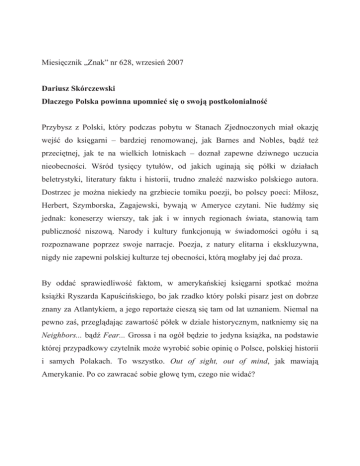 Miesięcznik „Znak” nr 628, wrzesień 2007 Dariusz Skórczewski Dlaczego Polska powinna upomnieć się o swoją postkolonialność Przybysz z Polski, który podczas pobytu w Stanach Zjednoczonych miał okazję wejść do księgarni – bardziej renomowanej, jak Barnes and Nobles, bądź też przeciętnej, jak te na wielkich lotniskach – doznał zapewne dziwnego uczucia nieobecności. Wśród tysięcy tytułów, od jakich uginają się półki w działach beletrystyki, literatury faktu i historii, trudno znaleźć nazwisko polskiego autora. Dostrzec je można niekiedy na grzbiecie tomiku poezji, bo polscy poeci: Miłosz, Herbert, Szymborska, Zagajewski, bywają w Ameryce czytani. Nie łudźmy się jednak: koneserzy wierszy, tak jak i w innych regionach świata, stanowią tam publiczność niszową. Narody i kultury funkcjonują w świadomości ogółu i są rozpoznawane poprzez swoje narracje. Poezja, z natury elitarna i ekskluzywna, nigdy nie zapewni polskiej kulturze tej obecności, którą mogłaby jej dać proza. By oddać sprawiedliwość faktom, w amerykańskiej księgarni spotkać można książki Ryszarda Kapuścińskiego, bo jak rzadko który polski pisarz jest on dobrze znany za Atlantykiem, a jego reportaże cieszą się tam od lat uznaniem. Niemal na pewno zaś, przeglądając zawartość półek w dziale historycznym, natkniemy się na Neighbors... bądź Fear... Grossa i na ogół będzie to jedyna książka, na podstawie której przypadkowy czytelnik może wyrobić sobie opinię o Polsce, polskiej historii i samych Polakach. To wszystko. Out of sight, out of mind, jak mawiają Amerykanie. Po co zawracać sobie głowę tym, czego nie widać? Nieobecność tego rodzaju jest w skali świata tożsama z nieistnieniem, co dotkliwie odczuwają ci, którzy się z daną kulturą utożsamiają. Uderzanie w nutę ubolewania nad sobą niczego jednak nie zmieni. Przeciwnie, wśród amerykańskich elit akademickich postawa taka natychmiast kojarzona bywa z utrwalonym od kilku pokoleń stereotypem polskiego emigranta-outsidera, który odmawia uczestnictwa w dyskursie wybranego przez siebie za docelowe społeczeństwa. Emigrant taki nosi w sobie resentyment do świata za brak zrozumienia dla polskich tradycji i polskiej martyrologii i, na domiar złego, tęskni za Polską „od morza do morza”, lekceważąc racje geopolityki. Nie miejsce tu na analizę przyczyn wzajemnego niezrozumienia kultury polskiej i amerykańskiej, znakomicie sportretowanego przez Janusza Głowackiego w Polowaniu nakaraluchy. Może powstanie kiedyś na jednym z amerykańskich uniwersytetów praca, która opisze paradoksalny fenomen amerykańskiej dyskryminacji w stosunku do przybyszów z Polski – i nie tylko Polski, lecz także innych krajów Europy Środkowowschodniej. Mówię o przyszłości, bo w atmosferze, jaka panuje obecnie na wyższych uczelniach od Berkeley po Columbię, trudno sobie takie studium wyobrazić. Co zatem można zrobić, by polska literatura przedostała się na rynek amerykański i zajęła na nim trwałą pozycję, choćby w niewielkim stopniu zbliżoną do tej, jaką cieszy się literatura karaibska, południowoafrykańska, literatury krajów Azji Południowowschodniej, Afryki Północnej i Środkowej, Indii, Pakistanu czy Australii? Może ktoś obruszy się na takie zestawienie, uznając je za niestosowne, zważywszy na różnice historyczne, kulturowe itd. A jednak nie jest ono przypadkowe. Na pamięć przychodzą frazy wiersza Miłosza Rue Descartes: Mijając ulicę Descartes Schodziłem ku Sekwanie, młody barbarzyńca w podróży Onieśmielony przybyciem do stolicy świata. Było nas wielu, z Jass i Koloszwaru, Wilna i Bukaresztu, Sajgonu i Marakesz, Wstydliwie pamiętających domowe zwyczaje O których nie należało mówić tu nikomu (…) Miłosz zawarł tu jedno z kluczowych doświadczeń ludzkości w minionym stuleciu. Onieśmielenie, jakiego zaznał w jednej ze stolic zachodniego świata, porównać można z uczuciem „nieobecności” czy też „nieprzynależności”, znanym nam z wizyty w amerykańskiej księgarni. Oba wiążą się ze szczególną sytuacją, w jakiej znalazły się populacje przywołanych przez poetę miejsc – sytuacją skolonizowania. Miłosz bodaj pierwszy z polskich – a może i środkowoeuropejskich – pisarzy tak trafnie uchwycił rys, który definiuje tożsamość współczesnych społeczeństw zamieszkujących nasz region, a także inne obszary dzisiejszego świata. Czy polska literatura ma szansę przedostać się na globalizujący się rynek anglojęzyczny? Odpowiedź kryje się w kontekście, w jaki wpisuje się wiersz Miłosza. Spośród literatur terytoriów, o których mowa w Rue Descartes, jak dotąd tylko jedna stopniowo, lecz skutecznie toruje sobie drogę do światowej publiczności, i to właśnie dzięki krytyce postkolonialnej – literatura marokańska. Tahar Ben Jelloun, najwybitniejszy pisarz marokański i zarazem jeden z najlepiej znanych postkolonialnych pisarzy afrykańskich, uhonorowany został w 1987 roku prestiżową Nagrodą Goncourtów, a niedawno – irlandzką nagrodą literacką Impac. O tym, że te gesty uznania przekładają się na znajomość danej twórczości wśród czytelników poza granicami ojczystego kraju, nie trzeba nikogo przekonywać: najgłośniejsze utwory Jellouna przełożono także nad Wisłą. O postkolonialnym charakterze pozostałych literatur: polskiej, litewskiej, węgierskiej, by pozostać przy niektórych, mówi się jak dotąd niewiele, podobnie jak o postkolonialności tych społeczeństw. Powód? Powodów jest kilka i warto pokrótce o nich wspomnieć, nie tylko po to, by lepiej zdiagnozować obecną sytuację polskiej literatury i kultury w świecie, lecz przede wszystkim, by wskazać szansę wpłynięcia na status quo. Kraje byłego tzw. bloku wschodniego, z wyjątkiem sowieckiej i posowieckiej Rosji, nie miały dotąd szczęścia w zaznaczaniu swej obecności na globalnym rynku w