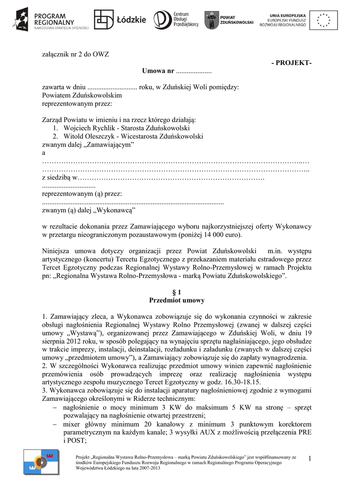 załącznik nr 2 do OWZ - PROJEKTUmowa nr .................... zawarta w dniu ............................ roku, w Zduńskiej Woli pomiędzy: Powiatem Zduńskowolskim reprezentowanym przez: Zarząd Powiatu w imieniu i na rzecz którego działają: 1. Wojciech Rychlik - Starosta Zduńskowolski 2. Witold Oleszczyk - Wicestarosta Zduńskowolski zwanym dalej „Zamawiającym” a ………………………………………………………………………………………………..… ………………………………………………………………………………………………….. z siedzibą w……………………………………………………………………. .............................. reprezentowanym (ą) przez: ...................................................................................................... zwanym (ą) dalej „Wykonawcą” w rezultacie dokonania przez Zamawiającego wyboru najkorzystniejszej oferty Wykonawcy w przetargu nieograniczonym pozaustawowym (poniżej 14 000 euro). Niniejsza umowa dotyczy organizacji przez Powiat Zduńskowolski m.in. występu artystycznego (koncertu) Tercetu Egzotycznego z przekazaniem materiału estradowego przez Tercet Egzotyczny podczas Regionalnej Wystawy Rolno-Przemysłowej w ramach Projektu pn: „Regionalna Wystawa Rolno-Przemysłowa - marką Powiatu Zduńskowolskiego”. §1 Przedmiot umowy 1. Zamawiający zleca, a Wykonawca zobowiązuje się do wykonania czynności w zakresie obsługi nagłośnienia Regionalnej Wystawy Rolno Przemysłowej (zwanej w dalszej części umowy „Wystawą”), organizowanej przez Zamawiającego w Zduńskiej Woli, w dniu 19 sierpnia 2012 roku, w sposób polegający na wynajęciu sprzętu nagłaśniającego, jego obsłudze w trakcie imprezy, instalacji, deinstalacji, rozładunku i załadunku (zwanych w dalszej części umowy „przedmiotem umowy”), a Zamawiający zobowiązuje się do zapłaty wynagrodzenia. 2. W szczególności Wykonawca realizując przedmiot umowy winien zapewnić nagłośnienie przemówienia osób prowadzących imprezę oraz realizację nagłośnienia występu artystycznego zespołu muzycznego Tercet Egzotyczny w godz. 16.30-18.15. 3. Wykonawca zobowiązuje się do instalacji aparatury nagłośnieniowej zgodnie z wymogami Zamawiającego określonymi w Riderze technicznym: nagłośnienie o mocy minimum 3 KW do maksimum 5 KW na stronę – sprzęt pozwalający na nagłośnienie otwartej przestrzeni; mixer główny minimum 20 kanałowy z minimum 3 punktowym korektorem parametrycznym na każdym kanale; 3 wysyłki AUX z możliwością przełączenia PRE i POST; Projekt „Regionalna Wystawa Rolno-Przemysłowa – marką Powiatu Zduńskowolskiego” jest współfinansowany ze środków Europejskiego Funduszu Rozwoju Regionalnego w ramach Regionalnego Programu Operacyjnego Województwa Łódzkiego na lata 2007-2013 1 niezbędne odtwarzacze MD i CD; mikrofony dynamiczne minimum klasy SM 58 w ilości minimum 8 sztuk; mikrofony bezprzewodowe minimum klasy SM 58 działające w paśmie UHF w ilości minimum 2 sztuki D-boxy w ilości minimum 3 sztuki; niezbędne procesory dynamiki typu: kompresory, bramki, procesory efektów wokalowych; system musi być wolny od przydźwięków i szumów; stanowisko realizatora powinno być ustawione w osi sceny. W czasie próby i występu Tercetu Egzotycznego o godz. 16.30 na scenie potrzebnych jest 8 mikrofonów wokalnych ustawionych w 2 liniach po 4 w każdej. W pierwszej linii minimum 1 mikrofon bezprzewodowy. Dodatkowo jeden mikrofon do nagłośnienia wzmacniacza basowego i linia z D- boxem do podłączenia gitary. Input Instrument Monitor 1 do 7 Mic X 8 Mic wir. X 9 Git X 10 Bas X 11 Talkback Mic. X 12 MD L X 13 MD R X 4. Teren wystawy (98-220 Zduńska Wola, ul. Dolna 41) będzie dostępny dla Wykonawcy od godz. 6.00 w dniu 19.08.2012 roku. System nagłośnieniowy musi być gotowy do użytkowania zgodnego z przeznaczeniem na godzinę 10.30 w dniu 19.08.2012 roku. Szacowany czas eksploatacji zgodnej z przeznaczeniem wynajętego od wykonawcy nagłośnienia to ok. 11 godzin, tj. do godz. ok. 21.30. §2 Sposób wykonywania przedmiotu umowy 1. Wykonawca oświadcza, że dysponuje sprzętem, posiada wiedzę, doświadczenie oraz umiejętności niezbędne do należytego wykonania umowy i zobowiązuje się wykonać przedmiot umowy z należytą starannością z uwzględnieniem obowiązujących przepisów prawa, standardów i reguł wykonywania czynności objętych niniejszą umową, a także dbając o interesy Zamawiającego. 2. Wykonawca nie może powierzyć wykonania zlecenia osobie trzeciej w całości lub w części bez zgody Zamawiającego. 3. Zamawiający umożliwi wykonanie Wykonawcy przedmiotu umowy określonego w §1, w szczególności poprzez: - zapewnienie przyłącza energetycznego, trójfazowego zgodnie z normami bezpieczeństwa; - zapewnienie sceny; - umożliwienie zlokalizowania stanowiska realizatora dźwięku na wprost sceny Projekt „Regionalna Wystawa Rolno-Przemysłowa – marką Powiatu Zduńskowolskiego” jest współfinansowany ze środków Europejskiego Funduszu Rozwoju Regionalnego w ramach Regionalnego Programu Operacyjnego Województwa Łódzkiego na lata 2007-2013 2 i zabezpieczenia go płotkami ochronnymi lub w inny sposób, uniemożliwiający bezpośrednie przebywanie przy stanowisku realizatora osób postronnych; - umożliwienie wjazdu samochodu o numerze rejestracyjnym ………………….. na teren imprezy od godz. 6.00 w dniu 19.08.2012 roku. §3 Miejsce wykonywania umowy 1. Strony postanawiają, iż Wykonawca wykona przedmiot umowy w Zduńskiej Woli (kod pocztowy: 98-220), na terenie Powiatowego Międzyszkolnego Ośrodka Sportowego przy ulicy Dolnej 41 w dniu 19 sierpnia 2012 roku w godzinach 06.00-21.30 2. Wykonawca z miejsca swojej siedziby do miejsca w którym wykona przedmiot umowy i z powrotem do miejsca swojej siedziby dotrze na własny koszt i ryzyko. Na własny koszt i ryzyko przetrans