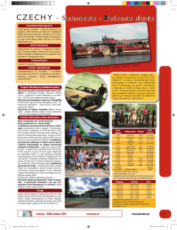 CZECHY - Szumawa - Żelezna Ruda Z A K WAT E R O WA N I E Hotel górski Belveder – pięknie położony na wzgórzu, 800 metrów od centrum miasteczka Żelezna Ruda w Czechach. Pokoje 2, 3, 4, 5 osobowe z łazienkami. Przed hotelem do dyspozycji gości plac zabaw, basen odkryty. W hotelu sala telewizyjna. WYŻYWIENIE Całodzienne (3 posiłki) w restauracji hotelowej. Pierwszy posiłek: obiad w dniu przyjazdu, ostatni posiłek: śniadanie w dniu wyjazdu oraz prowiant na drogę powrotną. TRANSPORT Autokar turystyczny. CENA OBEJMUJE Zakwaterowanie (9 noclegów, 7 noclegów w terminie OCOZ 01*), wyżywienie, transport, realizację programu, opiekę pedagogiczną, ubezpieczenie. ia ch y, N ie m cy , A us tr ze C : ur lt ku ch ze tr N a st yk u Żelezna Ruda – miasteczko z bogatą tradycją położone malowniczo w paśmie Gór Szumawskich na granicy Szumawskiego Parku Narodowego w Czechach oraz Bawarskiego Parku Narodowego po stronie niemieckiej. Lokalizacja w pobliżu zbiegu granic Czech, Austrii i Niemiec sprawia, że jest to doskonała baza wypadowa zarówno na piesze wycieczki górskie, jak również wycieczki do pobliskich miast niemieckich i austriackich. Program fakultatywny dodatkowo płatny Wycieczka do parku rozrywki Bayern Park w Reisbach w Niemczech (kolejki szynowe, rafting, rynny – zjeżdżalnie, Zamki Bawarskie w miniaturze) – 30 EUR (cena obejmuje bilet wstępu). Wycieczka do Aquaparku Caprima w Dingolfing w Niemczech gdzie znajduja się baseny kryte i odkryte oraz zjeżdżalnie – cena 22 EUR (cena obejmuje bilet wstępu). Wycieczka na baseny Osserbad Lam w Niemczech – baseny odkryte, baseny kryte, zjeżdżalnie – 14 EUR (cena obejmuje bilet wstępu). Kolonie rekreacyjna, obóz rekreacyjny Wiek uczestników 10 - 14 lat. (Kolonie) Wiek uczestników 15 - 18 lat. (Obóz) Całodzienna wycieczka do Monachium w Niemczech (zwiedzanie stolicy Bawarii: Marienplatz, Stary Ratusz, Hofgarten, Kościół Mariacki, wizyta w Muzeum BMW, które jest wielką atrakcją nie tylko dla miłośników motoryzacji, wizyta w Parku Olimpijskim (Olimpia Park), gdzie w 1972 roku odbyły się Letnie Igrzyska Olimpijskie. Całodzienna wycieczka do Salzburga w Austrii oraz do zamku Ludwika Bawarskiego na wyspie Herreninsel w Bawarii w Niemczech – spacer po mieście: Stare Miasto – Katedra Św. Ruprechta oraz Kościół Św. Piotra, wyjście na Górę Mnicha skąd rozpościera się wspaniały widok na cały Salzburg, twierdza Hohensalzburg, Dom Mozarta. Przejazd do Priem nad jezioro Chiemsee, przeprawa stateczkiem na wyspę Herreninsel, na której znajduje się największy z zamków Ludwika Bawarskiego. Całodzienna wycieczka do Pragi – zwiedzanie miasta: Zamek Praski na Hradczanach, Złota Uliczka, Most Karola, Ratusz ze słynnym zegarem „Orloj”, Starówka Praska, Plac Wacława. W trakcie zwiedzania za dodatkowa opłatą obiad. Ponadto gry, zabawy, dyskoteka, ognisko. Wycieczki piesze po Bawarskim Parku Narodowym w Niemczech (Bawarski Las) oraz Szumawskim Parku Narodowym w Czechach (wjazd kolejką linową na górę Pancir). Godz. odjazdu 13.00 17.00 19.45 20.45 150 zł 100 zł 75 zł ok. 17.30 ok. 13.30 ok. 11.00 75 zł ok. 10.00 Nr grupy Terminy Ceny OCOZ 01* 26.06 - 05.07 1.249 zł OCOZ 02 03.07 - 14.07 1.399 zł OCOZ 03 12.07 - 23.07 1.399 zł OCOZ 04 21.07 - 01.08 1.399 zł OCOZ 05 30.07 - 10.08 1.399 zł OCOZ 06 08.08 - 19.08 1.399 zł Zniżka dla Stałych Klientów - 50 zł First Minute - zniżka 100 zł do 15.03.2010 r. Wiosenna Promocja - zniżka 50 zł do 15.04.2010 r. Szczegóły na str. 2 Uwagi almatur wakacje 2010 - OK.indb 103 Białystok Warszawa Łódź Piotrków Tryb. Radomsko Częstochowa Sosnowiec Katowice Gliwice* Opole* Poznań Leszno Wrocław Kraków Godz. powrotu 21.15 50 zł ok. 09.30 22.00 25 zł ok. 09.00 22.50 25 zł ok. 08.00 23.30 ok. 07.30 00.30 ok. 08.30 01.30 ok. 05.30 19.45 100 zł ok. 11.00 21.30 75 zł ok. 09.00 23.30 75 zł ok. 07.00 22.00 50 zł ok. 09.00 Przyjazd Wyjazd ok. 10.00 Żelezna Ruda 10:30 * wyjazd w drugim dniu imprezy Lista przystanków na str. 124 Dojazd na odcinkach krajowych możliwy jest transportem zastępczym (mikrobus itp.) pod opieką Almaturu Należy zabrać paszport, legitymację szkolną, mały plecak, obuwie oraz kurtkę nieprzemakalną na wycieczki piesze. Obowiązkowo na bilety wstępów, realizacje programu podczas wycieczek oraz obiad w Pradze należy zabrać 20 EUR oraz 500 KCZ. Czechy – 6300 zniżek z ISIC Miejscowość Dopłata www.isic.pl www.almatur.pl 103 2010-02-04 01:06:24