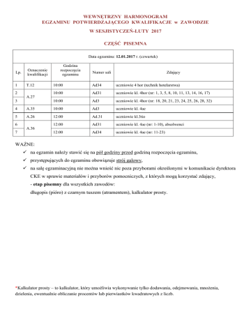 WEWNĘTRZNY HARMONOGRAM EGZAMINU POTWIERDZAJĄCEGO KWALIFIKACJE w ZAWODZIE W SESJISTYCZEŃ-LUTY 2017 CZĘŚĆ PISEMNA Data egzaminu: 12.01.2017 r. (czwartek) Lp. Oznaczenie kwalifikacji 1 T.12 2 Godzina rozpoczęcia egzaminu Zdający Numer sali 10:00 Ad34 uczniowie 4 hor (technik hotelarstwa) 10:00 Ad31 uczniowie kl. 4hor (nr: 1, 3, 5, 8, 10, 11, 13, 14, 16, 17) 10:00 Ad3 uczniowie kl. 4hor (nr: 18, 20, 21, 23, 24, 25, 26, 28, 32) A.27 3 4 A.35 10:00 Ad3 uczniowie kl. 4ae 5 A.26 12:00 Ad.31 uczniowie kl.3tio 12:00 Ad31 uczniowie kl. 4ae (nr: 1-10), absolwenci 12:00 Ad34 uczniowie kl. 4ae (nr: 11-23) 6 A.36 7 WAŻNE: na egzamin należy stawić się na pół godziny przed godziną rozpoczęcia egzaminu, przystępujących do egzaminu obowiązuje strój galowy, na salę egzaminacyjną nie można wnieść nic poza przyborami określonymi w komunikacie dyrektora CKE w sprawie materiałów i przyborów pomocniczych, z których mogą korzystać zdający, - etap pisemny dla wszystkich zawodów: długopis (pióro) z czarnym tuszem (atramentem), kalkulator prosty. *Kalkulator prosty – to kalkulator, który umożliwia wykonywanie tylko dodawania, odejmowania, mnożenia, dzielenia, ewentualnie obliczanie procentów lub pierwiastków kwadratowych z liczb. CZĘŚĆ PRAKTYCZNA Lp. Oznaczenie kwalifikacji (forma egzaminu) 1 T.12 (d) 2 Godzina rozpoczęcia egzaminu Numer sali 09.01.2017 (poniedziałek) 13:00 210 uczniowie 4 hor (technik hotelarstwa) A.26 (dk) 18.01.2017 (środa) 8:00 Ad3 uczniowie kl. 3tio 3 A.35 (dk) 18.01.2017 (środa) 9:00 Ad31 uczniowie kl. 4ae 4 A.36 (dk) 27.01.2017 (piątek) 9:00 Ad31 uczniowie kl. 4ae (nr: 1-12) 5 A.36 (dk) 27.01.2017 (piątek) 9:00 Ad34 uczniowie kl. 4ae (nr: 13-23) 6 A.27 (dk) 02.02.2017 (czwartek) 9:00 Ad3 uczniowie kl. 4hor (nr: 1, 3, 5, 8, 10, 11, 13, 14, 16, 17) 7 A.27 (dk) 03.02.2017 (piątek) 9:00 Ad3 uczniowie kl. 4hor (nr: 18, 20, 21, 23, 24, 25, 26, 28, 32) Data egzaminu Zdający WAŻNE: na egzamin należy stawić się na pół godziny przed godziną rozpoczęcia egzaminu, przystępujących do egzaminu obowiązuje strój galowy, na salę egzaminacyjną nie można wnieść nic poza przyborami określonymi w komunikacie dyrektora CKE w sprawie materiałów i przyborów pomocniczych, z których mogą korzystać zdający, - etap praktyczny: kwalifikacja A.26 – kalkulator prosty kwalifikacja A.27 – kalkulator prosty kwalifikacja A.35 – kalkulator prosty, ołówek, gumka, temperówka kwalifikacja A.36 – kalkulator prosty kwalifikacja T.12 – kalkulator prosty *Kalkulator prosty – to kalkulator, który umożliwia wykonywanie tylko dodawania, odejmowania, mnożenia, dzielenia, ewentualnie obliczanie procentów lub pierwiastków kwadratowych z liczb.