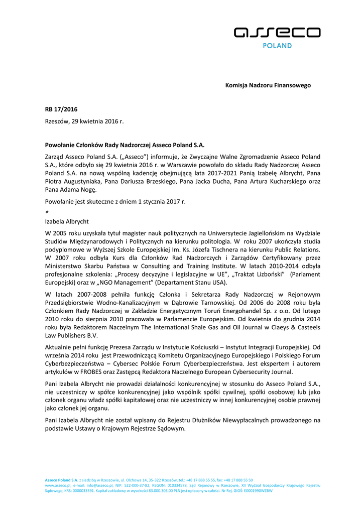 Komisja Nadzoru Finansowego RB 17/2016 Rzeszów, 29 kwietnia 2016 r. Powołanie Członków Rady Nadzorczej Asseco Poland S.A. Zarząd Asseco Poland S.A. („Asseco”) informuje, że Zwyczajne Walne Zgromadzenie Asseco Poland S.A., które odbyło się 29 kwietnia 2016 r. w Warszawie powołało do składu Rady Nadzorczej Asseco Poland S.A. na nową wspólną kadencję obejmującą lata 2017-2021 Panią Izabelę Albrycht, Pana Piotra Augustyniaka, Pana Dariusza Brzeskiego, Pana Jacka Ducha, Pana Artura Kucharskiego oraz Pana Adama Nogę. Powołanie jest skuteczne z dniem 1 stycznia 2017 r. * Izabela Albrycht W 2005 roku uzyskała tytuł magister nauk politycznych na Uniwersytecie Jagiellońskim na Wydziale Studiów Międzynarodowych i Politycznych na kierunku politologia. W roku 2007 ukończyła studia podyplomowe w Wyższej Szkole Europejskiej Im. Ks. Józefa Tischnera na kierunku Public Relations. W 2007 roku odbyła Kurs dla Członków Rad Nadzorczych i Zarządów Certyfikowany przez Ministerstwo Skarbu Państwa w Consulting and Training Institute. W latach 2010-2014 odbyła profesjonalne szkolenia: „Procesy decyzyjne i legislacyjne w UE”, „Traktat Lizboński” (Parlament Europejski) oraz w „NGO Management” (Departament Stanu USA). W latach 2007-2008 pełniła funkcję Członka i Sekretarza Rady Nadzorczej w Rejonowym Przedsiębiorstwie Wodno-Kanalizacyjnym w Dąbrowie Tarnowskiej. Od 2006 do 2008 roku była Członkiem Rady Nadzorczej w Zakładzie Energetycznym Toruń Energohandel Sp. z o.o. Od lutego 2010 roku do sierpnia 2010 pracowała w Parlamencie Europejskim. Od kwietnia do grudnia 2014 roku była Redaktorem Naczelnym The International Shale Gas and Oil Journal w Claeys & Casteels Law Publishers B.V. Aktualnie pełni funkcję Prezesa Zarządu w Instytucie Kościuszki – Instytut Integracji Europejskiej. Od września 2014 roku jest Przewodniczącą Komitetu Organizacyjnego Europejskiego i Polskiego Forum Cyberbezpieczeństwa – Cybersec Polskie Forum Cyberbezpieczeństwa. Jest ekspertem i autorem artykułów w FROBES oraz Zastępcą Redaktora Naczelnego European Cybersecurity Journal. Pani Izabela Albrycht nie prowadzi działalności konkurencyjnej w stosunku do Asseco Poland S.A., nie uczestniczy w spółce konkurencyjnej jako wspólnik spółki cywilnej, spółki osobowej lub jako członek organu władz spółki kapitałowej oraz nie uczestniczy w innej konkurencyjnej osobie prawnej jako członek jej organu. Pani Izabela Albrycht nie został wpisany do Rejestru Dłużników Niewypłacalnych prowadzonego na podstawie Ustawy o Krajowym Rejestrze Sądowym. Asseco Poland S.A. z siedzibą w Rzeszowie, ul. Olchowa 14, 35-322 Rzeszów, tel.: +48 17 888 55 55, fax: +48 17 888 55 50 www.asseco.pl, e-mail: [email protected], NIP: 522-000-37-82, REGON: 010334578, Sąd Rejonowy w Rzeszowie, XII Wydział Gospodarczy Krajowego Rejestru Sądowego, KRS: 0000033391. Kapitał zakładowy w wysokości 83.000.303,00 PLN jest opłacony w całości. Nr Rej. GIOŚ: E0001990WZBW * Piotr Augustyniak Aktualnie członek rad nadzorczych w następujących spółkach publicznych : Asseco Poland S.A., Ciech S.A., Mercor S.A., PZ Cormay S.A., w roku 2013-2014 także Kopex S.A. W latach 1994-2011 związany z Enterprise Investors (EI). Jako partner EI (2006-2011) odpowiedzialny za monitoring, wprowadzanie spółek na GPW, transakcje sprzedaży znaczących pakietów akcji spółek portfela EI na rynku publicznym i prywatnym. Reprezentował EI jako członek rad nadzorczych następujących spółkach: Polfa Kutno S.A., Energoaparatura S.A., Elektrobudowa S.A., Wizów S.A., Sfinks S.A., CSS S.A., Bauma S.A. , Comp Rzeszów S.A.(obecnie Asseco Poland S.A.), Agros Nova S.A., Teta S.A., Opoczno S.A., AB S.A., Siveco (Rumunia), STD Donivo (Słowacja), AVG Technologies (Holandia). W roku 2001 Prezes Zarządu Energoaparatury S.A., oddelegowany w ramach pracy w EI do przeprowadzenia restrukturyzacji spółki. W latach 1993-1994 związany z Ministerstwem Przekształceń Własnościowych, kolejno jako kierownik projektu i kierownik projektu prywatyzacyjnego. W latach 1992-1993 pracował w Fundacji Przekształceń Własnościowych przy Ministerstwie Przekształceń Własnościowych. Absolwent Uniwersytetu Warszawskiego na kierunku filologia angielska (1990) oraz zarządzanie (1994). W latach 1991-1992 tłumacz w New York Times Warszawa. Pan Piotr Augustyniak nie prowadzi działalności konkurencyjnej w stosunku do Asseco Poland S.A., nie uczestniczy w spółce konkurencyjnej jako wspólnik spółki cywilnej, spółki osobowej lub jako członek organu władz spółki kapitałowej oraz nie uczestniczy w innej konkurencyjnej osobie prawnej jako członek jej organu. Pan Piotr Augustyniak nie został wpisany do Rejestru Dłużników Niewypłacalnych prowadzonego na podstawie Ustawy o Krajowym Rejestrze Sądowym. * Dariusz Brzeski W 1988 r. ukończył studia wyższe w Szkole Głównej Planowania i Statystyki (obecnie Szkoła Główna Handlowa) na kierunku Organizacja i Zarządzanie. W latach 1988–1990 specjalista ds. Wdrożeń Systemów Informatycznych w Microsystem JGU. Od roku 1991 do roku 1994 był Dyrektorem Sieci Sprzedaży w InterAms Sp. z o.o. W latach 1995– 1996 pełnił funkcję Prezesa Zarządu Towarzystwa Finansowo Leasingowego Sp. z o.o. W latach 1997–2000 piastował stanowisko Prezesa Zarządu w Financial Management S.A. Od marca 2005 r. był Prezesem Zarządu Ster-Projekt S.A., a następnie od roku 2008 Prezesem Zarządu ABG S.A. Jest przewodniczącym Rady Nadzorczej Funduszu Hipotecznego FAMILIA S.A. Obecnie pełni funkcję Członka Rady Nadzorczej Asseco Poland. Pan Dariusz Brzeski nie prowadzi działalności konkurencyjnej w stosunku do Asseco Poland S.A., nie uczestniczy w spółce konkurencyjnej jako wspólnik spółki cywilnej, spółki osobowej lub jako członek organu władz spółki kapitałowej oraz nie uczestniczy w innej konkurencyjnej osobie prawnej jako członek jej organu. Pan Dariusz B