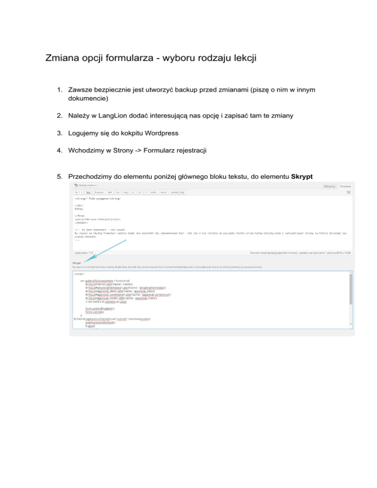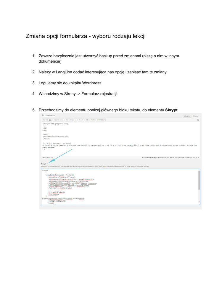Zmiana opcji formularza wyboru rodzaju lekcji 1. Zawsze bezpiecznie jest utworzyć backup przed zmianami (piszę o nim w innym dokumencie) 2. Należy w LangLion dodać interesującą nas opcję i zapisać tam te zmiany 3. Logujemy się do kokpitu Wordpress 4. Wchodzimy w Strony > Formularz rejestracji 5. Przechodzimy do elementu poniżej głównego bloku tekstu, do elementu Skrypt 6. Zmieniamy kod dodając wszędzie ukośniki (to “zepsuje formularz” pozwalając nam podejrzeć interesujące nas wartości). Wystarczy to zrobić w jednej linijce kodu: 7. Zapisujemy stronę (Przycisk zaktualizuj po prawej stronie) 8. Korzystając z przeglądarki Google Chrome przechodzimy na stronę z formularzem: http://www.zoozanko.pl/formularzrejestracji/ 9. Wypełniamy formularz testowymi danymi ale poprawnymi w sensie rodzaju treści 10. Po wypełnieniu klikamy “Zapisz” 11. Przejdziemy na stronę LangLion z formularzem: 12. Wskazane miejsce klikamy prawym klawiszem myszy: 13. Z menu które się pojawi wybieramy “Zbadaj”: 14. Zawsze wyświetlamy treść jako tekstowy: 15. Pojawi się okienko narzędzia dla developerów: 16. Klikamy na wskazany powyżej trójkącik. 17. Niebieska linia to ta która nas interesuje, a wartość value wskazana strzałką to potrzebny nam numer, który wpiszemy do naszego kodu () zaraz obok znajduje się nazwa kursu odpowiadający numerowi: 18. Wracamy do kokpitu WordPress i naszego otwartego kodu 19. Usuwamy nasze wcześniejsze zmiany w sekcji SKRYPT przywracając kod do wartości początkowej (usuwając ukośniki kod powinien wyglądać jak poniżej): 20. Przechodzimy do momentu kodu gdy zobaczymy napis: 21. Interesuje nas kod: <option value="66">Lekcje indywidualne</option> Oczywiście będzie on posiadał zmieniane elementy (numer value b ędzie zmieniony oraz nazwa kursu) 22. Kopiujemy ten kod (zawsze tylko jedną linijkę jeśli w przyszłości pojawi się ich więcej) i wklejamy go w następnej linii: <option value="66">Lekcje indywidualne</option> <option value="66">Lekcje indywidualne</option> 23. W polu value wpisujemy znaleziony numer i adekwatną dla niego nazwę kursu: <option value="66">Lekcje indywidualne</option> <option value="77">Inny kurs jego nazwa</option> 24. Jeśli opcji jest więcej dopisujemy kolejne linie zmieniając value i nazwę kursu 25. Przykładowy dodany kod: 26. Należy oczywiście zaktualizować stronę klikając Zaktualizuj po prawej stronie