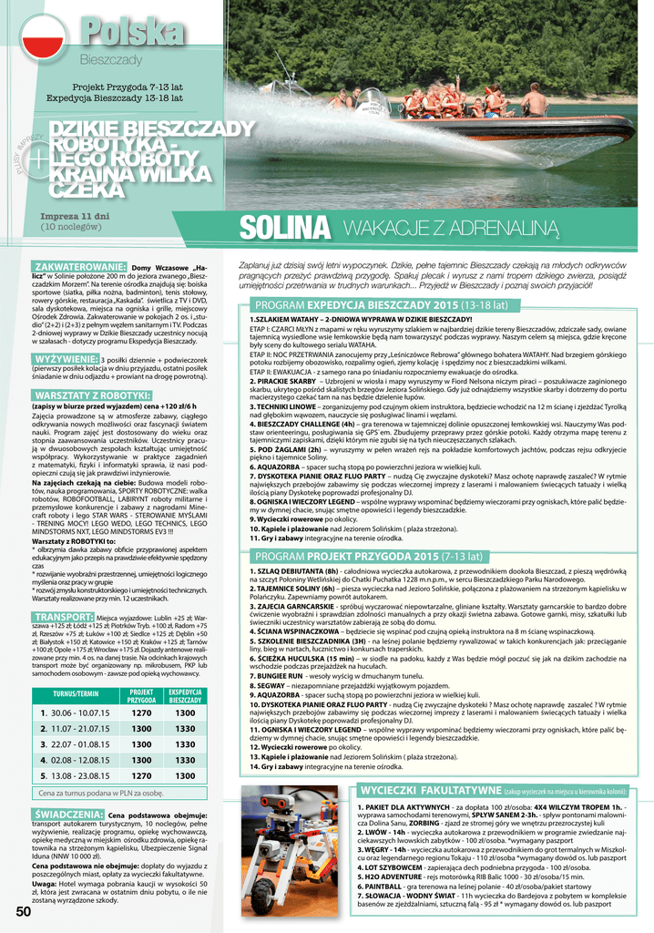 Polska Bieszczady Projekt Przygoda 7-13 lat Expedycja Bieszczady 13-18 lat USY IM PL DZIKIE BIESZCZADY ROBOTYKA LEGO ROBOTY +KRAINA WILKA EZY PR CZEKA SOLINA Impreza 11 dni (10 noclegów) ZAKWATEROWANIE: Domy Wczasowe „Halicz” w Solinie położone 200 m do jeziora zwanego „Bieszczadzkim Morzem”. Na terenie ośrodka znajdują się: boiska sportowe (siatka, piłka nożna, badminton), tenis stołowy, rowery górskie, restauracja „Kaskada”. świetlica z TV i DVD, sala dyskotekowa, miejsca na ogniska i grille, miejscowy Ośrodek Zdrowia. Zakwaterowanie w pokojach 2 os. i „studio” (2+2) i (2+3) z pełnym węzłem sanitarnym i TV. Podczas 2-dniowej wyprawy w Dzikie Bieszczady uczestnicy nocują w szałasach - dotyczy programu Ekspedycja Bieszczady. WYŻYWIENIE: 3 posiłki dziennie + podwieczorek (pierwszy posiłek kolacja w dniu przyjazdu, ostatni posiłek śniadanie w dniu odjazdu + prowiant na drogę powrotną). WARSZTATY Z ROBOTYKI: (zapisy w biurze przed wyjazdem) cena +120 zł/6 h Zajęcia prowadzone są w atmosferze zabawy, ciągłego odkrywania nowych możliwości oraz fascynacji światem nauki. Program zajęć jest dostosowany do wieku oraz stopnia zaawansowania uczestników. Uczestnicy pracują w dwuosobowych zespołach kształtując umiejętność współpracy. Wykorzystywanie w praktyce zagadnień z matematyki, fizyki i informatyki sprawia, iż nasi podopieczni czują się jak prawdziwi inżynierowie. Na zajęciach czekają na ciebie: Budowa modeli robotów, nauka programowania, SPORTY ROBOTYCZNE: walka robotów, ROBOFOOTBALL, LABIRYNT roboty militarne i przemysłowe konkurencje i zabawy z nagrodami Minecraft roboty i lego STAR WARS - STEROWANIE MYŚLAMI - TRENING MOCY! LEGO WEDO, LEGO TECHNICS, LEGO MINDSTORMS NXT, LEGO MINDSTORMS EV3 !!! Warsztaty z ROBOTYKI to: * olbrzymia dawka zabawy obficie przyprawionej aspektem edukacyjnym jako przepis na prawdziwie efektywnie spędzony czas * rozwijanie wyobraźni przestrzennej, umiejętności logicznego myślenia oraz pracy w grupie * rozwój zmysłu konstruktorskiego i umiejętności technicznych. Warsztaty realizowane przy min. 12 uczestnikach. TRANSPORT: Miejsca wyjazdowe: Lublin +25 zł; Warszawa +125 zł; Łódź +125 zł; Piotrków Tryb. +100 zł, Radom +75 zł, Rzeszów +75 zł; Łuków +100 zł; Siedlce +125 zł; Dęblin +50 zł; Białystok +150 zł; Katowice +150 zł; Kraków +125 zł; Tarnów +100 zł; Opole +175 zł; Wrocław +175 zł. Dojazdy antenowe realizowane przy min. 4 os. na danej trasie. Na odcinkach krajowych transport może być organizowany np. mikrobusem, PKP lub samochodem osobowym - zawsze pod opieką wychowawcy. TURNUS/TERMIN PROJEKT PRZYGODA EKSPEDYCJA BIESZCZADY 1. 30.06 - 10.07.15 1270 1300 2. 11.07 - 21.07.15 1300 1330 3. 22.07 - 01.08.15 1300 1330 4. 02.08 - 12.08.15 1300 1330 5. 13.08 - 23.08.15 1270 1300 Cena za turnus podana w PLN za osobę. 50 ŚWIADCZENIA: Cena podstawowa obejmuje: transport autokarem turystycznym, 10 noclegów, pełne wyżywienie, realizację programu, opiekę wychowawczą, opiekę medyczną w miejskim ośrodku zdrowia, opiekę ratownika na strzeżonym kąpielisku, Ubezpieczenie Signal Iduna (NNW 10 000 zł). Cena podstawowa nie obejmuje: dopłaty do wyjazdu z poszczególnych miast, opłaty za wycieczki fakultatywne. Uwaga: Hotel wymaga pobrania kaucji w wysokości 50 zł, która jest zwracana w ostatnim dniu pobytu, o ile nie zostaną wyrządzone szkody. WAKACJE Z ADRENALINĄ Zaplanuj już dzisiaj swój letni wypoczynek. Dzikie, pełne tajemnic Bieszczady czekają na młodych odkrywców pragnących przeżyć prawdziwą przygodę. Spakuj plecak i wyrusz z nami tropem dzikiego zwierza, posiądź umiejętności przetrwania w trudnych warunkach... Przyjedź w Bieszczady i poznaj swoich przyjaciół! PROGRAM EXPEDYCJA BIESZCZADY 2015 (13-18 lat) 1.SZLAKIEM WATAHY – 2-DNIOWA WYPRAWA W DZIKIE BIESZCZADY! ETAP I: CZARCI MŁYN z mapami w ręku wyruszymy szlakiem w najbardziej dzikie tereny Bieszczadów, zdziczałe sady, owiane tajemnicą wysiedlone wsie łemkowskie będą nam towarzyszyć podczas wyprawy. Naszym celem są miejsca, gdzie kręcone były sceny do kultowego serialu WATAHA. ETAP II: NOC PRZETRWANIA zanocujemy przy „Leśniczówce Rebrowa” głównego bohatera WATAHY. Nad brzegiem górskiego potoku rozbijemy obozowisko, rozpalimy ogień, zjemy kolację i spędzimy noc z bieszczadzkimi wilkami. ETAP II: EWAKUACJA - z samego rana po śniadaniu rozpoczniemy ewakuacje do ośrodka. 2. PIRACKIE SKARBY – Uzbrojeni w wiosła i mapy wyruszymy w Fiord Nelsona niczym piraci – poszukiwacze zaginionego skarbu, ukrytego pośród skalistych brzegów Jeziora Solińskiego. Gdy już odnajdziemy wszystkie skarby i dotrzemy do portu macierzystego czekać tam na nas będzie dzielenie łupów. 3. TECHNIKI LINOWE – zorganizujemy pod czujnym okiem instruktora, będziecie wchodzić na 12 m ścianę i zjeżdżać Tyrolką nad głębokim wąwozem, nauczycie się posługiwać linami i węzłami. 4. BIESZCZADY CHALLENGE (4h) – gra terenowa w tajemniczej dolinie opuszczonej łemkowskiej wsi. Nauczymy Was podstaw orienteeringu, posługiwania się GPS`em. Zbudujemy przeprawy przez górskie potoki. Każdy otrzyma mapę terenu z tajemniczymi zapiskami, dzięki którym nie zgubi się na tych nieuczęszczanych szlakach. 5. POD ŻAGLAMI (2h) – wyruszymy w pełen wrażeń rejs na pokładzie komfortowych jachtów, podczas rejsu odkryjecie piękno i tajemnice Soliny. 6. AQUAZORBA – spacer suchą stopą po powierzchni jeziora w wielkiej kuli. 7. DYSKOTEKA PIANIE ORAZ FLUO PARTY – nudzą Cię zwyczajne dyskoteki? Masz ochotę naprawdę zaszaleć? W rytmie największych przebojów zabawimy się podczas wieczornej imprezy z laserami i malowaniem świecących tatuaży i wielką ilością piany Dyskotekę poprowadzi profesjonalny DJ. 8. OGNISKA I WIECZORY LEGEND – wspólne wyprawy wspominać będziemy wieczorami przy ogniskach, które palić będziemy w dymnej chacie, snując smętne opowieśc