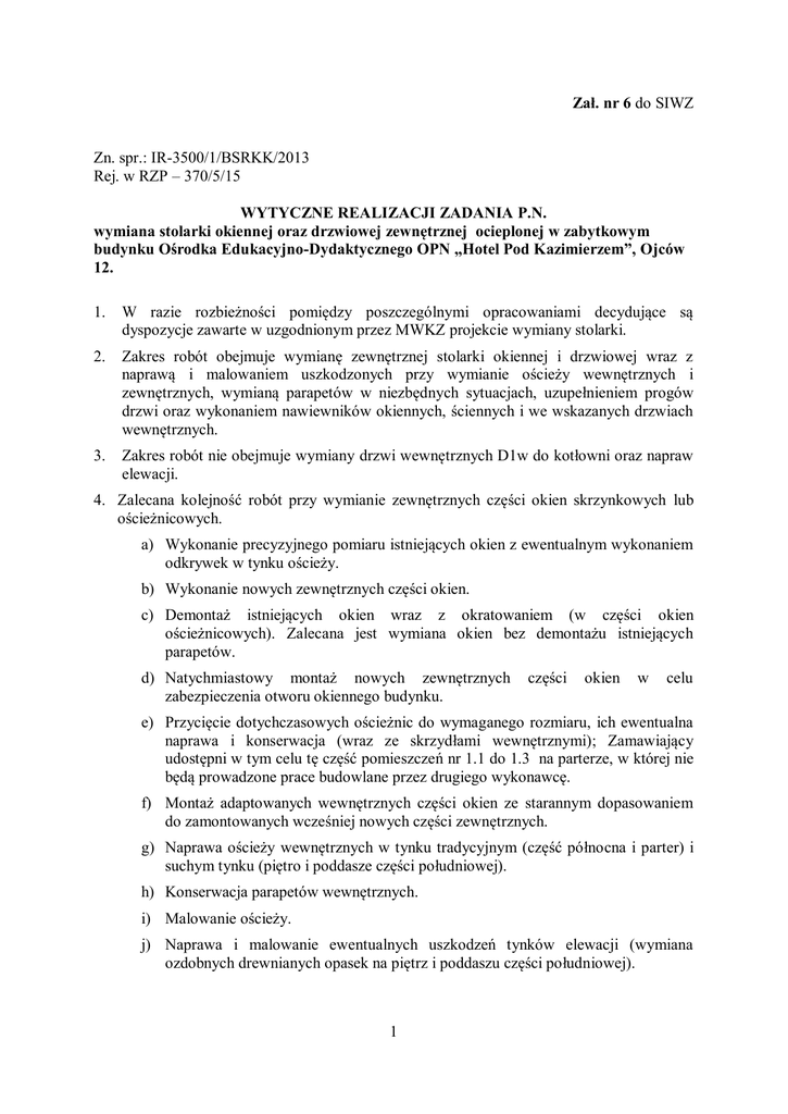 Zał. nr 6 do SIWZ Zn. spr.: IR-3500/1/BSRKK/2013 Rej. w RZP – 370/5/15 WYTYCZNE REALIZACJI ZADANIA P.N. wymiana stolarki okiennej oraz drzwiowej zewnętrznej ocieplonej w zabytkowym budynku Ośrodka Edukacyjno-Dydaktycznego OPN „Hotel Pod Kazimierzem”, Ojców 12. 1. W razie rozbieżności pomiędzy poszczególnymi opracowaniami decydujące są dyspozycje zawarte w uzgodnionym przez MWKZ projekcie wymiany stolarki. 2. Zakres robót obejmuje wymianę zewnętrznej stolarki okiennej i drzwiowej wraz z naprawą i malowaniem uszkodzonych przy wymianie ościeży wewnętrznych i zewnętrznych, wymianą parapetów w niezbędnych sytuacjach, uzupełnieniem progów drzwi oraz wykonaniem nawiewników okiennych, ściennych i we wskazanych drzwiach wewnętrznych. 3. Zakres robót nie obejmuje wymiany drzwi wewnętrznych D1w do kotłowni oraz napraw elewacji. 4. Zalecana kolejność robót przy wymianie zewnętrznych części okien skrzynkowych lub ościeżnicowych. a) Wykonanie precyzyjnego pomiaru istniejących okien z ewentualnym wykonaniem odkrywek w tynku ościeży. b) Wykonanie nowych zewnętrznych części okien. c) Demontaż istniejących okien wraz z okratowaniem (w części okien ościeżnicowych). Zalecana jest wymiana okien bez demontażu istniejących parapetów. d) Natychmiastowy montaż nowych zewnętrznych zabezpieczenia otworu okiennego budynku. części okien w celu e) Przycięcie dotychczasowych ościeżnic do wymaganego rozmiaru, ich ewentualna naprawa i konserwacja (wraz ze skrzydłami wewnętrznymi); Zamawiający udostępni w tym celu tę część pomieszczeń nr 1.1 do 1.3 na parterze, w której nie będą prowadzone prace budowlane przez drugiego wykonawcę. f) Montaż adaptowanych wewnętrznych części okien ze starannym dopasowaniem do zamontowanych wcześniej nowych części zewnętrznych. g) Naprawa ościeży wewnętrznych w tynku tradycyjnym (część północna i parter) i suchym tynku (piętro i poddasze części południowej). h) Konserwacja parapetów wewnętrznych. i) Malowanie ościeży. j) Naprawa i malowanie ewentualnych uszkodzeń tynków elewacji (wymiana ozdobnych drewnianych opasek na piętrz i poddaszu części południowej). 1 5. Przy wymianie okien na jednoramowe, konieczna jest wymiana drewnianych parapetów wewnętrznych, uzupełnienie i naprawa ościeży w suchym tynku oraz wymiana drewnianych ozdobnych opasek na poddaszu. 6. Dopuszcza się inne technologie wymiany okien na skrzynkowe i ościeżnicowe, w tym kompletnie nowe okna z pojedynczymi szybami wewnętrznymi, pod warunkiem wcześniejszej ich akceptacji projektanta, Zamawiającego i Wojewódzkiego Konserwatora Zabytków. 7. Na podobnej jak w p. 4 zasadzie wymaga się akceptacji rozwiązań nawiewników okiennych i ściennych. 8. Kratki nawiewne w drzwiach wewnętrznych prowadzących do pomieszczeń wymienionych w przedmiarze maja być metalowe i w kolorze dostosowanym do drzwi. 9. Wykonawca ma uzyskać powyższe akceptacje poprzez przedłożenie projektów wykonawczych poszczególnych typów okien i drzwi. Projekty te mają być przedłożone przed rozpoczęciem robót warsztatowych. Będą one również podstawą do złożenia przez Wykonawcę oświadczeń dotyczących dopuszczenia do jednostkowego zastosowania w budownictwie oraz parametrów ich izolacyjności cieplnej w trybie art. 10 Ustawy o wyrobach budowlanych. 10. Wykonawca jest zobowiązany do współpracy z drugim wykonawcą robót termomodernizacyjnych w budynku - zgodnie z uzgodnionym wspólnie harmonogramem robót, który w szczególności musi zakładać wymianę drzwi, okien i parapetów przed montażem grzejników a na parterze – również ogrzewania podłogowego. 11. Roboty należy prowadzić w sposób minimalizujący utrudnienia dla użytkowników budynku i turystów oraz zapewniający ich bezpieczeństwo. 12. Pomieszczenia, w których będą wykonywane prace należy na bieżąco utrzymywać w czystości a po skończeniu prac należy je przywrócić do poprzedniego stanu. 13. Roboty związane z wymianą stolarki należy prowadzić w sposób minimalizujący ingerencję w istniejące elementy budowlane i wzbudzanie kurzu. 14. Konieczne jest zabezpieczenie pomieszczeń przed kurzem powstającym przy prowadzonych pracach– przy pomocy szczelnych osłon z folii. 15. Naprawy uszkodzonych powierzchni należy wykonać w dotychczasowym standardzie wykończenia tych powierzchni. 16. Demontaż starych grzejników ma nastąpić przed wymianą okien a montaż nowych grzejników po wymianie okien. Uwagi końcowe: 1. Przed rozpoczęciem robót Wykonawca uzgodni z Zamawiającym szczegółowy harmonogram realizacji zadania w celu skoordynowania działań z wykonawcą prac budowlano-instalacyjnych oraz zapewnienia użytkownikom możliwości funkcjonowania w modernizowanym budynku. 2. Z tych samych powodów konieczna będzie bieżąca współpraca z wykonawcą prac budowlano-instalacyjnych. 3. Materiały rozbiórkowe, poza wyraźnie wskazanymi przez Zamawiającego do pozostawienia, wywiezie na własny koszt Wykonawca. 2 4. Zamawiający zapewnia Wykonawcy podłączenie się do istniejącej instalacji elektrycznej. Wykonawca opomiaruje źródło energii elektrycznej i będzie ponosił koszty energii elektrycznej według wskazań sublicznika energii. Sporządził: Mgr inż. Andrzej Weber 3