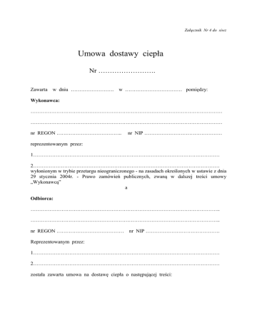 Załącznik Nr 4 do siwz Umowa dostawy ciepła Nr ……………………. Zawarta w dniu ……………………. w …………………………… pomiędzy: Wykonawca: ………………………………………………………………………………………………… ………………………………………………………………………………………………… nr REGON ……………………………….. nr NIP ……………………………………… reprezentowanym przez: 1……………………………………………………………………………………………… 2……………………………………………………………………………………………… wyłonionym w trybie przetargu nieograniczonego - na zasadach określonych w ustawie z dnia 29 stycznia 2004r. - Prawo zamówień publicznych, zwaną w dalszej treści umowy „Wykonawcą” a Odbiorca: ……………………………………………………………………………………………….. ……………………………………………………………………………………………….. nr REGON ………………………………… nr NIP ……………………………………. Reprezentowanym przez: 1……………………………………………………………………………………………… 2……………………………………………………………………………………………… została zawarta umowa na dostawę ciepła o następującej treści: §1 Przedmiot umowy i postanowienia ogólne. 1. Przedmiotem umowy jest dostarczenie energii cieplnej przez Wykonawcę na potrzeby Odbiorcy do obiektów Odbiorcy, a Odbiorca zobowiązuje się na warunkach określonych w niniejszej umowie dostarczone ciepło odebrać. 2. Dostawa ciepła będzie następować z kotłowni na biomasę wybudowanej kosztem i staraniem Wykonawcy. 3. Odbiorca wydzierżawi odpłatnie niezbędną powierzchnię terenu pod budowę kotłowni. 4. Odbiorca dostarczy Wykonawcy decyzję o ustaleniu lokalizacji celu publicznego dla terenu na którym ma zostać wybudowana kotłownia, pozostały proces inwestycyjny w tym uzyskanie pozwolenia na budowę, przeprowadzi Wykonawca. 5. Termin realizacji zamówienia: przez okres 3 lat licząc od dnia 1 października 2009r. §2 Moc zamówiona. 1. Odbiorca zamawia a Wykonawca zobowiązuje się do wytworzenia i dostarczenia Odbiorcy ciepła w ilości i parametrach określonych w specyfikacji istotnych warunków zamówienia, przez okres obowiązywania niniejszej umowy. 2. Wykonawca rozpocznie dostarczanie ciepła Odbiorcy pod warunkiem wywiązania się Odbiorcy ze zobowiązań określonych w § 1 ust. 3 i 4. 3. Strony zobowiązują się, iż określą wspólnie na podstawie protokołu odbioru dzień rozpoczęcia dostaw ciepła, jeżeli dzień rozpoczęcia dostaw ciepła będzie inny niż wskazany w § 3 ust. 5. 4. Wykonawca od dnia rozpoczęcia dostaw ciepła ponosi we własnym zakresie koszty wytwarzania, dostarczania, utrzymania i obsługi urządzeń ciepłowniczych stanowiących jego własność. §3 Dostawa i odbiór ciepła. 1. Sprzedaż ciepła odbywa się w oparciu o postanowienia niniejszej Umowy w zakresie standardów jakościowych obsługi Odbiorcy, miejsca i warunków dostarczania i odbioru ciepła, oraz w oparciu o przepisy odpowiednio Kodeksu Cywilnego, ustawy z dnia 10 kwietnia 1997 r. Prawo energetyczne ( Dz. U. z 2006 r. Nr 89 poz. 625 z późn. zmian.), rozporządzenia taryfowego – Rozporządzenie Ministra Gospodarki z dnia 9 października 2006 r. w sprawie szczegółowych zasad kształtowania i kalkulacji taryf oraz zasad rozliczeń z tytułu zaopatrzenia w ciepło ( Dz. U. Nr 193, poz. 1423 ), rozporządzenia systemowego – Rozporządzenia Ministra Gospodarki z dnia 15 stycznia 2007 r. w sprawie szczegółowych warunków funkcjonowania systemów ciepłowniczych ( Dz. U. Nr 16 poz. 92 ) oraz inne niezbędne przepisy wykonawcze do ustawy Prawo energetyczne. 2. Strony zgodnie oświadczają, iż będą istniały dwa systemy cieplne; jeden należący do Wykonawcy, drugi do Odbiorcy, przy czym każda ze Stron jest odpowiedzialna za własny system cieplny oraz jest zobowiązana do utrzymania 3. 4. 5. 6. 7. należących do niej urządzeń w należytym stanie technicznym, w sposób zapewniający sprawne oraz bezpieczne i zgodne z niniejszą umową dostarczanie i odbiór ciepła, a także do bezzwłocznego usuwania wszelkich nieszczelności w eksploatowanych przez nią urządzeniach powodujących lub mogących spowodować jakiekolwiek ubytki ciepła. Odbiorca oświadcza, iż należący do niego system cieplny w tym urządzenia i instalacje za pomocą których odbierał będzie energię cieplną wytwarzaną i dostarczaną przez Wykonawcę, spełnia wszelkie wymogi określone w obowiązujących przepisach prawa i normach, a ich stan techniczny zapewnia prawidłową eksploatację, zobowiązując się jednocześnie do utrzymania go w należytym stanie technicznym przez cały okres obowiązywania niniejszej umowy. Strony zobowiązują się uzupełniać ubytki nośnika ciepła w swoim systemie cieplnym, używając w tym celu wyłącznie właściwie uzdatnianej wody. Rozpoczęcie dostaw ciepła dla celów grzewczych nastąpi od 1 października każdego roku kalendarzowego, natomiast dostawy ciepła dla przygotowania ciepłej wody użytkowej będą w systemie ciągłym z dwutygodniową przerwą technologiczną w okresie letnim, której termin każdorazowo zostanie protokolarnie uzgodniony pomiędzy Wykonawcą a Odbiorcą. Rozpoczęcie dostaw ciepła dla celów grzewczych przed 1 października oraz zakończenie dostaw ciepła nastąpi niezwłocznie, jednak nie później niż w ciągu 48 godzin od dnia złożenia pisemnego wniosku przez Odbiorcę. Strony dopuszczają formę pisemną – fax lub e-mail. Wykonawca nie ponosi odpowiedzialności za niedogrzanie pomieszczeń wynikające z n