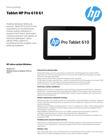 Karta produktu Tablet HP Pro 610 G1 Osobisty komputer idealny do podróży. Tablet HP Pro 610 G1 jest wyposażony we wszechstronne funkcje systemu Windows 8.1 , procesor Intel® Atom, akumulator o dużej żywotności i jest zgodny ze starszymi aplikacjami. Zakup pakietu Office zapewni Ci produktywność bez względu na to, gdzie się znajdziesz. 1 2 HP zaleca system Windows. Windows 8.1 Wielkość ekranu: przekątna 25,65 cm (10,1") Gotowość do realizacji zadań. Niezawodnie długi czas pracy akumulatora, gniazdo Micro SD obsługujące karty pamięci SDXC o pojemności do 2 TB3 oraz wytrzymały ekran ze szkła Corning® Gorilla® pozwolą spełnić wszystkie codzienne wymagania biznesowe. Długi czas pracy akumulatora zapewnia mobilność przez cały dzień. 64 GB miejsca na dysku wewnętrznym3 i gniazdo rozszerzeń Micro SD obsługujące karty pamięci SDXC o pojemności do 2 TB3, pozwalające przechowywać dokumenty cyfrowe i nie tylko. Łatwe drukowanie z użyciem zgodnych drukarek sieciowych lub usługi HP ePrint.4 Stworzony z myślą o wydajności. Wyjątkowy komfort pracy z najnowszym czterordzeniowym procesorem Intel® Atom™,2 systemem Windows 8.11 i zestawem fabrycznie zainstalowanych aplikacji HP do zwiększania produktywności. Elastyczność zarówno tradycyjnych aplikacji x86 na pulpicie systemu Windows, jak i nowoczesnych aplikacji na ekranie głównym. Wysoka rozdzielczość, doskonałe rezultaty. Wbudowane złącze micro HDMI i efektowny ekran WUXGA umożliwiają dzielenie się plikami, zdjęciami i filmami, natomiast technologia Miracast zapewnia łatwość współpracy.5 Twoja praca może wyróżniać się jeszcze bardziej. Efektowny ekran WUXGA o przekątnej 25,65 cm (10,1") i rozdzielczości 1920 x 1200 z obsługą gestów wielopunktowych i wyjątkowo szerokimi kątami widzenia znacznie uprzyjemnia przeglądanie stron internetowych i innych treści. Wyjście HDMI (za pośrednictwem portu micro HDMI) umożliwia łatwe sparowanie urządzenia z monitorem bezprzewodowym z użyciem technologii Miracast5 i Bluetooth 4.0. Port HDMI do połączeń przewodowych z wyświetlaczami, monitorami lub projektorami zgodnymi ze standardem HDMI. Produktywność i poczucie bezpieczeństwa. Zawsze płynna i produktywna praca. Microsoft® Defender6 zapewnia zaawansowaną ochronę przed wirusami i innymi zagrożeniami, natomiast rozwiązanie TPM7 chroni przed kradzieżą tożsamości i włamaniami. Chłodny i cichy. Mały i lekki tablet, który można z łatwością nosić na spotkania lub zabrać w podróż. Cicha konstrukcja tabletu HP Pro 610 bez wentylatora sprawia, że jest zawsze chłodny w dotyku. Karta produktu Tablet HP Pro 610 G1 HP zaleca system Windows. System operacyjny Windows 8.1 Pro 64 1 Windows 8.1 64 1 Office Home & Student 2013 2 Wyświetlacz Ekran pojemnościowy o przekątnej 25,65 cm (10,1") WUXGA UWVA (1900 x 1200) z wielopunktowym interfejsem dotykowym i digitizerem, Corning® Gorilla® Glass z powłoką zapobiegającą pozostawianiu śladów palców Rodzaj procesora Procesor Intel® Atom® 3 Procesor Procesor Intel® Atom® Z3795 (1,6 GHz, maks. 2,39 GHz z technologią Intel Burst, 2 MB pamięci podręcznej, 4 rdzenie) 3 Zestaw układów Układ zintegrowany z procesorem Pamięć 4 GB pamięci SDRAM 1067 MHz LPDDR3 Archiwizacja danych Napęd SSD 64 GB eMMC; Napęd SSD 128 GB eMMC 4 Grafika Akcelerator graficzny Intel Graphics Media Accelerator Karta dźwiękowa Gniazdo słuchawkowe 3,5 mm; Wbudowane głośniki stereo; Wbudowany mikrofon; HP Premier Sound Obsługa komunikacji bezprzewodowej 802.11a/b/g/n (2x2) WiFi; Bluetooth® 4.0 + LE 5 Gniazda rozszerzeń 1 karta pamięci microSD Porty i złącza 1 port micro USB 2.0; 1 port micro HDMI; 1 gniazdo słuchawkowe 3,5 mm; 1 gniazdo pr. st. Urządzenia multimedialne i urządzenia wejścia 2 megapiksele, z diodą LED informującą o aktywności kamery internetowej (z przodu); 8 megapikseli, z funkcją automatycznego ustawiania ostrości (z tyłu) Akcelerometr; Kompas elektroniczny; Żyroskop; Czujnik oświetlenia zewnętrznego; Czujnik efektu Halla Oprogramowanie zainstalowane fabrycznie Należy zakupić pakiet Office; Skype; HP ePrint; HP Connected Music; HP Connected Photo; HP Support Assistant Wymiary 259,6 x 181,1 x 9,9 mm Waga Od 652 g Zasilanie Zasilacz zewnętrzny 18 W pr. zm. Typ baterii 2-ogniwowy akumulator polimerowy litowo-jonowy 31 Wh Gwarancja Roczna, ograniczona gwarancja (dostępne możliwości rozbudowy sprzedawane osobno), roczna gwarancja na akumulator podstawowy Karta produktu Tablet HP Pro 610 G1 HP zaleca system Windows. Akcesoria i usługi (nie wchodzą w skład zestawu) Piórko pojemnościowe HP Executive Ochrona ekranu dotykowego przed odciskami palców i smugami — piórko pojemnościowe HP idealne do ekranów dotykowych notebooków, tabletów i monitorów komputerowych. Wszechstronność — pisanie, rysowanie, wpisywanie dotykowe i zwykłe przeglądanie stron internetowych lub ulubionych aplikacji bez wysiłku — nawet z zabezpieczeniami ekranu. Numer produktu: E7U19AA Zasilacz pr. zm. HP 18 W do tabletów Ładuj tablet, jednocześnie oglądając filmy lub przeglądając strony internetowe1. Zasilacz pr. zm. HP 18 W stworzono specjalnie z myślą o kompatybilnych tabletach HP. Zabezpieczenie ekranu HP Omni10 o przekątnej 25,65 cm Przejrzyste i wytrzymałe zabezpieczenie ekranu tabletu HP Omni10 zaprojektowane specjalnie do ekranu o przekątnej 25,65 cm (10"). Ochrona przy codziennym użytkowaniu — przed kurzem, smugami, zabrudzeniami i dotykiem piórka. Bonus: zestaw aplikatora do prostego nakładania bez pęcherzyków powietrza i bez żadnych pozostałości po usunięciu. Idealne, przejrzyste zabezpieczenie. Numer produktu: F2L66AA Numer produktu: F2M30AA Futerał na tablet na zamek błyskawiczny HP 10" Zabezpiecz swój tablet miękkim neoprenem w zapinanym na zamek futerale na tablet HP o przekątnej 25,65 cm (10"). Bezpiecznie chroniony i zapięty na zamek tablet jest gotowy do drogi.