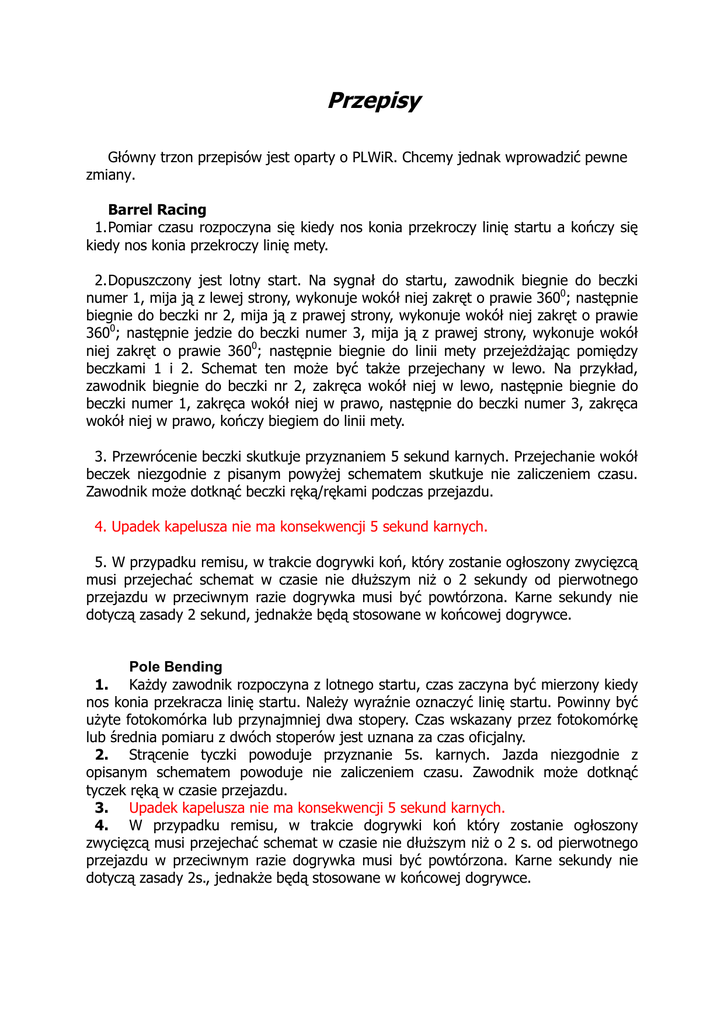 Przepisy Główny trzon przepisów jest oparty o PLWiR. Chcemy jednak wprowadzić pewne zmiany. Barrel Racing 1. Pomiar czasu rozpoczyna się kiedy nos konia przekroczy linię startu a kończy się kiedy nos konia przekroczy linię mety. 2. Dopuszczony jest lotny start. Na sygnał do startu, zawodnik biegnie do beczki numer 1, mija ją z lewej strony, wykonuje wokół niej zakręt o prawie 3600; następnie biegnie do beczki nr 2, mija ją z prawej strony, wykonuje wokół niej zakręt o prawie 3600; następnie jedzie do beczki numer 3, mija ją z prawej strony, wykonuje wokół niej zakręt o prawie 3600; następnie biegnie do linii mety przejeżdżając pomiędzy beczkami 1 i 2. Schemat ten może być także przejechany w lewo. Na przykład, zawodnik biegnie do beczki nr 2, zakręca wokół niej w lewo, następnie biegnie do beczki numer 1, zakręca wokół niej w prawo, następnie do beczki numer 3, zakręca wokół niej w prawo, kończy biegiem do linii mety. 3. Przewrócenie beczki skutkuje przyznaniem 5 sekund karnych. Przejechanie wokół beczek niezgodnie z pisanym powyżej schematem skutkuje nie zaliczeniem czasu. Zawodnik może dotknąć beczki ręką/rękami podczas przejazdu. 4. Upadek kapelusza nie ma konsekwencji 5 sekund karnych. 5. W przypadku remisu, w trakcie dogrywki koń, który zostanie ogłoszony zwycięzcą musi przejechać schemat w czasie nie dłuższym niż o 2 sekundy od pierwotnego przejazdu w przeciwnym razie dogrywka musi być powtórzona. Karne sekundy nie dotyczą zasady 2 sekund, jednakże będą stosowane w końcowej dogrywce. Pole Bending 1. Każdy zawodnik rozpoczyna z lotnego startu, czas zaczyna być mierzony kiedy nos konia przekracza linię startu. Należy wyraźnie oznaczyć linię startu. Powinny być użyte fotokomórka lub przynajmniej dwa stopery. Czas wskazany przez fotokomórkę lub średnia pomiaru z dwóch stoperów jest uznana za czas oficjalny. 2. Strącenie tyczki powoduje przyznanie 5s. karnych. Jazda niezgodnie z opisanym schematem powoduje nie zaliczeniem czasu. Zawodnik może dotknąć tyczek ręką w czasie przejazdu. 3. Upadek kapelusza nie ma konsekwencji 5 sekund karnych. 4. W przypadku remisu, w trakcie dogrywki koń który zostanie ogłoszony zwycięzcą musi przejechać schemat w czasie nie dłuższym niż o 2 s. od pierwotnego przejazdu w przeciwnym razie dogrywka musi być powtórzona. Karne sekundy nie dotyczą zasady 2s., jednakże będą stosowane w końcowej dogrywce. Stake Race Przepisy zgodne z PLWiR z wyjątkiem: 1. „Przywrócenie tyczki nie skutkuje nie zaliczeniem schematu tylko karą 3 sekundową”. 2. Rozstaw tyczek od linii środkowej 20m (w przepisach PLWiR jest 12m). 3. Upadek kapelusza nie ma konsekwencji 5 sekund karnych. Western Pleasure Zgodnie z nowymi przepisami PLWiR (wjazd kłusem przez środek ujeżdżalni a następnie według poleceń sędziego). Pierwsze miejsce 17 punktów, piętnaste miejsce 3 punkty. Wygrywa zawodnik z największą sumą punktów z dwu dni. Reining Przepisy zgodne z PLWiR Pierwszy dzień schemat nr 11 (ten wydrukowany w przepisach z 2005) Drugi dzień schemat nr 6 Wygrywa zawodnik z największą sumą punktów z dwu dni. Western Horsemanship Przepisy zgodne z PLWiR Pierwszy dzień – schemat zamieszczony na stronie Drugi dzień – schemat, który ułożą zawodnicy po pierwszym dniu zawodów i zostanie zaakceptowany przez sędziów. Wygrywa zawodnik z największą sumą punktów z dwu dni. Ogólne 1. Przed zawodami zostanie wybrana rada zawodników, której zadaniem będzie reprezentowanie interesów zawodników i konsultowanie się z organizatorami i sędziami. 2. Konkurencje są podzielone na dwie grupy: konkurencje „techniczne” i konkurencje „szybkościowe”. 3. Każda grupa konkurencji będzie rozgrywana w systemie dwudniowym. 4. Do pucharu będą się liczyć wyniki dwóch dni zawodów. 5. W drugim dniu zawodnicy będą startować w kolejności zajmowanych przez siebie miejsc (od 1 do 10). 6. Na jednym koniu może startować tylko jeden zawodnik. 7. Zawodnik może wystąpić na więcej niż jednym koniu. W takim wypadku: a) Wyniki są liczone dla każdego konia oddzielnie. b) Opłata dodatkowo 20 PLN za konia/konkurencję lub 50 PLN za całe zawody. 8. Są dwa przejazdy dla każdej z konkurencji szybkościowej. Jeśli zawodnik nie zaliczy żadnego z przejazdów w danej konkurencji (np. pojedzie niezgodnie z schematem), do pucharu liczy mu się czas najgorszego przejazdu w danej konkurencji, plus trzy sekundy. 9. Punkty do pucharu w konkurencjach technicznych będą przyznawane w ten sposób, że zawodnik z 15 miejsca otrzymuje 3 punkty, a z pierwszego 17 punktów. Pomiędzy tymi miejscami od miejsca pierwszego jest zmniejszanie o jeden punkt na miejsce. Zawodnik poniżej 15 miejsca otrzymują 1 punkt za daną konkurencję chyba, że zostanie zdyskwalifikowany. Jesteśmy otwarci na wszystkie sugestie zawodników.
