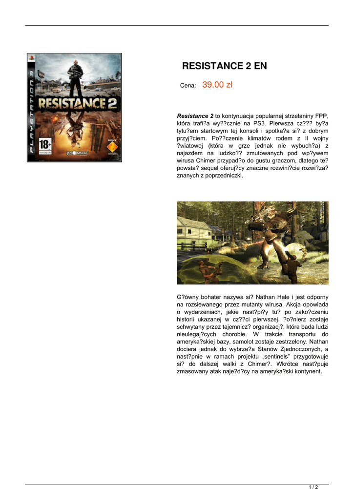 RESISTANCE 2 EN Cena: 39.00 zł Resistance 2 to kontynuacja popularnej strzelaniny FPP, która trafi?a wy??cznie na PS3. Pierwsza cz??? by?a tytu?em startowym tej konsoli i spotka?a si? z dobrym przyj?ciem. Po??czenie klimatów rodem z II wojny ?wiatowej (która w grze jednak nie wybuch?a) z najazdem na ludzko?? zmutowanych pod wp?ywem wirusa Chimer przypad?o do gustu graczom, dlatego te? powsta? sequel oferuj?cy znaczne rozwini?cie rozwi?za? znanych z poprzedniczki. G?ówny bohater nazywa si? Nathan Hale i jest odporny na rozsiewanego przez mutanty wirusa. Akcja opowiada o wydarzeniach, jakie nast?pi?y tu? po zako?czeniu historii ukazanej w cz??ci pierwszej. ?o?nierz zostaje schwytany przez tajemnicz? organizacj?, która bada ludzi nieulegaj?cych chorobie. W trakcie transportu do ameryka?skiej bazy, samolot zostaje zestrzelony. Nathan dociera jednak do wybrze?a Stanów Zjednoczonych, a nast?pnie w ramach projektu „sentinels” przygotowuje si? do dalszej walki z Chimer?. Wkrótce nast?puje zmasowany atak naje?d?cy na ameryka?ski kontynent. 1/2 Szybkie tempo rozgrywki zapewnia dynamiczn? akcj?, a bogaty arsena? wymy?lnych broni gwarantuje du?e zró?nicowanie podczas wymiany ognia z nacieraj?cymi falami wroga. Ci ostatni, w?ród których jest 12 nowych typów Chimer, nie ograniczaj? si? do piechoty. Zobacz wideo: Szczegóły wersja językowa ANGIELSKA 2/2 Powered by TCPDF (www.tcpdf.org)