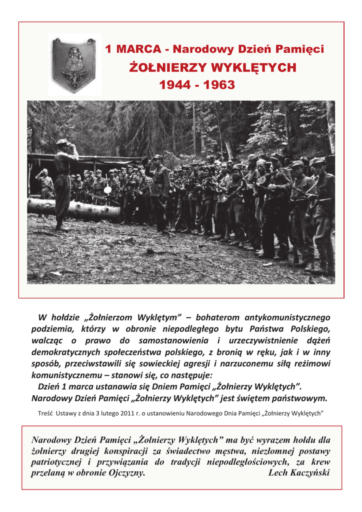 1 MARCA - Narodowy Dzień Pamięci ŻOŁNIERZY WYKLĘTYCH 1944 - 1963 W hołdzie „Żołnierzom Wyklętym” – bohaterom antykomunistycznego podziemia, którzy w obronie niepodległego bytu Państwa Polskiego, walcząc o prawo do samostanowienia i urzeczywistnienie dążeń demokratycznych społeczeństwa polskiego, z bronią w ręku, jak i w inny sposób, przeciwstawili się sowieckiej agresji i narzuconemu siłą reżimowi komunistycznemu – stanowi się, co następuje: Dzień 1 marca ustanawia się Dniem Pamięci „Żołnierzy Wyklętych”. Narodowy Dzień Pamięci „Żołnierzy Wyklętych” jest świętem państwowym. Treść Ustawy z dnia 3 lutego 2011 r. o ustanowieniu Narodowego Dnia Pamięci „Żołnierzy Wyklętych” Narodowy Dzień Pamięci „Żołnierzy Wyklętych” ma być wyrazem hołdu dla żołnierzy drugiej konspiracji za świadectwo męstwa, niezłomnej postawy patriotycznej i przywiązania do tradycji niepodległościowych, za krew przelaną w obronie Ojczyzny. Lech Kaczyński INSTYTUT PAMIĘCI NARODOWEJ - Geneza Dnia „1 marca” WALKA O PAMIĘĆ I CZEŚĆ … Wiele upłynęło czasu, nim 3 lutego 2011 roku Sejm uchwalił ustawę o ustanowieniu dnia 1 marca Narodowym Dniem Pamięci „Żołnierzy Wyklętych”. Środowiska kombatanckie, liczne organizacje patriotyczne, stowarzyszenia naukowe, przyjaciele i rodziny tych, którzy polegli w boju, zostali zamordowani w komunistycznych więzieniach lub po prostu odeszli już na wieczną wartę, od lat pukali do wielu drzwi z żądaniami, by wolna Polska oddała w końcu hołd swym najlepszym Synom. Przez lata odpowiedzią była cisza. W drugiej połowie pierwszej dekady XXI wieku nadzieje zaczęły się spełniać. Apele środowisk kombatanckich zaczęły zyskiwać coraz większe poparcie. Janusz Kurtyka, prezes IPN, od końca roku 2005, nadał tym staraniom silny impuls i przyspieszenie. Między innymi 19 listopada 2008 roku podczas spotkania w Instytucie Historycznym Uniwersytetu Wrocławskiego, z udziałem wiceprezydenta Opola Arkadiusza Karbowiaka i pełnomocnika wojewody opolskiego ds. kombatantów i osób represjonowanych Bogdana Bocheńskiego, postanowiono zorganizować 1 marca 2009 roku w Opolu Dzień Żołnierza Antykomunistycznego. W liście do prezydenta Opola Ryszarda Zembaczyńskiego prezes Janusz Kurtyka napisał, że uroczystość oddania hołdu członkom zbrojnych organizacji niepodległościowych, walczących po II wojnie światowej z organami komunistycznego państwa, powinna wpisać się na stałe do kalendarza uroczystości państwowych. 28 lutego 2009 z inicjatywy prezesa Janusza Kurtyki i Jerzego Szmida na I. Walnym Zgromadzeniu Stowarzyszenia NZS 1980 podjęta została uchwała popierająca inicjatywę Światowego Związku Żołnierzy Armii Krajowej, ustanowienia dnia 1 marca dniem „Żołnierzy Wyklętych”. Data 1 marca nie jest przypadkowa. Tego dnia w 1951 w mokotowskim więzieniu komuniści strzałem w tył głowy zamordowali przywódców IV Zarządu Zrzeszenia Wolność i Niezawisłość – Łukasza Cieplińskiego i jego towarzyszy walki. Tworzyli ostatnie kierownictwo ostatniej ogólnopolskiej konspiracji kontynuującej dzieło AK. Zajęcie Polski przez Armię Czerwoną i włączenie połowy jej terytorium do ZSRS sprawiło, że dziesiątki tysięcy żołnierzy nie złożyło broni. Gotowi byli walczyć o odzyskanie niepodległości, wypełnić złożoną przysięgę. Powojenna konspiracja niepodległościowa była – aż do powstania Solidarności – najliczniejszą formą zorganizowanego oporu społeczeństwa polskiego wobec narzuconej władzy. W roku największej aktywności zbrojnego podziemia, 1945, działało w nim bezpośrednio 150-200 tysięcy konspiratorów zgrupowanych w oddziałach o bardzo różnej orientacji. Dwadzieścia tysięcy z nich walczyło w oddziałach partyzanckich. Kolejnych kilkaset tysięcy stanowili ludzie zapewniający partyzantom aprowizację, wywiad, schronienie i łączność. Doliczyć trzeba jeszcze około dwudziestu tysięcy uczniów z podziemnych organizacji młodzieżowych, sprzeciwiających się komunistom. Łącznie daje to grupę ponad pół miliona ludzi tworzących społeczność Żołnierzy Wyklętych. Ostatni „leśny” żołnierz ZWZ-AK, a później WiN – Józef Franczak „Laluś” zginął w walce w październiku 1963 roku. Na niespełna dwa miesiące przed śmiercią w katastrofie smoleńskiej prezes Janusz Kurtyka mówił „Rzeczpospolitej” o motywach swego i IPN zaangażowania w przywracanie pamięci o żołnierzach antykomunistycznego podziemia: Tradycję niepodległościową uważamy za jeden z najważniejszych elementów tożsamości naszego państwa. Poza tym czyn zbrojna i antykomunistyczna działalność w imię niepodległości po drugiej wojnie światowej funkcjonują w społecznej świadomości w stopniu niedostatecznym i często w sposób zafałszowany, co jest skutkiem konsekwentnej polityki władz PRL. Komuniści robili wszystko, by zohydzić żołnierzy niepodległej Polski oraz ich walkę… To oczywiste, że tak jak kultywujemy pamięć o Polskim Państwie Podziemnym, tak powinniśmy również pamiętać o czynie żołnierzy konspiracji antykomunistycznej. Bo to była walka o niepodległość. Zdecydowanego poparcia idei Dnia Pamięci udzielał Prezydent Lech Kaczyński. To on ostatecznie skierował do Sejmu projekt ustawy w tej sprawie. Narodowy Dzień Pamięci „Żołnierzy Wyklętych” to także wyraz hołdu licznym społecznościom lokalnym, których patriotyzm i stała gotowość ofiar na rzecz idei niepodległościowej pozwoliły na kontynuację oporu na długie lata – czytamy między innymi w uzasadnieniu projektu. Uchwalenie Narodowego Dnia Pamięci Żołnierzy Wyklętych jest formą uczczenia ich walki i ofiary, ale także bólu i cierpienia, jakich doznawali przez wszystkie lata www.wykleci.ipn.gov.pl PRL i ciszy po 1989 roku. PAMIĘTAJMY O BOHATERACH! Ponieważ żyli prawem wilka historia o 