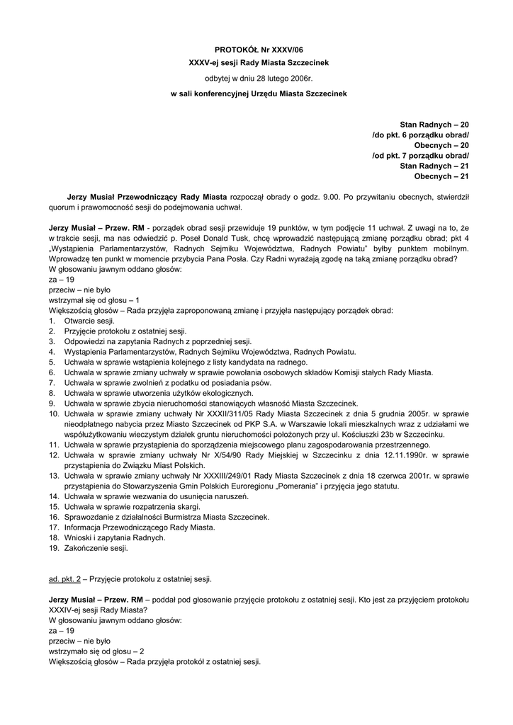 PROTOKÓŁ Nr XXXV/06 XXXV-ej sesji Rady Miasta Szczecinek odbytej w dniu 28 lutego 2006r. w sali konferencyjnej Urzędu Miasta Szczecinek Stan Radnych – 20 /do pkt. 6 porządku obrad/ Obecnych – 20 /od pkt. 7 porządku obrad/ Stan Radnych – 21 Obecnych – 21 Jerzy Musiał Przewodniczący Rady Miasta rozpoczął obrady o godz. 9.00. Po przywitaniu obecnych, stwierdził quorum i prawomocność sesji do podejmowania uchwał. Jerzy Musiał – Przew. RM - porządek obrad sesji przewiduje 19 punktów, w tym podjęcie 11 uchwał. Z uwagi na to, że w trakcie sesji, ma nas odwiedzić p. Poseł Donald Tusk, chcę wprowadzić następującą zmianę porządku obrad; pkt 4 „Wystąpienia Parlamentarzystów, Radnych Sejmiku Województwa, Radnych Powiatu” byłby punktem mobilnym. Wprowadzę ten punkt w momencie przybycia Pana Posła. Czy Radni wyrażają zgodę na taką zmianę porządku obrad? W głosowaniu jawnym oddano głosów: za – 19 przeciw – nie było wstrzymał się od głosu – 1 Większością głosów – Rada przyjęła zaproponowaną zmianę i przyjęła następujący porządek obrad: 1. Otwarcie sesji. 2. Przyjęcie protokołu z ostatniej sesji. 3. Odpowiedzi na zapytania Radnych z poprzedniej sesji. 4. Wystąpienia Parlamentarzystów, Radnych Sejmiku Województwa, Radnych Powiatu. 5. Uchwała w sprawie wstąpienia kolejnego z listy kandydata na radnego. 6. Uchwala w sprawie zmiany uchwały w sprawie powołania osobowych składów Komisji stałych Rady Miasta. 7. Uchwała w sprawie zwolnień z podatku od posiadania psów. 8. Uchwała w sprawie utworzenia użytków ekologicznych. 9. Uchwała w sprawie zbycia nieruchomości stanowiących własność Miasta Szczecinek. 10. Uchwała w sprawie zmiany uchwały Nr XXXII/311/05 Rady Miasta Szczecinek z dnia 5 grudnia 2005r. w sprawie nieodpłatnego nabycia przez Miasto Szczecinek od PKP S.A. w Warszawie lokali mieszkalnych wraz z udziałami we współużytkowaniu wieczystym działek gruntu nieruchomości położonych przy ul. Kościuszki 23b w Szczecinku. 11. Uchwała w sprawie przystąpienia do sporządzenia miejscowego planu zagospodarowania przestrzennego. 12. Uchwała w sprawie zmiany uchwały Nr X/54/90 Rady Miejskiej w Szczecinku z dnia 12.11.1990r. w sprawie przystąpienia do Związku Miast Polskich. 13. Uchwała w sprawie zmiany uchwały Nr XXXIII/249/01 Rady Miasta Szczecinek z dnia 18 czerwca 2001r. w sprawie przystąpienia do Stowarzyszenia Gmin Polskich Euroregionu „Pomerania” i przyjęcia jego statutu. 14. Uchwała w sprawie wezwania do usunięcia naruszeń. 15. Uchwała w sprawie rozpatrzenia skargi. 16. Sprawozdanie z działalności Burmistrza Miasta Szczecinek. 17. Informacja Przewodniczącego Rady Miasta. 18. Wnioski i zapytania Radnych. 19. Zakończenie sesji. ad. pkt. 2 – Przyjęcie protokołu z ostatniej sesji. Jerzy Musiał – Przew. RM – poddał pod głosowanie przyjęcie protokołu z ostatniej sesji. Kto jest za przyjęciem protokołu XXXIV-ej sesji Rady Miasta? W głosowaniu jawnym oddano głosów: za – 19 przeciw – nie było wstrzymało się od głosu – 2 Większością głosów – Rada przyjęła protokół z ostatniej sesji. ad. pkt. 3 – Odpowiedzi na zapytania Radnych z poprzedniej sesji. Tomasz Piesik - Radny T. Bobryk pytał co dalej z pawilonami, usytuowanymi przy stacji paliw u zbiegu ulic Koszalińskiej i Polnej; czy umowy dzierżawy zostały przedłużone. Na tym terenie w 2005 r. obowiązywały cztery umowy dzierżawne, w tym jeden pawilon na podmurówce. Burmistrz podjął decyzję o przedłużeniu wszystkich umów dzierżawy. Jedna z osób w lutym zrezygnowała z tej umowy i z prowadzenia działalności gospodarczej. Na terenie tym znajduje się też pawilon murowany i umowa pod ten teren nie obowiązywała już w 2005 r. Osoba ta przeniosła działalność w inne miejsce, pawilon przekazała miastu. Burmistrz Miasta podjął decyzję, żeby ten pawilon wydzierżawić w trybie przetargu nieograniczonego. Anna Mista - odpowiadam na pytanie Radnej T. Machnik dotyczące organizacji ruchu na odcinku ul. Kamiennej. Otóż, miasto Szczecinek już kilkakrotnie poruszało tą sprawę na komisjach organizacji ruchu, ale wygląda to jak wygląda. Myśmy rozważali możliwość wykonania tam kilku zatok parkingowych. Z uwagi na własności gruntowe, na pas należący do pasa drogowego, na bliskość okien budynku, nie ma możliwości stworzenia miejsc parkingowych. W związku z tym, na najbliższym spotkaniu dot. zmiany organizacji ruchu drogowego, zaproponujemy wprowadzenie na ul. Kamiennej ruchu jednokierunkowego, natomiast w roku następnym postaramy się o dobudowanie poza pasem zieleni chodnika. Teresa Machnik - chcę powiedzieć, że uliczki obok mają parkingi przy krawężnikach. Stworzenie tam ruchu jednokierunkowego wcale nie poprawi sytuacji dla poruszających się samochodów, a na sąsiednich uliczkach będzie to samo, co na ul. Kamiennej. Jerzy Hardie- Douglas - myśmy tą sprawę analizowali dokładnie i tam naprawdę nie ma możliwości zrobienia zatoczek, natomiast z całą pewnością ruch jednokierunkowy dla tej ulicy równoległej, w dwóch przeciwległych kierunkach sprawę rozwiąże. Jest tam taki ruch wahadłowy, jadąc z ul. Ar. Krajowej czeka się na to czy z ul. Kamiennej ktoś nie wjedzie, ponieważ po lewej stronie stoi sznur samochodów. Zrobienie ulicy, która będzie tylko kierowała ruch w stronę ul. Ar. Krajowej, to następną ulicą będzie można dojechać do ul. Chełmińskiej, zwłaszcza, że jest tam także ul. Kochanowskiego. Na pewno nie jest to rozwiązanie idealne, ale takie, które spowoduje poprawę drożności tych ulic. Teresa Machnik - samochody parkowane są tylko po jednej stronie. Bloki te stoją już 30 lat i chodnika tam nie ma, bo istniejący z drugiej strony wystarcza, więc można stworzyć z lewej strony zatoczki. Jerzy Musiał – Przew. RM - ten problem pod rozwagę przy zmianie organizacji ruchu. ad. pkt. 5 – Uchwała w sp