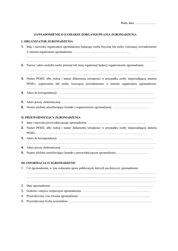 Biała, dnia ................................… ZAWIADOMIENIE O ZAMIARZE ZORGANIZOWANIA ZGROMADZENIA I. ORGANIZATOR ZGROMADZENIA 1. Imię i nazwisko organizatora zgromadzenia będącego osobą fizyczną lub osoby wnoszącej zawiadomienie w imieniu organizatora zgromadzenia: ……………………………………………………..………. …………………………………………………………………….………………………………………………………………………… …………………………………………………………………...………………………………………………………………………….. 2. Nazwa i adres siedziby osoby prawnej lub innej organizacji będącej organizatorem zgromadzenia: ………………………………………………………………………………………….…………………………………………………… ……………………………………………………………………………………………...……………………………………………….. 3. Numer PESEL albo rodzaj i numer dokumentu tożsamości w przypadku osoby nieposiadającej numeru PESEL, organizatora lub osoby wnoszącej zawiadomienie w imieniu organizatora zgromadzenia: ………………………………………………………………………………………………………………………... 4. Adres do korespondencji: ………………………………………………………………………..………………………………. ………………………………………………………………………….…………………………………………………………………… 5. Adres poczty elektronicznej: …………………………………….…………………………………………………..………….. 6. Numer telefonu umożliwiający kontakt z organizatorem zgromadzenia: ……………………………………… II. PRZEWODNICZĄCY ZGROMADZENIA 1. Imię i nazwisko przewodniczącego zgromadzenia: ………………………………..…………………………….. 2. Numer PESEL albo rodzaj i numer dokumentu tożsamości w przypadku osoby nieposiadającej numeru PESEL: ………………………………………………………….…………………………………………….…………….. 3. Adres do korespondencji: ………………………………………………….……………………………..……………………… ………………………………………………………………………….…………………………………………………………………… 4. Adres poczty elektronicznej: ……………………………………………………………………………………………………. 5. Numer telefonu umożliwiający kontakt z przewodniczącym zgromadzenia: ………………………………… III. INFORMACJA O ZGROMADZENIU 1. Cel zgromadzenia, w tym wskazanie spraw publicznych, których ma dotyczyć zgromadzenie: ………………………………………………………………………….…………………………………………………………………… ………………………………………………………………………….…………………………………………………………………… ………………………………………………………………………….…………………………………………………………………… 2. Data zgromadzenia: ……………………………………………………………………………………………………………….. 3. Godzina i miejsce rozpoczęcia zgromadzenia: ………………………………………………………..…………………. 4. Przewidywany czas trwania zgromadzenia: …………………………………………………….………………………. 5. Przewidywana liczba uczestników: ………………………………………………………………………………………….. 6. Planowana trasa przejścia zgromadzenia ze wskazaniem miejsca zakończenia zgromadzenia: ……………………………………………………………………………………………………………………………………………… ……………………………………………………………………………………………………………………………...…………….. ……………………………………………………………………………………………………………………………………………… …………………………………………………………………………………………………………………………………………… 7. Planowane przez organizatora zgromadzenia środki służące zapewnieniu pokojowego przebiegu zgromadzenia: …………………………………………………………………………………….………………………………… ……………………………………………………………………………………………………………………………………………… ……………………………………………………………………………………………………………………………...…………….. ……………………………………………………………………………………………………………………………………………… …………………………………………………………………………………………………………………………………………… Wyrażam zgodę na przetwarzanie danych osobowych zawartych w zawiadomieniu przez Urząd Miejski w Białej zgodnie z ustawą z dnia 29 sierpnia 1997 r. o ochronie danych osobowych (Dz. U. z 