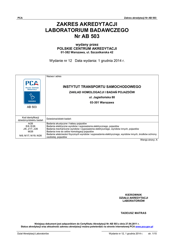 Zakres akredytacji - Instytut Transportu Samochodowego