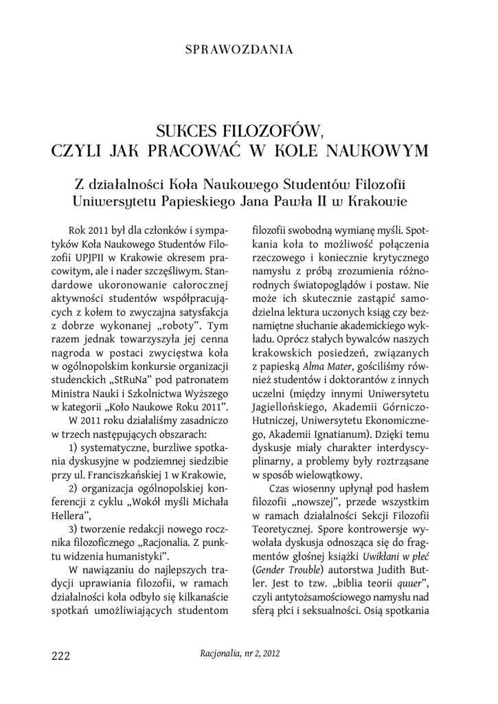 SP R AWO ZDAN I A SUKCES FILOZOFÓW, CZYLI JAK PRACOWAĆ W KOLE NAUKOWYM Z działalności Koła Naukowego Studentów Filozofii Uniwersytetu Papieskiego Jana Pawła II w Krakowie Rok 2011 był dla członków i sympatyków Koła Naukowego Studentów Filozofii UPJPII w Krakowie okresem pracowitym, ale i nader szczęśliwym. Standardowe ukoronowanie całorocznej aktywności studentów współpracujących z kołem to zwyczajna satysfakcja z dobrze wykonanej „roboty”. Tym razem jednak towarzyszyła jej cenna nagroda w postaci zwycięstwa koła w ogólnopolskim konkursie organizacji studenckich „StRuNa” pod patronatem Ministra Nauki i Szkolnictwa Wyższego w kategorii „Koło Naukowe Roku 2011”. W 2011 roku działaliśmy zasadniczo w trzech następujących obszarach: 1) systematyczne, burzliwe spotkania dyskusyjne w podziemnej siedzibie przy ul. Franciszkańskiej 1 w Krakowie, 2) organizacja ogólnopolskiej konferencji z cyklu „Wokół myśli Michała Hellera”, 3) tworzenie redakcji nowego rocznika filozoficznego „Racjonalia. Z punktu widzenia humanistyki”. W nawiązaniu do najlepszych tradycji uprawiania filozofii, w ramach działalności koła odbyło się kilkanaście spotkań umożliwiających studentom 222 filozofii swobodną wymianę myśli. Spotkania koła to możliwość połączenia rzeczowego i koniecznie krytycznego namysłu z próbą zrozumienia różnorodnych światopoglądów i postaw. Nie może ich skutecznie zastąpić samodzielna lektura uczonych ksiąg czy beznamiętne słuchanie akademickiego wykładu. Oprócz stałych bywalców naszych krakowskich posiedzeń, związanych z papieską Alma Mater, gościliśmy również studentów i doktorantów z innych uczelni (między innymi Uniwersytetu Jagiellońskiego, Akademii GórniczoHutniczej, Uniwersytetu Ekonomicznego, Akademii Ignatianum). Dzięki temu dyskusje miały charakter interdyscyplinarny, a problemy były roztrząsane w sposób wielowątkowy. Czas wiosenny upłynął pod hasłem filozofii „nowszej”, przede wszystkim w ramach działalności Sekcji Filozofii Teoretycznej. Spore kontrowersje wywołała dyskusja odnosząca się do fragmentów głośnej książki Uwikłani w płeć (Gender Trouble) autorstwa Judith Butler. Jest to tzw. „biblia teorii quuer”, czyli antytożsamościowego namysłu nad sferą płci i seksualności. Osią spotkania Racjonalia, nr 2, 2012 Sprawozdania miała być w założeniu myśl francuskiej filozof Julii Kristevej, referowana przez Butler w kontekście „polityki ciała”, jednakowoż już sam temat spotkania – Lacanowskie sformułowanie „Kobieta nie istnieje” – nakierował je na inne tory. Uczestnicy poruszali bardzo różnorodne kwestie, od sensowności ruchów feministycznych we współczesnej Europie, przez esencjalistyczne pojmowanie narodowości czy ras, aż po problemy małżeństw homoseksualnych czy homoadopcji. Dyskutanci dalecy byli od wypracowania konsensusu zamykającego burzliwą dyskusję. Obrady spełniły jednak funkcję integracyjną: pozwoliły lepiej poznać się nowym członkom koła z tymi o dłuższym stażu. Inne istotne spotkanie odbyło się raptem dwa tygodnie później, 19 kwietnia 2011. By odświeżyć formułę, tym razem poświęcone zostało filozoficznemu namysłowi nad filmem. Sięgnęliśmy po fragmenty obrazu: Przebudzenia, opartego na książce Olivera Sacksa. Temat spotkania brzmiał: „Pożyczyć siłę woli. O ludziach manekinach. Ciało bez ducha czy duch zamknięty w ciele?”. Dyskutowaliśmy kwestie granic osoby, duchowych (a może psychicznych?) aspektów człowieczeństwa, a także tytułowej wolnej woli. Podczas jednego z czerwcowych spotkań zastanawialiśmy się, czym/kim jest autor (Qu’est-ce qu’un auteur?), bazując na tekście Michela Foucaulta. To pozornie naiwne pytanie wywołało ożywioną dyskusję dotyczącą tego, jak rozumieć tekst pisany, jakie są granice przypisywania znaczeń i sensów, na czym polega „uteoretyzowanie” odbioru oraz czy możliwe jest odgraniczenie interpretacji lepszych od mniej trafnych. Inne spotkanie dotyczyło kwestii stricte estetycznych; „poszukiwaliśmy” piękna w sztuce współczesnej, zastanawiając się nad rolą, jaką obecnie mogłyby pełnić klasyczne pojęcia estetyki. Równolegle Sekcja Estetyki poszukiwała odpowiedzi na podobne pytania nie tylko w tekstach, ale także podczas spotkań w galeriach, kinach i na koncertach. Jesienne wieczory spędzaliśmy chętniej na dyskusjach obracających się wokół wątków klasycznych. Październik 2011 to początek warsztatów „Czytanie Platona po grecku”, organizowanych przez Sekcję Filozofii Starożytnej wspólnie z Instytutem Filologii Klasycznej UJ. Sekcja Filozofii Teoretycznej pytała: dlaczego ludzie są dobrzy? oraz – nieco przewrotnie – skoro ludzie są dobrzy, skąd zło...? Część uczestników dostrzegła potencjał ironiczny tkwiący w takim postawieniu sprawy, gdyż z owego sformułowania można wysnuć wniosek, iż problem unde malum w kontekście moralnym jest pozbawiony sensu, skoro wszyscy dobrze wiemy, jakie są źródła tak pojmowanego zła: stanowią je po prostu postępki ludzi. Zderzenie różnych perspektyw podczas dyskusji o dobru i złu skłoniło do zadania bardziej ogólnego pytania: jak filozofować nad światem? Poszukiwanie własnych intuicji w obliczu ogromnej literatury na ten temat może się wydawać nieco naiwne, odpowiada jednak najgłębszej istocie filozofii: jest nią próba indywidualnego zmierzenia się Racjonalia, nr 2, 2012 223 Sprawozdania z rzeczywistością oraz znalezienia w niej swojego (wyjątkowego) miejsca. Coroczne kartki z kalendarza to rozpoznawalna w środowisku studenckim i naukowym konferencja z cyklu „Wokół myśli Michała Hellera”. Dwa dni zimowych obrad poprzedziły długie tygodnie przygotowań: wybór tematu konferencji, zaproszenie gości specjalnych, przeprowadzenie procedury kwalifikowania zgłoszeń oraz opracowanie materiałów