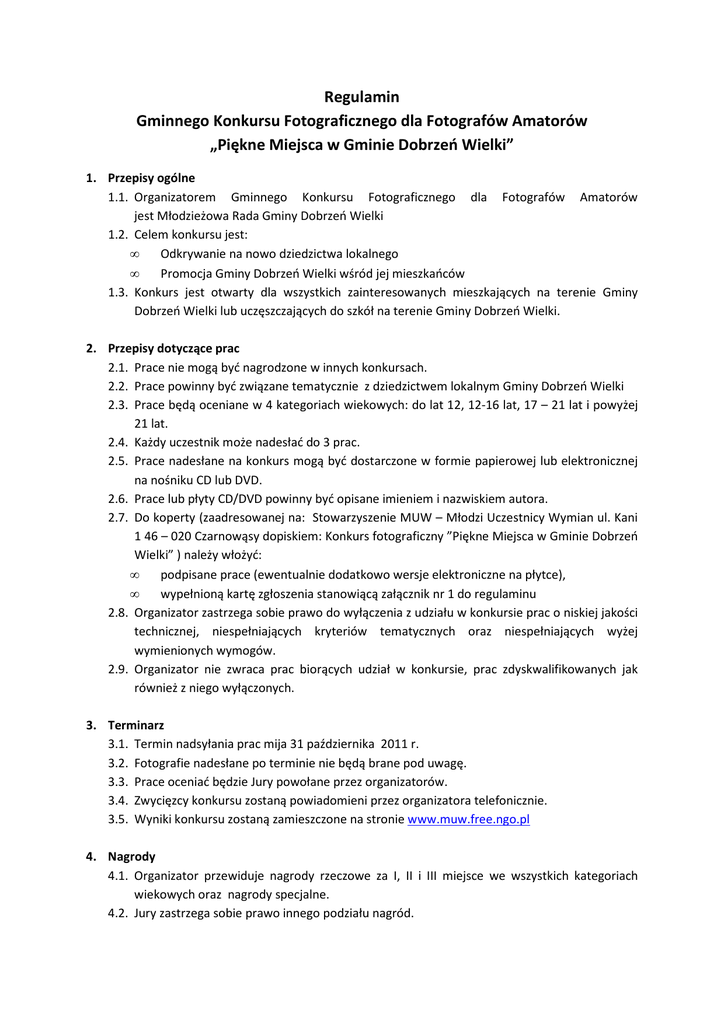 Regulamin Gminnego Konkursu Fotograficznego dla Fotografów Amatorów „Piękne Miejsca w Gminie Dobrzeń Wielki” 1. Przepisy ogólne 1.1. Organizatorem Gminnego Konkursu Fotograficznego dla Fotografów Amatorów jest Młodzieżowa Rada Gminy Dobrzeń Wielki 1.2. Celem konkursu jest: • Odkrywanie na nowo dziedzictwa lokalnego • Promocja Gminy Dobrzeń Wielki wśród jej mieszkańców 1.3. Konkurs jest otwarty dla wszystkich zainteresowanych mieszkających na terenie Gminy Dobrzeń Wielki lub uczęszczających do szkół na terenie Gminy Dobrzeń Wielki. 2. Przepisy dotyczące prac 2.1. Prace nie mogą być nagrodzone w innych konkursach. 2.2. Prace powinny być związane tematycznie z dziedzictwem lokalnym Gminy Dobrzeń Wielki 2.3. Prace będą oceniane w 4 kategoriach wiekowych: do lat 12, 12-16 lat, 17 – 21 lat i powyżej 21 lat. 2.4. Każdy uczestnik może nadesłać do 3 prac. 2.5. Prace nadesłane na konkurs mogą być dostarczone w formie papierowej lub elektronicznej na nośniku CD lub DVD. 2.6. Prace lub płyty CD/DVD powinny być opisane imieniem i nazwiskiem autora. 2.7. Do koperty (zaadresowanej na: Stowarzyszenie MUW – Młodzi Uczestnicy Wymian ul. Kani 1 46 – 020 Czarnowąsy dopiskiem: Konkurs fotograficzny ”Piękne Miejsca w Gminie Dobrzeń Wielki” ) należy włożyć: • podpisane prace (ewentualnie dodatkowo wersje elektroniczne na płytce), • wypełnioną kartę zgłoszenia stanowiącą załącznik nr 1 do regulaminu 2.8. Organizator zastrzega sobie prawo do wyłączenia z udziału w konkursie prac o niskiej jakości technicznej, niespełniających kryteriów tematycznych oraz niespełniających wyżej wymienionych wymogów. 2.9. Organizator nie zwraca prac biorących udział w konkursie, prac zdyskwalifikowanych jak również z niego wyłączonych. 3. Terminarz 3.1. Termin nadsyłania prac mija 31 października 2011 r. 3.2. Fotografie nadesłane po terminie nie będą brane pod uwagę. 3.3. Prace oceniać będzie Jury powołane przez organizatorów. 3.4. Zwycięzcy konkursu zostaną powiadomieni przez organizatora telefonicznie. 3.5. Wyniki konkursu zostaną zamieszczone na stronie www.muw.free.ngo.pl 4. Nagrody 4.1. Organizator przewiduje nagrody rzeczowe za I, II i III miejsce we wszystkich kategoriach wiekowych oraz nagrody specjalne. 4.2. Jury zastrzega sobie prawo innego podziału nagród. 5. Wykorzystanie prac 5.1. Organizator uzyskuje prawo do umieszczania nadesłanych na konkurs prac (oznaczonych imieniem i nazwiskiem autora) na stronie Stowarzyszenia MUW i na stronie Gminy Dobrzeń Wielki. 5.2. Organizator uzyskuje prawo do prezentowania zdjęć na okolicznościowych wystawach, materiałach promujących konkurs oraz w artykułach pokonkursowych. 5.3. Nadesłanie prac na konkurs jest równoznaczne z oświadczeniem posiadania praw autorskich do zdjęć i akceptację niniejszego regulaminu oraz zgody na publikacje materiałów multimedialnych z przebiegu konkursu (w tym wizerunku fotografowanych osób). 6. Informacje dodatkowe 6.1. Organizator zastrzega sobie prawo do wprowadzania zmian w regulaminie do dnia zakończenia nadsyłania prac konkursowych. Ewentualne zmiany regulaminu będą ogłaszane na stronie internetowej www.muw.free.ngo.pl. 6.2. Sytuacje nieobjęte niniejszym regulaminem rozstrzyga organizator konkursu 7. Kontakt do osób odpowiedzialnych: Joanna Świercz e-mail: [email protected] Załącznik nr 1 Zgłoszenie do Gminnego Konkursu Fotograficznego dla Fotografów Amatorów „Piękne Miejsca w Gminie Dobrzeń Wielki” INFORMACJE O UCZESTNIKU Imię i nazwisko: ...................................................................................................... Data urodzenia: ..................................................................................................... Telefon kontaktowy: .............................................................................................. Podpis uczestnika lub opiekuna prawnego: ………………………………………………………………. Indeks prac: TYTUŁ 1: ………………………………………………………………………………………………………………… TYTUŁ 2: ………………………………………………………………………………………………………………… TYTUŁ 3: ………………………………………………………………………………………………………………… SZKOŁA MŁODYCH OBYWATELI STOWARZYSZENIE MUW – MŁODZI UCZESTNICY WYMIAN MŁODZIEŻOWA RADA GMINY DOBRZEŃ WIELKI