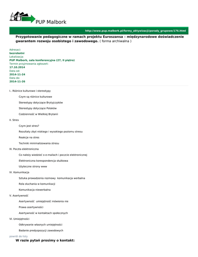 PUP Malbork http://www.pup.malbork.pl/formy_aktywizacji/porady_grupowe/176.html Przygotowanie pedagogiczne w ramach projektu Euroszansa – międzynarodowe doświadczenie gwarantem rozwoju osobistego i zawodowego. ( forma archiwalna ) Adresaci: bezrobotni Lokalizacja: PUP Malbork, sala konferencyjna (27, II piętro) Termin przyjmowania zgłoszeń: 17.10.2014 Data od: 2014-11-24 Data do: 2014-11-26 I.. Różnice kulturowe i stereotypy Czym są różnice kulturowe Stereotypy dotyczące Brytyjczyków Stereotypy dotyczące Polaków Codzienność w Wielkiej Brytanii II. Stres Czym jest stres? Rezultaty zbyt niskiego i wysokiego poziomu stresu Reakcje na stres Techniki minimalizowania stresu III. Poczta elektroniczna Co należy wiedzieć o e-mailach i poczcie elektronicznej Elektroniczna korespondencja służbowa Użyteczne strony www IV. Komunikacja Sztuka prowadzenia rozmowy komunikacja werbalna Rola słuchania w komunikacji Komunikacja niewerbalna V. Asertywność Asertywność umiejętność mówienia nie Prawa asertywności Asertywność w kontaktach społecznych VI. Umiejętności Odkrywanie własnych umiejętności Badanie predyspozycji zawodowych powrót do listy W razie pytań prosimy o kontakt: Imię i nazwisko Stanowisko Kontakt do pracownika urzędu Telefon (55) 272 33 51 w. 330 - pokój nr 22 (55) 272 33 51 w. 313 - pokój nr 23 Adres e-mail