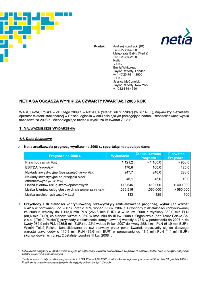 Netia zrealizowała prognozę wyników na 2008 r., raportując następujące dane: