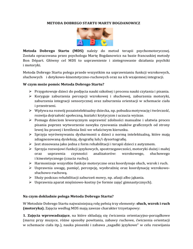 METODA DOBREGO STARTU MARTY BOGDANOWICZ Metoda Dobrego Startu (MDS) należy do metod terapii psychomotorycznej. Została opracowana przez psychologa Martę Bogdanowicz na bazie francuskiej metody Bon Départ. Główny cel MDS to usprawnienie i zintegrowanie działania psychiki i motoryki. Metoda Dobrego Startu polega przede wszystkim na usprawnianiu funkcji wzrokowych, słuchowych i dotykowo-kinestetyczno-ruchowych oraz na ich wzajemnej integracji. W czym może pomóc Metoda Dobrego Startu? Przygotowuje dzieci do podjęcia nauki szkolnej i procesu nauki czytania i pisania. Koryguje zaburzenia percepcji wzrokowej i słuchowej, zaburzenia motoryki, zaburzenia integracji sensorycznej oraz zaburzenia orientacji w schemacie ciała i przestrzeni. Wpływa na rozwój pozaintelektualny dziecka, np. pobudza motywację i twórczość, rozwija dojrzałość społeczną, kształci krytycyzm i uczucia wyższe. Pomaga dzieciom leworęcznym usprawnić zdolności manualne i ułatwia proces pisania poprzez wytworzenie nawyku rysowania znaków graficznych od strony lewej ku prawej i kreślenia linii we właściwym kierunku. Sprzyja wyrównywaniu dysharmonii u dzieci z normą intelektualną, które mają zdiagnozowaną dysleksję, dysgrafię lub/i dysortografię. Jest stosowana jako jedna z form rehabilitacji i terapii dzieci z autyzmem. Sprzyja rozwojowi funkcji językowych, spostrzegawczości, motoryki dużej i małej oraz usprawnia czynności analizatorów: wzrokowego, słuchowego i kinestetycznego (czucia ruchu). Harmonizuje wszystkie funkcje motoryczne oraz koordynuje słuch, wzrok i ruch. Usprawnia uwagę, pamięć, percepcję, wyobraźnię oraz koordynację wzrokowosłuchowo-ruchową. Służy podczas rehabilitacji zaburzeń mowy, np. afazji albo jąkania. Usprawnia aparat mięśniowo-kostny (w formie zajęć gimnastycznych). Na czym dokładnie polega Metoda Dobrego Startu? W Metodzie Dobrego Startu najważniejszą rolę pełnią trzy elementy: słuch, wzrok i ruch (motoryka). Zajęcia według MDS mają zawsze charakter trzyetapowy: 1. Zajęcia wprowadzające, na które składają się ćwiczenia orientacyjno-porządkowe (marsz przy muzyce, różne sposoby powitania, zabawy ruchowe, ćwiczenia orientacji w schemacie ciała itp.), nauka piosenki i zabawa „zagadki językowe” w celu rozwijania kompetencji językowych (wyjaśnienie trudnych słów, rozmowa na temat treści piosenki, dzielenie słów na sylaby, głoski i litery itp.); 2. Zajęcia właściwe, które dzielą się na: Ćwiczenia ruchowe – zabawy ruchowe do treści piosenki; należy zacząć od ruchów całego ciała (motoryki dużej), a potem przejść do ruchów precyzyjnych, np. ręki (motoryki małej); Ćwiczenia ruchowo-słuchowe – angażują analizator kinestetyczny i słuchowy; dzieci mogą wystukiwać rytm słyszanej piosenki, rzucać do siebie woreczkami wypełnionymi grochem w sytuacji usłyszenia określonego słowa w piosence itp.; można używać różnych pomocy, jak: sznurki, szarfy, balony, kolorowe chusteczki, wstążki, gumy; Ćwiczenia ruchowo-słuchowo-wzrokowe – polegają na odtwarzaniu ruchem wzorów graficznych (figur geometrycznych lub liter) w rytm jednocześnie śpiewanej piosenki; po demonstracji wzoru dziecko uczy się polisensorycznie (wielozmysłowo) przez dotyk, słuch, wzrok i ruch, np. dotyka palcem po fakturze narysowanego wzoru, rysuje wzór palcem w powietrzu, rysuje go na tackach z kaszą itp.; 3. Zajęcia końcowe mają charakter ćwiczeń relaksacyjnych (masaż, ćwiczenia oddechowe), wyciszających i wokalno-rytmicznych. Metoda Dobrego Startu ułatwia dzieciom start szkolny. Ćwiczenia ruchowo-słuchowowzrokowe usprawniają trzy analizatory – kinestetyczno-ruchowy, słuchowy i wzrokowy. Przede wszystkim MDS przynosi frajdę maluchom, a jak wiadomo, nauka przez zabawę daje najlepsze efekty, jeśli chodzi o kształcenie.