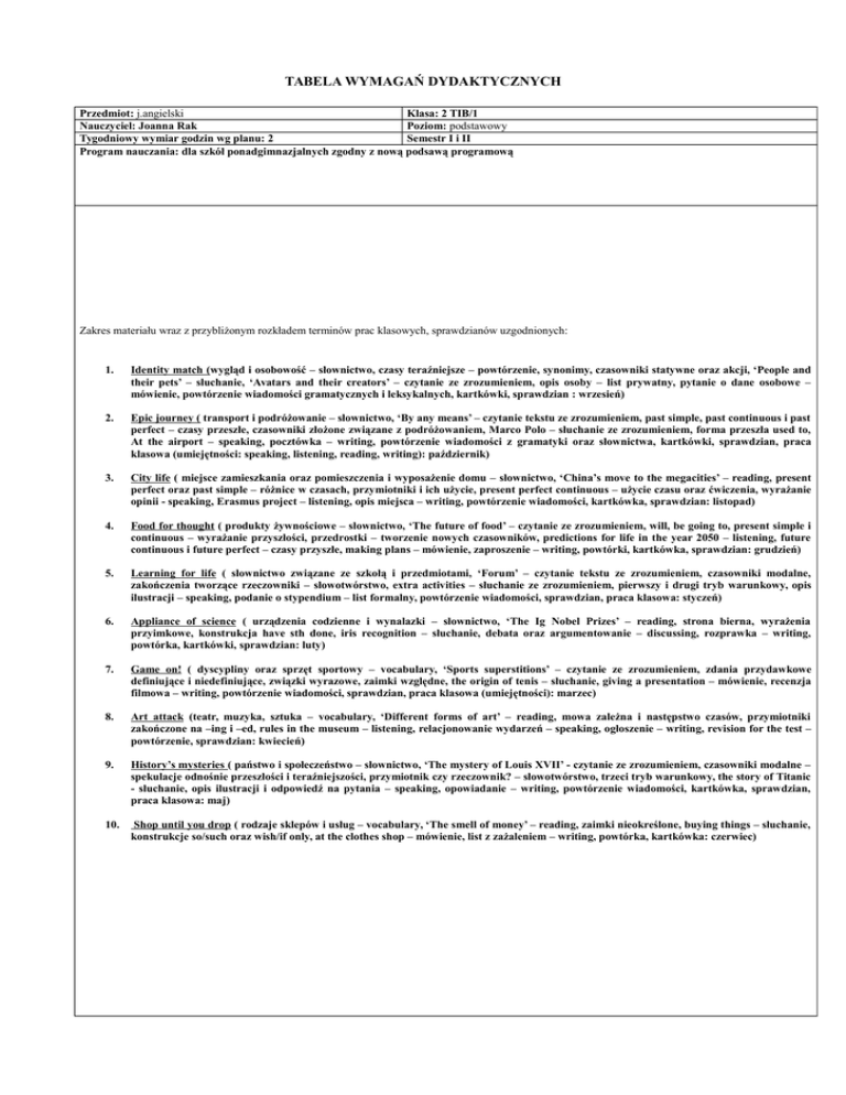 TABELA WYMAGAŃ DYDAKTYCZNYCH Przedmiot: j.angielski Klasa: 2 TIB/1 Nauczyciel: Joanna Rak Poziom: podstawowy Tygodniowy wymiar godzin wg planu: 2 Semestr I i II Program nauczania: dla szkół ponadgimnazjalnych zgodny z nową podsawą programową Zakres materiału wraz z przybliżonym rozkładem terminów prac klasowych, sprawdzianów uzgodnionych: 1. Identity match (wygląd i osobowość – słownictwo, czasy teraźniejsze – powtórzenie, synonimy, czasowniki statywne oraz akcji, ‘People and their pets’ – słuchanie, ‘Avatars and their creators’ – czytanie ze zrozumieniem, opis osoby – list prywatny, pytanie o dane osobowe – mówienie, powtórzenie wiadomości gramatycznych i leksykalnych, kartkówki, sprawdzian : wrzesień) 2. Epic journey ( transport i podróżowanie – słownictwo, ‘By any means’ – czytanie tekstu ze zrozumieniem, past simple, past continuous i past perfect – czasy przeszłe, czasowniki złożone związane z podróżowaniem, Marco Polo – słuchanie ze zrozumieniem, forma przeszła used to, At the airport – speaking, pocztówka – writing, powtórzenie wiadomości z gramatyki oraz słownictwa, kartkówki, sprawdzian, praca klasowa (umiejętności: speaking, listening, reading, writing): październik) 3. City life ( miejsce zamieszkania oraz pomieszczenia i wyposażenie domu – słownictwo, ‘China’s move to the megacities’ – reading, present perfect oraz past simple – różnice w czasach, przymiotniki i ich użycie, present perfect continuous – użycie czasu oraz ćwiczenia, wyrażanie opinii - speaking, Erasmus project – listening, opis miejsca – writing, powtórzenie wiadomości, kartkówka, sprawdzian: listopad) 4. Food for thought ( produkty żywnościowe – słownictwo, ‘The future of food’ – czytanie ze zrozumieniem, will, be going to, present simple i continuous – wyrażanie przyszłości, przedrostki – tworzenie nowych czasowników, predictions for life in the year 2050 – listening, future continuous i future perfect – czasy przyszłe, making plans – mówienie, zaproszenie – writing, powtórki, kartkówka, sprawdzian: grudzień) 5. Learning for life ( słownictwo związane ze szkołą i przedmiotami, ‘Forum’ – czytanie tekstu ze zrozumieniem, czasowniki modalne, zakończenia tworzące rzeczowniki – słowotwórstwo, extra activities – słuchanie ze zrozumieniem, pierwszy i drugi tryb warunkowy, opis ilustracji – speaking, podanie o stypendium – list formalny, powtórzenie wiadomości, sprawdzian, praca klasowa: styczeń) 6. Appliance of science ( urządzenia codzienne i wynalazki – słownictwo, ‘The Ig Nobel Prizes’ – reading, strona bierna, wyrażenia przyimkowe, konstrukcja have sth done, iris recognition – słuchanie, debata oraz argumentowanie – discussing, rozprawka – writing, powtórka, kartkówki, sprawdzian: luty) 7. Game on! ( dyscypliny oraz sprzęt sportowy – vocabulary, ‘Sports superstitions’ – czytanie ze zrozumieniem, zdania przydawkowe definiujące i niedefiniujące, związki wyrazowe, zaimki względne, the origin of tenis – słuchanie, giving a presentation – mówienie, recenzja filmowa – writing, powtórzenie wiadomości, sprawdzian, praca klasowa (umiejętności): marzec) 8. Art attack (teatr, muzyka, sztuka – vocabulary, ‘Different forms of art’ – reading, mowa zależna i następstwo czasów, przymiotniki zakończone na –ing i –ed, rules in the museum – listening, relacjonowanie wydarzeń – speaking, ogłoszenie – writing, revision for the test – powtórzenie, sprawdzian: kwiecień) 9. History’s mysteries ( państwo i społeczeństwo – słownictwo, ‘The mystery of Louis XVII’ - czytanie ze zrozumieniem, czasowniki modalne – spekulacje odnośnie przeszłości i teraźniejszości, przymiotnik czy rzeczownik? – słowotwórstwo, trzeci tryb warunkowy, the story of Titanic - słuchanie, opis ilustracji i odpowiedź na pytania – speaking, opowiadanie – writing, powtórzenie wiadomości, kartkówka, sprawdzian, praca klasowa: maj) 10. Shop until you drop ( rodzaje sklepów i usług – vocabulary, ‘The smell of money’ – reading, zaimki nieokreślone, buying things – słuchanie, konstrukcje so/such oraz wish/if only, at the clothes shop – mówienie, list z zażaleniem – writing, powtórka, kartkówka: czerwiec) Podręczniki obowiązkowe:Gateway plus 3 Zalecane dodatkowe pomoce dydaktyczne: Wymagania formalne: uczestnictwo w sprawdzianach Formy sprawdzania wiadomości: Inne źródła oceny do wyboru przez nauczyciela: praca klasowa poprzedzona lekcją powtórzeniową, zapowiadana praca na lekcji, z tygodniowym wyprzedzeniem, udział w konkursach przedmiotowych, sprawdzian pisemny z zamkniętej partii materiału, zapowiadany udział w olimpiadach, z co najmniej tygodniowym wyprzedzeniem, może mieć formę referaty, testu, wykonywanie pomocy szkolnych, sprawdzian z trzech ostatnich lekcji, zapowiadany lub nie, może inne prace dodatkowe – do wyboru przez nauczyciela. mieć formę testu, kartkówka może odbyć się bez zapowiadania i obejmuje ostatnią poprzedzającą jednostkę lekcyjną, może mieć formę testu, czas jej trwania jest nie dłuższy niż 15 minut, odpowiedź ustna, praca przy komputerze, praca domowa, aktywność i postawa na lekcji (zależnie od sytuacji stworzonych na lekcji, nie musi dotyczyć wszystkich uczniów). Uwagi o ocenianiu: uczeń raz/dwa razy w semestrze może zgłosić nieprzygotowanie do lekcji ( nie dotyczy to zapowiedzianych sprawdzianów), jeżeli z przyczyn usprawiedliwionych uczeń nie może przystąpić do sprawdzianu z całą klasą, to powinien uczynić w terminie wyznaczonym przez nauczyciela ( w przeciwnym razie otrzyma ocenę niedostateczną), w przypadku nieusprawiedliwionej nieobecności na sprawdzianie uczeń otrzymuje ocenę niedostateczną, kartkówki nie podlegają poprawie.