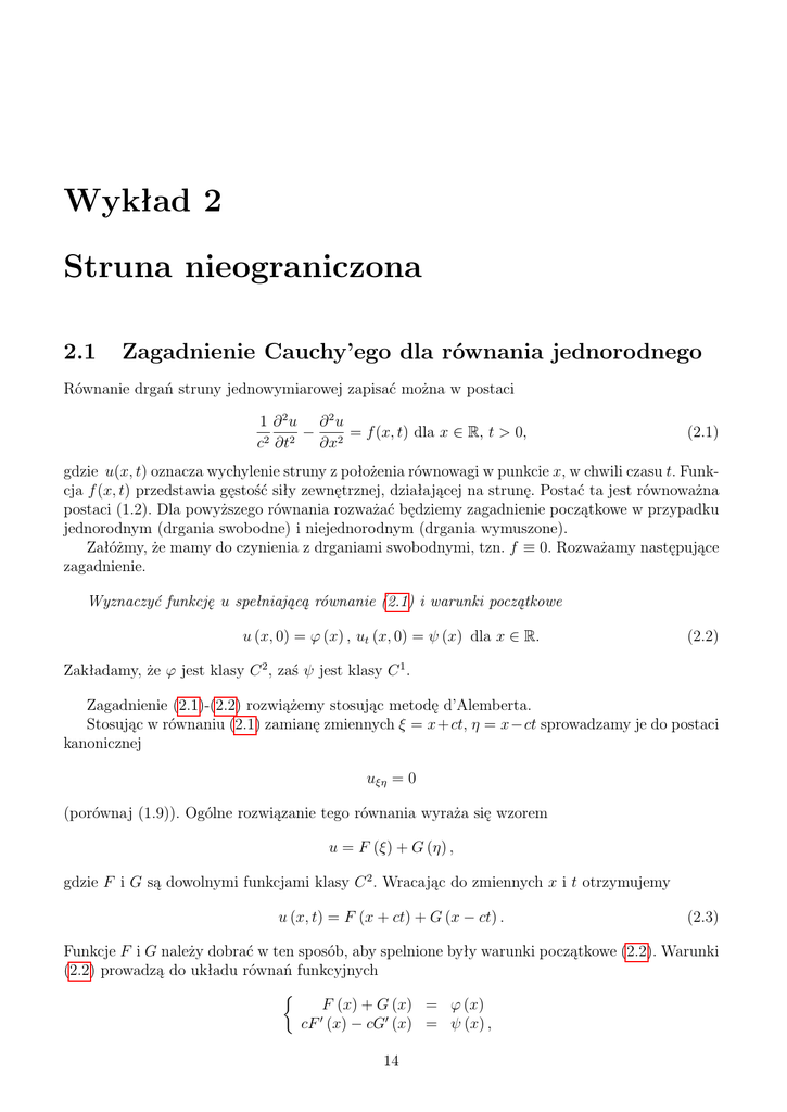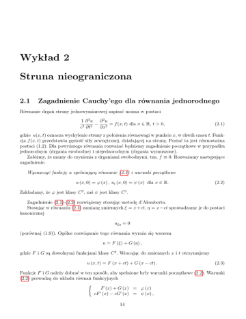 Wykład 2 Struna nieograniczona 2.1 Zagadnienie Cauchy’ego dla równania jednorodnego Równanie drgań struny jednowymiarowej zapisać można w postaci 1 ∂2u ∂2u − 2 = f (x, t) dla x ∈ R, t > 0, c2 ∂t2 ∂x (2.1) gdzie u(x, t) oznacza wychylenie struny z położenia równowagi w punkcie x, w chwili czasu t. Funkcja f (x, t) przedstawia gęstość siły zewnętrznej, działającej na strunę. Postać ta jest równoważna postaci (1.2). Dla powyższego równania rozważać będziemy zagadnienie początkowe w przypadku jednorodnym (drgania swobodne) i niejednorodnym (drgania wymuszone). Załóżmy, że mamy do czynienia z drganiami swobodnymi, tzn. f ≡ 0. Rozważamy następujące zagadnienie. Wyznaczyć funkcję u spełniającą równanie (2.1) i warunki początkowe u (x, 0) = ϕ (x) , ut (x, 0) = ψ (x) dla x ∈ R. (2.2) Zakładamy, że ϕ jest klasy C 2 , zaś ψ jest klasy C 1 . Zagadnienie (2.1)-(2.2) rozwiążemy stosując metodę d’Alemberta. Stosując w równaniu (2.1) zamianę zmiennych ξ = x+ct, η = x−ct sprowadzamy je do postaci kanonicznej uξη = 0 (porównaj (1.9)). Ogólne rozwiązanie tego równania wyraża się wzorem u = F (ξ) + G (η) , gdzie F i G są dowolnymi funkcjami klasy C 2 . Wracając do zmiennych x i t otrzymujemy u (x, t) = F (x + ct) + G (x − ct) . (2.3) Funkcje F i G należy dobrać w ten sposób, aby spelnione były warunki początkowe (2.2). Warunki (2.2) prowadzą do układu równań funkcyjnych F (x) + G (x) = ϕ (x) cF 0 (x) − cG0 (x) = ψ (x) , 14 WYKŁAD 2. STRUNA NIEOGRANICZONA 15 z których łatwo wyznaczamy wzory na funkcje szukane 1 1 F (x) = ϕ(x) + 2 2c Zx 1 1 ψ(s)ds i G (x) = ϕ(x) − 2 2c 0 Zx ψ(s)ds. (2.4) 0 Podstawiając wzory (2.4) do (2.3) otrzymujemy tzw. wzór d’Alemberta dla struny swobodnej 1 1 u(x, t) = (ϕ(x − ct) + ϕ(x + ct)) + 2 2c x+ct Z ψ(s)ds. (2.5) x−ct Z powyższych wzorów wynika, że zaburzenie kształtu struny spowodowane przez przyjęte warunki początkowe rozchodzi się ze skończoną prędkością wzdłuż osi Ox. Funkcja G(x − ct) występująca we wzorze (2.3) przedstawia falę rozchodzącą się z prędkością c w dodatnim kierunku osi Ox, zaś funkcja F (x + ct) - falę rozchodzącą się z prędkością c w ujemnym kierunku osi Ox. Rozwiązanie u(x, t) jest sumą tych dwóch fal. Przykład 1 Rozwiązać zagadnienie (2.1)-(2.2) przyjmując c = 1, oraz 3 (1 − x2 )2 dla |x| ≤ 1 ϕ(x) = , ψ(x) = 0 dla |x| > 1. 1 + x2 Poniższy rysunek przedstawia kształt struny w chwili początkowej wraz z rozkładem na funkcje F (linia kropkowana) oraz G (linia kreskowana). Przykład 2 Rozwiązać zagadnienie (2.1)-(2.2) przyjmując c = 1, ψ ≡ 0 oraz 3 sin3 x dla 0 ≤ x ≤ π ϕ(x) = 0 dla x ∈ / [0, π]. Następny rysunek przedstawia kształt struny w chwili początkowej wraz z rozkładem na funkcje F i G. W tym przypadku funkcje te są identyczne. WYKŁAD 2. STRUNA NIEOGRANICZONA 16 Rozdzielenie zaburzenia następuje w chwili t = π2 . 2.2 Zagadnienie Cauchy’ego dla równania niejednorodnego Rozważmy teraz zagadnienie niejednorodne dla równania (2.1) z jednorodnymi warunkami początkowymi (2.2), tzn ϕ ≡ 0, ψ ≡ 0. Rozważmy funkcję u (x, t) określoną wzorem 1 u (x, t) = c 2 x+c(t−r) Z Zt dr 0 f (s, r)ds. (2.6) x−c(t−r) Poprzez bezpośrednie różniczkowanie łatwo sprawdzić, że funkcja u spełnia równanie (2.1) oraz, że u (x, 0) = 0. Ponieważ Zt ut (x, t) = 1 vt (x, t; r) dr, gdzie v (x, t; r) = c 2 0 x+c(t−r) Z f (s, r)ds, x−c(t−r) więc również ut (x, 0) = 0. Wynika stąd, że rozwiązanie zagadnienia początkowego (2.1)-(2.2) można zapisać jako sumę rozwiązania danego wzorem d’Alemberta (2.5) i funkcji u określonej wzorem (2.6). W ten sposób otrzymujemy wzór d’Alemberta dla równania niejednorodnego 1 1 u(x, t) = (ϕ(x − ct) + ϕ(x + ct)) + 2 2c x+ct Z 1 ψ(s)ds + c 2 x−ct 2.3 x+c(t−r) Z Zt dr 0 f (s, r)ds (2.7) x−c(t−r) Stabilność rozwiązania Niech u1 i u2 będą rozwiązaniami zagadnienia (2.1)-(2.2) odpowiednio dla par funkcji danych (ϕ1 , ψ1 ) i (ϕ2 , ψ2 ). Załóżmy, że dla wszystkich x ∈ R zachodzą nierówności |ϕ1 (x) − ϕ2 (x)| < δ i |ψ1 (x) − ψ2 (x)| < δ. (2.8) WYKŁAD 2. STRUNA NIEOGRANICZONA 17 Na mocy wzoru d’Alemberta (2.7) można napisać, że 1 1 ui (x, t) = (ϕi (x − ct) + ϕi (x + ct)) + 2 2c x+ct Z 1 ψi (s)ds + c 2 x−ct x+c(t−r) Z Zt dr 0 f (s, r)ds dla i = 1, 2. x−c(t−r) Jeśli rozważać będziemy ewolucję kształtu struny w przedziale czasowym [0, T0 ], to korzystając z (2.8) różnicę pomiędzy rozwiązaniami u1 i u2 możemy oszacować następująco |u1 (x, t) − u2 (x, t)| < 1 + 2c 1 1 |ϕ1 (x + ct) − ϕ2 (x + ct)| + |ϕ2 (x − ct) − ϕ2 (x − ct)| + 2 2 x+ct Z 1 1 1 |ψ1 (s) − ψ2 (s)| ds < δ + δ + 2cT0 δ = δ (1 + T0 ) . 2 2 2c (2.9) x−ct Ostatnia nierówność oznacza, że powyższe zagadnienie jest stabilne. O ile bowiem warunki początkowe zadania nie różnią się o więcej niż o δ, to również rozwiązania w dowolnym zadanym lecz ustalonym przedziale czasowym nie różnią się o więcej niż o liczbę δ (1 + T0 ). Oznacza to ciagłą zależność rozwiązania od warunków początkowych, ponieważ lim+ δ (1 + T0 ) = 0. δ→0 W takim razie zagadnienie Cauchy’ego dla równania struny jest poprawnie postawione. 2.4 Struna jednostronnie ograniczona Rozważmy zagadnienie polegające na znalezieniu rozwiązania równania drgań półograniczonej struny swobodnej 1 ∂2u ∂2u − 2 = 0 dla x>0, t > 0, c2 ∂t2 ∂x (2.10) u (x, 0) = ϕ (x) , ut (x, 0) = ψ (x) dla x > 0. (2.11) z warunkami początkowymi 2.4.1 Struna z zamocowanym końcem W tym przypadku poszukujemy funkcji u spełniającej dodatkowy warunek u (0, t) ≡ 0. O funkcjach danych ϕ i ψ założymy, że spełniają one tzw. warunki zgodności ϕ 0+ = 0, ψ 0+ = 0. (2.12) Dodatkowo zakładamy, że ϕ0 , ϕ00 , ψ 0 są ciągłe na półprostej [0, +∞). W celu rozwiązania powyższego z