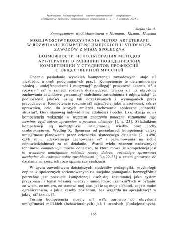 Материалы Международной научно-практической конференции «Актуальные проблемы гуманитарного образования », 1 — 3 октября 2014 г. Stefan ska А. Университет им А.Мицкевича в Познани, Калиш, Польша MOZLIWOSCIWYKORZYSTANIA METOD ARTETERAPII W ROZW1JANIU K O M P E T E N C J I М Щ К К 1 С Н U STÜDENTÖW ZAWODÖW Z MISJA SPOLECZNA ВОЗМОЖНОСТИ ИСПОЛЬЗОВАНИЯ МЕТОДОВ АРТ-ТЕРАПИИ В РАЗВИТИИ ПОВЕДЕНЧЕСКИХ КОМПЕТЕНЦИЙ У СТУДЕНТОВ ПРОФЕССИЙ С ОБЩЕСТВЕННОЙ МИССИЕЙ Obecnie posiadanie wysokich kompetencji zawodowych, staje si? niczb?dnc u osob podcjmujac>ch prac?. Kompetencje te determinowane wicdzq , umiej?tnosciami i motywacj^ podlegaj^ procesowi uczenia si? a rozwijaj^ si? w ramach roznych doswiadczen. Uwaza si? ,iz okreslone zachowania zawodowe gwarantuj^ stabilnosc zatradnienia i odpowiadaj^ za podiioszenie jakosci uslug tak oczekiwanych i wymaganych przez pracodawcow. Kompetencje rozumie si? najcz?sciej jako wlasciwosci, zakres uprawnien, cele, do ktorych zmierza zachowanie spoleczne jednostki, struktur?, ktora stanowiq indywidiialne zdolnosci i cechy. Eksplikacja siowa kompetencja wskazuje w wqzszym znaczeniu potoczne rozumienie tego terminu, czyli zakres uprawnien w pewnvm obszarze [1, s. 23]. Skladnikiem kompetencji sq nic\v;|tpli\vic umiej?tnosci, wiedza oraz cechy osobowosciowe. Wedlug R. Spencera od posiadanych kompetencji zalezy umiej?tnosc planowania przez czlowieka skutecznego dzialania [2, s.496] czyli m.in. adekwatnego zachowania si? i przyjmowania na siebie odpowiedzialnosci za to dzialanie. Wsrod wielu znaczen nadawanych tenninowi kompetencja mozna odnalezc, to ktore mowi ,iz kompetencja jest to wvuczana umiejqtnosc robienia rzeczy dobrze, rozwiniqte sprawnosci niezbqdne do radzenia sobie zproblemami [ 3,s.22-23] a zatem gotowosc do dzialania na rzecz ich rozwiqzania czy realizacji. W zyciu zawodowym dzisiejszych studentöw pedagogiki, psychologii czy nauk spolecznych zorientowanych na socjalne pomaganie- bezwzgl?dnie potrzebne jest poczucie kompetencji osobistej rozumianej jako system przekonan na temat wlasnej wiedzy i umiej?tnosci zamkni?tych w pytaniu: со wiem, со umiern, со stanowi moj atut, jakie sq mojc slabosci, со jest moim ograniczeniem, a jakie zasoby posiadam, bez wzgl?du na specjalizacj? w jakiej si? ksztalc??. Termin kompetencja stosuje si? wi?c zarowno do okreslenia umiej?tnosci mi?kkich (behawioralnych) jak i twardvch (funkcjonalnych). 165 Материалы Международной научно-практической конференции «Актуальные проблемы гуманитарного образования », 1 — 3 октября 2014 г. gdzie miqkkie okrcslajq sposöb, w jaki ludzie map) si? zachowac, by dobrze zrobic cos, np. wykonac swoje zadania ale tez podjigl ro/mowg. relacje z inna osoba czy grupq zgodiiie z tym со ta Osoba wie, rozumie i potrafi stosowiiie zrobic w zaistnialej sytuacji. Kompetencje twarde natomiast oznajmiaj^ - со nalezy wiedziec, by osi;(gn;|c okreslony i oczekiwany rezultat [4,s.366 ]. Wsrod kompetencji zawodowych zwi^zanych z misja spolccznq miejsce szczegolne /ajnuij;i kompetencje migkkic czyli osobiste i interpersoiialne. Do liich nalc/;i przede wszystkim takie sprawnosci jak komunikatywnosc czy umiej^tnosci pracy w zespole. Poniewaz absolwent wyzszej uczelni, staje sip spccjalisUp od ktörego swiat wymaga nie tylko wiedzy i umicjplnosci. ale takze duzej dawki kreatywnosci [5,s.34-36] potrzebuje zadan i przestrzeni stymuluj^cej jego ch§c samodoskonalenia si§. Temu wlasnie sluzyc moze arteterapia - dyscyplina wiedzy i praktyki gdzie w relacji z innym czlowiekiem uzywa sig artystycznych melod i technik zgodnie z kierunkiem osiqgania indywidualnych celow. Jest /ар1апо\\аш( dzialalnosci^, w duzej inierze spontanic/iup zwi^zana z aspektem tworzenia i postrzegania zywiolowego zachowania jako antidotum na \\/rasta|;(c;( sztywnosc spolecznych zachowan .Metody tej terapii skupione na uzewn^trznianiu i rozwijaniu osobistych dzialan twörczych uczestnika w celu zaspokojenia jego potrzeby akceptacji, bezpieczenstwa, wspoluczestnictwa, bycia rozumianym i docenianym. W celowym procesie tworzenia - kreatywnosc rozumie sig jako podstawow^ ludzk^ zdolnosc, a j e j przestrzen jako miejsce do dialogu mi^dzy rzeczywistosci^ wewn^trzn^ a /cwngtrzrup Kreatywnosc oznacza cos dynamicznego, proces, ktory sig rozwija i zawiera w sobie zrodlo i cel. Mozemy uznac jq za postaw§, ktöra umozliwia odnalezienie nowych aspektöw w tym со powszechnie znane i bliskie. Umicjctnosc korzystania z kreatywnosci jest w przekonaniu arteterapeutow przejawem zdrowia. Uznaje Щ, iz natural Ш) prawidlowosci^ jednostki jest d^zenie do doznania pozytywnych emocji a potrzeby s;( podstawowym stymulatorem ludzkiego dzialania. W dzialaniach artystycznych wzajemne relacje ludzi tworz^cych sluzyc map) z jednej strony rozwijaniu swiadomosci JA, a dnigiej aktwvnosci tworczej czyli sily blokuj^cej schematyczne obrazowanie i pojmowanie rzeczywistosci. Tworzenie artystyczne poprzez powrot do rzeczywistosci wyrazonej obrazem dzwi^kiem dotykiem i zapachem czyli j?zyka metaforycznego, symbolicznego, staje sie artystycznym zapisem czyjegos doswiadczenia. Nosnikiem zaröwno swiadomych jak i nieuswiadomionych potrzeb i emocji jednostki. Celem tej artystycznej metody wsparcia i terapii jest usprawnianie zaburzonych funkcji, ale rowniez profilaktyka i dzialanie wplywaj^ce na osobowosciowe determinantv uczenia sig: takie jak wiara we wlasne mozliwosci, eliminacja l§ku przed niepowodzeniami, budzenie 166 Материалы Международной научно-практической конференции «Актуальные проблемы гуманитарного образов