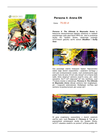 Persona 4: Arena EN Cena: 75.00 zł Persona 4: The Ultimate In Mayonaka Arena to klasyczna dwuwymiarowa bijatyka osadzona w realiach popularnego cyklu japo?skich RPG-ów. Jest to produkcja studia Arc System Works, doskonale znanego mi?o?nikom gatunku dzi?ki seriom BlazBlue i Guilty Gear. Gra pozostaje wierna tradycjom bijatyk. Naprzeciwko siebie staje dwóch wojowników i zadaniem ka?dego z nich jest znokautowanie rywala, czyli zredukowanie jego paska ?ycia do zera. W tym celu stosuj? oni w?asne style walki, które obejmuj? zarówno zwyk?e ciosy, jak i ataki specjalne. Du?? rol? odgrywaj? te? tzw. kombosy, czyli ??czenie ciosów w sekwencje. Persona 4: The Ultimate In Mayonaka Arena oferuje zarówno tryb singleplayer, jak i rozgrywki wieloosbowe. Multiplayer mo?liwy jest zarówno na jednej konsoli, jak i przez sie?. W grze znajdziemy wojowników z dwóch ostatnich ods?on serii, czyli Persona 3 i Persona 4. Tak jak w poprzednich produkcjach studia Arc System Works, ca?o?? ukazana zosta?a za pomoc? pi?knej grafiki 2D. 1/2 Natomiast ?cie?k? d?wi?kow? stworzy? Shoji Meguro, czyli kompozytor od lat zwi?zany z cyklem. Zobacz wideo: 2/2 Powered by TCPDF (www.tcpdf.org)
