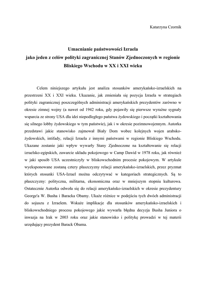 Katarzyna Czornik Umacnianie państwowości Izraela jako jeden z celów polityki zagranicznej Stanów Zjednoczonych w regionie Bliskiego Wschodu w XX i XXI wieku Celem niniejszego artykułu jest analiza stosunków amerykańsko-izraelskich na przestrzeni XX i XXI wieku. Ukazanie, jak zmieniała się pozycja Izraela w strategiach polityki zagranicznej poszczególnych administracji amerykańskich prezydentów zarówno w okresie zimnej wojny (a nawet od 1942 roku, gdy pojawiły się pierwsze wyraźne sygnały wsparcia ze strony USA dla idei niepodległego państwa żydowskiego i początki kształtowania się silnego lobby żydowskiego w tym państwie), jak i w okresie pozimnowojennym. Autorka przedstawi jakie stanowisko zajmował Biały Dom wobec kolejnych wojen arabskożydowskich, intifady, relacji Izraela z innymi państwami w regionie Bliskiego Wschodu. Ukazane zostanie jaki wpływ wywarły Stany Zjednoczone na kształtowanie się relacji izraelsko-egipskich, zawarcie układu pokojowego w Camp Dawid w 1978 roku, jak również w jaki sposób USA uczestniczyły w bliskowschodnim procesie pokojowym. W artykule wyeksponowane zostaną cztery płaszczyzny relacji amerykańsko-izraelskich, przez pryzmat których stosunki USA-Izrael można odczytywać w kategoriach strategicznych. Są to płaszczyzny: polityczna, militarna, ekonomiczna oraz w mniejszym stopniu kulturowa. Ostatecznie Autorka odwoła się do relacji amerykańsko-izraelskich w okresie prezydentury George'a W. Busha i Baracka Obamy. Ukaże różnice w podejściu tych dwóch administracji do sojuszu z Izraelem. Wskaże implikacje dla stosunków amerykańsko-izraelskich i bliskowschodniego procesu pokojowego jakie wywarła błędna decyzja Busha Juniora o inwazja na Irak w 2003 roku oraz jakie stanowisko i politykę prowadzi w tej materii urzędujący prezydent Barack Obama.