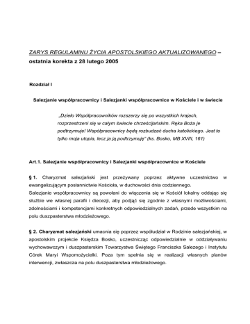 ZARYS REGULAMINU ŻYCIA APOSTOLSKIEGO AKTUALIZOWANEGO – ostatnia korekta z 28 lutego 2005 Rozdział I Salezjanie współpracownicy i Salezjanki współpracownice w Kościele i w świecie „Dzieło Współpracowników rozszerzy się po wszystkich krajach, rozprzestrzeni się w całym świecie chrześcijańskim. Ręka Boża je podtrzymuje! Współpracownicy będą rozbudzać ducha katolickiego. Jest to tylko moja utopia, lecz ja ją podtrzymuję” (ks. Bosko, MB XVIII, 161) Art.1. Salezjanie współpracownicy i Salezjanki współpracownice w Kościele § 1. Charyzmat salezjański jest przeżywany poprzez aktywne uczestnictwo w ewangelizującym posłannictwie Kościoła, w duchowości dnia codziennego. Salezjanie współpracownicy są powołani do włączenia się w Kościół lokalny oddając się służbie we własnej parafii i diecezji, aby podjąć się zgodnie z własnymi możliwościami, zdolnościami i kompetencjami konkretnych odpowiedzialnych zadań, przede wszystkim na polu duszpasterstwa młodzieżowego. § 2. Charyzmat salezjański umacnia się poprzez współudział w Rodzinie salezjańskiej, w apostolskim projekcie Księdza Bosko, uczestnicząc odpowiedzialnie w oddziaływaniu wychowawczym i duszpasterskim Towarzystwa Świętego Franciszka Salezego i Instytutu Córek Maryi Wspomożycielki. Poza tym spełnia się w realizacji własnych planów interwencji, zwłaszcza na polu duszpasterstwa młodzieżowego. Rozdział II Zaangażowanie apostolskie Salezjanina współpracownika i Salezjanki współpracownicy Art. 2. Salezjanie współpracownicy i Salezjanki współpracownice w rzeczywistości socjalno-kulturowej § 1. We wszystkich środowiskach w jakich żyją Salezjanie współpracownicy, wierni Ewangelii i nauczaniu doktryny społecznej Kościoła, interpretując znaki czasów, kontynuują stwórcze dzieło Boga i dają świadectwo Chrystusowi prawomyślnością, przedsiębiorczością, prawością życia i spostrzegawczością wychowawczą; z poważnym i uaktualnianym znawstwem; dzieląc radości, cierpienia i pragnienia osób znajdujących się u ich boku; dyspozycyjni w służbie bliźniemu w każdych okolicznościach. § 2. Formują w sobie prawe sumienie własnej odpowiedzialności i uczestnictwo w życiu społecznym w środowisku kultury, ekonomii i polityki. Odrzucają to wszystko co prowokuje i powoduje rozwój niesprawiedliwości i ucisku, marginalizacji, przemocy i z odwagą występują usuwając ich przyczyny. § 3. Czynnie interesują się etycznym wymiarem kultury. Na bieżąco uaktualniają swoją wiedzę o rozwoju środków społecznego przekazu, z powodu ich wpływu przede wszystkim na kształtowanie się młodzieży i środowisk ludowych. § 4. Włączają się, według własnych zdolności i możliwości, w środowiska kulturowe, urzędowe, społeczno-polityczne osiągnięcia dobra wspólnego i jego ciągłego rozwoju. Działają zgodnie z wymogami ewangelicznej wolności i sprawiedliwości, aby strzec poszanowania praw człowieka, a co za tym idzie odradzać i odnawiać mentalność i obyczaje, prawa i zasady współżycia w środowiskach, w których żyją. § 5. Angażują wszystkie swoje siły dla rozwoju pokoju, ochrony środowiska, dialogu w budowaniu ‘społeczeństwa miłości. Dbają o rozwój organizacji pomocy społecznej dotyczących: wyżywienia, zdrowia, mieszkania, pracy, wychowania, dostępu do dóbr kultury, swobodnego przemieszczania się osób i informacji oraz dbania o wolność religijną. Art. 3. Stowarzyszenie w rzeczywistości obywatelskiej i kościelnej. § 1. Uwaga Stowarzyszenia jest skierowana na wszelkie sygnały pochodzące od społeczności świeckiej, dotyczące rozwoju ochrony całej osoby ludzkiej, a zatem jej podstawowych praw. § 2. Stowarzyszenie odważnie interweniuje, zgodnie ze wskazaniami Kościoła, aby rozwijać obyczaje społeczno-polityczne oparte na Ewangelii i rozpowszechniać ludzkie wartości chrześcijańskie. Oświeca i zachęca Stowarzyszonych do podjęcia się odpowiedzialnie własnych obowiązków w społeczeństwie. Staje się członkiem stowarzyszeń, ruchów i grup apostolskich, organizacji wychowawczych, organizmów, które stawiają sobie zwłaszcza za cel służbę młodzieży i rodzinie, solidarność między uprzemysławiającymi się ludami i rozwój sprawiedliwości i pokoju. § 3. Stowarzyszenie ze szczególną uwagą obserwuje rozwój społecznego wolontariatu. Włącza się w propozycje formacji i uczestniczy w inicjatywach organizacji o korzeniach chrześcijańskich. § 4. Stowarzyszenie angażuje się w upowszechnianie dialogu między kulturami i wyznaniami. Art. 4. Struktury, w których działamy Salezjanie współpracownicy dają początek stowarzyszeniom, udzielając się w tych środowiskach społecznych, w których żyją; w szczególności zaś: - świeckich, kulturowych, społeczno-ekonomicznych i politycznych: zwracają uwagę na wychowanie młodzieży i na życie rodzin - kościelnych: oferują odpowiedzialną współpracę biskupom i proboszczom zwłaszcza we wspólnotach parafialnych; - środowiskach ożywianych przez Towarzystwo Św. Franciszka Salezego, przez Córki Maryi Wspomożycielki młodzieżowe, szkoły, lub inne Grupy stowarzyszenia, Rodziny instytucje Salezjańskiej: formacyjne i Oratoria, w Centra środowiskach Duszpasterstwa młodzieżowego. - dziełach zarządzanych przez inne wspólnoty zakonne i organizacje kościelne. Art. 5. Metoda dobroci Salezjanie współpracownicy w swoim zaangażowaniu wychowawczym wprowadzają w czyn system prewencyjny Księdza Bosko, który „opiera się na rozumie, religii i dobroci”, czyli: - budują środowisko wychowawcze o klimacie rodzinnym, w którym poprzez stałą i animującą obecność pomagają odczuć obecność Boga czyniąc dobro; - podejmują się wychowywania opartego na przekonywaniu i skierowanego na osobiste kierownictwo i doświadczenie wspólnotowe; - wydobywają z młodzieży każde możliwe dobro; - doceniaj