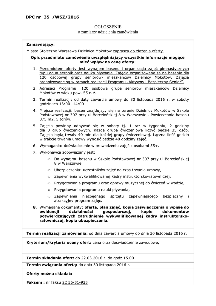 DPC nr 35 /WSZ/2016 OGŁOSZENIE o zamiarze udzielenia zamówienia Zamawiający: Miasto Stołeczne Warszawa Dzielnica Mokotów zaprasza do złożenia oferty. Opis przedmiotu zamówienia uwzględniający wszystkie informacje mogące mieć wpływ na cenę oferty: 1. Przedmiotem oferty jest wynajem basenu i organizacja zajęć gimnastycznych typu aqua aerobik oraz nauka pływania. Zajęcia organizowane są na basenie dla 120 osobowej grupy seniorów- mieszkańców Dzielnicy Mokotów. Zajęcia organizowane są w ramach realizacji Programu „Aktywny i Bezpieczny Senior”. 2. Adresaci Programu: 120 osobowa grupa seniorów mieszkańców Dzielnicy Mokotów w wieku pow. 55 r. ż. 3. Termin realizacji: od daty zawarcia umowy do 30 listopada 2016 r. w soboty godzinach 13:00- 14:00 4. Miejsce realizacji: basen znajdujący się na terenie Dzielnicy Mokotów w Szkole Podstawowej nr 307 przy ul.Barcelońskiej 8 w Warszawie . Powierzchnia basenu 375 m2, 5 torów. 5. Zajęcia powinny odbywać się w soboty tj. 1 raz w tygodniu, 2 godziny dla 3 grup ćwiczeniowych. Każda grupa ćwiczeniowa liczyć będzie 35 osób. Zajęcia będą trwały 40 min dla każdej grupy ćwiczeniowej. Łączna ilość godzin w trakcie trwania umowy wynosić będzie 48 godziny zajęć. 6. Wymagania: doświadczenie w prowadzeniu zajęć z osobami 55+. 7. Wykonawca zobowiązany jest: • Do wynajmu basenu w Szkole Podstawowej nr 307 przy ul.Barcelońskiej 8 w Warszawie • Ubezpieczenia: uczestników zajęć na czas trwania umowy, • Zapewnienia wykwalifikowanej kadry instruktorsko-ratowniczej, • Przygotowania programu oraz oprawy muzycznej do ćwiczeń w wodzie, • Przygotowania programu nauki pływania, • Zapewnienia niezbędnego atrakcyjny program zajęć. sprzętu zapewniającego bezpieczny i 8. Wymagane dokumenty: oferta, plan zajęć, kopia zaświadczenia o wpisie do ewidencji działalności gospodarczej, kopie dokumentów potwierdzających zatrudnienie wykwalifikowanej kadry instruktorskoratowniczej, kopia ubezpieczenia. Termin realizacji zamówienia: od dnia zawarcia umowy do dnia 30 listopada 2016 r. Kryterium/kryteria oceny ofert: cena oraz doświadczenie zawodowe, Termin składania ofert: do 22.03.2016 r. do godz.15.00 Termin związania ofertą: do dnia 30 listopada 2016 r. Oferty można składać: Faksem : nr faksu 22 56-51-935 drogą elektroniczną: na adres [email protected] pisemnie na adres: Wydział Spraw Społecznych i Zdrowia dla Dzielnicy Mokotów, ul. Wiśniowa 37, 02-640 Warszawa pok. 203 Oferta będzie rozpatrywana przez Zamawiającego, jeżeli Zamawiający otrzyma ją przed terminem składania ofert określonym w ogłoszeniu. Komórka organizacyjna Urzędu Dzielnicy Mokotów m.st. Warszawy realizująca wydatek: Wydział Spraw Społecznych i Zdrowia dla Dzielnicy Mokotów Osoba do kontaktu: Mariola Niczyporuk tel. 22 56-51-924 Informacje dodatkowe: 1. Zamawiający będzie rozpatrywał oferty złożone zgodnie z ogłoszeniem. 2. Zamawiający udzieli zamówienia wykonawcy, którego oferta zostanie wybrana jako najkorzystniejszą. 3. Niezwłocznie po rozpatrzeniu ofert, w przypadku braku decyzji o unieważnieniu postępowania, informacja o wyborze wykonawcy zostanie zamieszczona na stronie internetowej Urzędu, na której zostało zamieszczone ogłoszenie. 4. Zamawiający zastrzega sobie prawo do zmiany ogłoszenia bez podania przyczyn. 5. Zamawiający zastrzega sobie prawo odwołania ogłoszenia w każdym czasie bez podawania przyczyn. 6. W sprawie nie ujętych w ogłoszeniu mają zastosowanie przepisy kodeksu cywilnego. Załączniki 1. formularz oferty 2. wzór umowy /-/ Bogdan Piec Naczelnik Wydziału Spraw Społecznych i Zdrowia dla Dzielnicy Mokotów ................................................................ data, podpis i pieczątka kierownika komórki organizacyjnej realizującej wydatek Załącznik do ogłoszenia OFERTA Składający ofertę: (wpisać dane adresowe i kontaktowe) ………………………………………………………………………………………………………………………………………………… ……………………………………………………………………………………………………………………………………………….. Odpowiadając na ogłoszenie dotyczące zamówienia: ………………………………………………………………………………………………………………………………………………… ………………………………………………………………………………………………………………………………………………… ………………………………………………………………………………………………………………………………………………… oferuję wykonanie zamówienia za cenę brutto za 60 min. zajęć ....................................... zł. (słownie: ……………………………………………………………………………………..) oferuję wykonanie zamówienia za cenę brutto …………........................................ zł. (słownie: ……………………………………………………………………………………..) Ponadto oświadczam, że zobowiązuję się w przypadku wyboru mojej oferty jako najkorzystniejszej, wykonać zamówienie na zasadach określonych w ogłoszeniu o zamiarze udzielenia zamówienia oraz zobowiązuję się do zawarcia umowy w miejscu i terminie wskazanym przez Zamawiającego. Załączniki ( o ile były wymagane) 1…………………………………… 2………………………………….. 3………………………………….. .......................................................... data i podpis osoby składającej ofertę