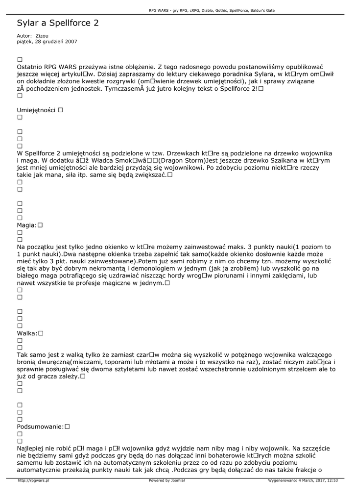 RPG WARS - gry RPG, cRPG, Diablo, Gothic, SpellForce, Baldur's Gate Sylar a Spellforce 2 Autor: Zizou piątek, 28 grudzień 2007 Ostatnio RPG WARS przeżywa istne oblężenie. Z tego radosnego powodu postanowiliśmy opublikować jeszcze więcej artykułÃłw. Dzisiaj zapraszamy do lektury ciekawego poradnika Sylara, w ktÃłrym omÃłwił on dokładnie złożone kwestie rozgrywki (omÃłwienie drzewek umiejętności), jak i sprawy związane z pochodzeniem jednostek. Tymczasem już jutro kolejny tekst o Spellforce 2! Umiejętności W Spellforce 2 umiejętności są podzielone w tzw. Drzewkach ktÃłre są podzielone na drzewko wojownika i maga. W dodatku „Władca SmokÃłw―(Dragon Storm)Jest jeszcze drzewko Szaikana w ktÃłrym jest mniej umiejętności ale bardziej przydają się wojownikowi. Po zdobyciu poziomu niektÃłre rzeczy takie jak mana, siła itp. same się będą zwiększać. Magia: Na początku jest tylko jedno okienko w ktÃłre możemy zainwestować maks. 3 punkty nauki(1 poziom to 1 punkt nauki).Dwa następne okienka trzeba zapełnić tak samo(każde okienko dosłownie każde może mieć tylko 3 pkt. nauki zainwestowane).Potem już sami robimy z nim co chcemy tzn. możemy wyszkolić się tak aby być dobrym nekromantą i demonologiem w jednym (jak ja zrobiłem) lub wyszkolić go na białego maga potrafiącego się uzdrawiać niszcząc hordy wrogÃłw piorunami i innymi zaklęciami, lub nawet wszystkie te profesje magiczne w jednym. Walka: Tak samo jest z walką tylko że zamiast czarÃłw można się wyszkolić w potężnego wojownika walczącego bronią dwuręczną(mieczami, toporami lub młotami a może i to wszystko na raz), zostać niczym zabÃłjca i sprawnie posługiwać się dwoma sztyletami lub nawet zostać wszechstronnie uzdolnionym strzelcem ale to już od gracza zależy. Podsumowanie: Najlepiej nie robić pÃłł maga i pÃłł wojownika gdyż wyjdzie nam niby mag i niby wojownik. Na szczęście nie będziemy sami gdyż podczas gry będą do nas dołączać inni bohaterowie ktÃłrych można szkolić samemu lub zostawić ich na automatycznym szkoleniu przez co od razu po zdobyciu poziomu automatycznie przekażą punkty nauki tak jak chcą .Podczas gry będą dołączać do nas także frakcje o http://rpgwars.pl Powered by Joomla! Wygenerowano: 4 March, 2017, 12:53 RPG WARS - gry RPG, cRPG, Diablo, Gothic, SpellForce, Baldur's Gate ktÃłrych zaraz opowiem. KrÃłlestwo Normalne krÃłlestwo w ktÃłrego skład wchodzą ludzie, elfy i krasnoludy. Można szkolić je wszystkie razem i jest to zalecane(trzeba wybudować dla nich pomieszczenie) gdyż mają dobre jednostki np. Drzewce ktÃłre są silne i pomagają wykrywać cienie ale są za to powolne i podatne na ogień , katapulty krasnoludzkie też są bardzo przydatne. Żeby nie było że ludzie są najgorsi to coś o nich też powiem. Posiadają paladynÃłw ktÃłrzy dobrze walczą i mogą wskrzeszać umarłych żołnierzy jako duchy na 60 sekund. Magowie ktÃłrzy jeżdżą na gryfach też nie są do niczego. Po zbudowaniu pomieszczenia dla każdej rasy można zrobić tytana ktÃłry jak łatwo się domyślić jest bardzo mocną jednostką ale można zrobić tylko 1.Ale nie można zapomnieć krasnoludzkiego przysłowia ktÃłre mÃłwi „Nawet tytan d..a jeżeli wrogÃłw kupa. Klany W skład klanÃłw wchodzą orkowie, trolle i barbarzyńcy. Po zbudowaniu wszystkich pomieszczeń można użyć tytana itp. Orkowie specjalizują się głÃłwnie w magii ognia i posiadają ciężko zbrojnych weteranÃłw i totemy(latające jednostki) potrafiące wykrywać cienie, trolle to są silne i potrafią rzucać kamieniami we wrogÃłw, posiadają też ogniste katapulty. Barbarzyńcy nie są tacy słabi na jakich wyglądają. To że nie są dobrze uzbrojeni o niczym nie świadczy, potrafią rzucać celnie toporami, ich spirytyści ujeżdżają grypopodobne stworzenia i rażą wrogÃłw lodem z powietrza. A berserkerzy? To bardzo silna jednostka potrafiąca zadać bardzo duże obrażenia więc uważajcie na niego. Pakt Bez tej frakcji SpellForce „Czas Mrocznych wojen― nie był by już taki mroczny. Są trzy rasy i tytan ktÃłry zawsze działa na tej samej zasadzie. Mroczne Elfy to głÃłwna rasa w tej frakcji. Nekromantki wskrzeszają wszystkich(wrogÃłw i swoich) jako szkielety, jeżeli rycerz śmierci zostanie zaatakowany w walce wręcz to przeciwnik oberwie czarem kradnącym życie a o Arachnisach ktÃłre przyzywają pająki nie trzeba się martwić gdyż zawsze mają przy sobie ochronne. Gargulce to dość dziwna rasa w ktÃłrych głÃłwnie występują jednostki latające(gargulec lodu i ognia) dobrze posługujące się swoim żywiołem. Jest jeszcze gargulec ziemi ktÃłry jest mocny i głÃłwnie z nim na budynki moim zdaniem idzie. Teraz najciekawsza część wszystkiego – Cienie niewidzialne istoty ktÃłre mogą zadawać krytyczne obrażenia wychodząc ze świata cienia. Są niewidzialne ale niektÃłre jednostki takie jak totemy czy drzewce mogą je zdemaskować. ZabÃłjca atakuje jednostki naziemne, Zmieniacz kształtÃłw latające a Spustoszenie zastępuje jednostki oblężnicze gdyż wychodząc ze świata cienia może niszczyć lub poważnie ranić budynki. napisał: Sylar All rights reserved by RPG WARS Company http://rpgwars.pl Powered by Joomla! Wygenerowano: 4 March, 2017, 12:53