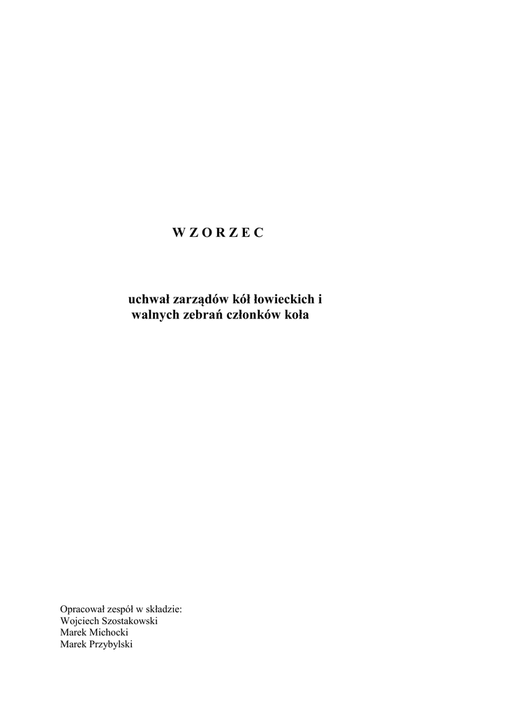 WZORZEC uchwał zarządów kół łowieckich i walnych zebrań członków koła Opracował zespół w składzie: Wojciech Szostakowski Marek Michocki Marek Przybylski U C H W A Ł A nr ….. / 20….. Zarządu Koła Łowieckiego nr……..w ……….z dnia…….20…... w sprawie przyjęcia na staż Pana………………… zam. ………………………. Na podstawie par.15 ust .2 oraz par. 64 Statutu PZŁ po rozpatrzeniu wniosku z dnia............................. przyjął na roczny staż łowiecki do koła Panią Pana (imię i nazwisko)..........................................zam. ………………………………………………… Zasady odbywania stażu, sposób jego dokumentowania oraz zaliczenia określa uchwała nr 4/2007 Naczelnej Rady Łowieckiej z dnia 4 września 2007 r. Opiekunem Pani- Pana w czasie stażu będzie Kol. …………………................. .................................……………nr.telefonu........................................................ z którym należy nawiązać kontakt. W załączeniu uchwała nr 4/2007 NRŁ z dnia 4 września 2007r. Dwa podpisy członków zarządu koła Do wiadomości: 1/ZO PZŁ w Kaliszu Uwaga: uchwałę należy skutecznie doręczyć tj. wysłać za zwrotnym potwierdzeniem odbioru lub doręczyć osobiście za pokwitowani U C H W A Ł A nr ….. / 20.….. Zarządu Koła Łowieckiego nr……..w ……….z dnia…….20…… w sprawie nałożenia kary porządkowej na Koleżankę - Kolegę (imię i nazwisko) ………………………………zam.(adres zamieszkania)................................................... Zarząd Koła działając na podstawie par. 64 pkt.12 oraz par. 152 ust.1,pkt.1 Statutu PZŁ po wysłuchaniu zainteresowanego w dniu …………zastosował wobec Koleżanki - Kolegi (imię nazwisko)...................................................................................... zam. (adres zamieszkania).................................................................................................................. karę porządkową w postaci: u p o m n i e n i a , Uzasadnienie Opis stanu faktycznego tj. szczegółowy opis zdarzenia z datami i godzinami i miejscem. Wskazać odpowiednie przepisy ustawy prawo łowieckie z aktami wykonawczymi – Statutem, uchwał organów Zrzeszenia i Koła, które zostały naruszone. Pouczenie: Zgodnie z par. 171 ust.1 i ust. 2 pkt.1 oraz par.172 ust.1 Statutu PZŁ przysługuje Koleżance - Koledze w terminie 14 dni odwołanie od dnia doręczenia za pośrednictwem zarządu koła do walnego zgromadzenia. Dwa podpisy członków zarządu koła Uwaga: uchwałę należy skutecznie doręczyć tj. wysłać za zwrotnym potwierdzeniem odbioru lub doręczyć osobiście za pokwitowaniem ( pokwitowanie z datą przyjęcia). U C H W A Ł A nr … /20….. Zarządu Koła Łowieckiego nr……..w ……….z dnia…….20…… w sprawie nałożenia kary porządkowej na Koleżankę - Kolegę (imię i nazwisko) ………………………………zam.(adres zamieszkania)................................................... Zarząd Koła działając na podstawie par. 64 pkt.12 oraz par. 152 ust.1 pkt.2 Statutu PZŁ po wysłuchaniu zainteresowanego w dniu ………..zastosował wobec Koleżanki - Kolegi (imię nazwisko)............................................................................................................................... zam. (adres zamieszkania).................................................................................................................. karę porządkową w postaci: nagany Uzasadnienie Opis stanu faktycznego tj. szczegółowy opis zdarzenia z datami i godzinami i miejscem. Wskazać odpowiednie przepisy ustawy prawo łowieckie z aktami wykonawczymi – Statutem,uchwał organów Zrzeszenia i Koła, które zostały naruszone. Pouczenie: Zgodnie z par. 171ust.1 i ust. 2 pkt.1 oraz par.172 ust.1 Statutu PZŁ przysługuje Koleżance - Koledze w terminie 14 dni odwołanie od dnia doręczenia za pośrednictwem zarządu koła do walnego zgromadzenia. Dwa podpisy członków zarządu koła Uwaga: uchwałę należy skutecznie doręczyć tj. wysłać za zwrotnym potwierdzeniem odbioru lub doręczyć osobiście za pokwitowaniem ( pokwitowanie z datą przyjęcia). U C H W A Ł A nr ……./20…... Zarządu Koła Łowieckiego nr……..w ……….z dnia…….20…… w sprawie nałożenia kary porządkowej na Koleżankę - Kolegę (imię i nazwisko) …………………………..zam.(adres zamieszkania)......................................................... Zarząd Koła działając na podstawie par. 64 pkt.12 oraz par. 152 ust.1,pkt.3 Statutu PZŁ po wysłuchaniu zainteresowanego w dniu ……….zastosował wobec Koleżanki - Kolegi (imię i nazwisko).......................................................................................................................... zam. (adres zamieszkania).................................................................................................................. karę porządkową w postaci: zawieszenia w prawach do wykonywania polowania na okres od……………do………...... Uzasadnienie Opis stanu faktycznego tj. szczegółowy opis zdarzenia z datami i godzinami i miejscem. Wskazać odpowiednie przepisy ustawy prawo łowieckie z aktami wykonawczymi – Statutem, uchwał organów Zrzeszenia i Koła, które zostały naruszone. Pouczenie: Zgodnie z par. 171ust.1 i ust.2 pkt.1 oraz par.172 ust.1 Statutu PZŁ przysługuje Koleżance - Koledze w terminie 14 dni odwołanie od dnia doręczenia za pośrednictwem zarządu koła do walnego zgromadzenia. Dwa podpisy członków zarządu koła Uwaga: uchwałę należy skutecznie doręczyć tj. wysłać za zwrotnym potwierdzeniem odbioru lub doręczyć osobiście za pokwitowaniem ( pokwitowanie z datą przyjęcia). U C H W A Ł A nr …/20…… Zarządu Koła Łowieckiego nr……..w ……….z dnia…….20….… w sprawie nałożenia kary p