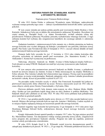 HISTORIA PARAFII ŚW. STANISŁAWA KOSTKI w WYANDOTTE, MICHIGAN Napisana przez Tomasza Borkowskiego W roku 1913 Gmina Polska w północnej Wyandocie stanu Michigan, zadecydowała wykonać rosnąca potrzebę tego czasu — założyć rzymskokatolicki kościół dla siebie i przyszłych pokoleń. W tym czasie istniała już jedyna polska parafia pod wezwaniem Matki Boskiej z Góry Karmelu. Jednakowoż była ona za daleko dla mieszkańców północnej Wyandoty. Rezydenci tej części miasta, p. Theophil Szulc i p. Adam Nowakowski, zwołali zebranie celem aby przedwstawić Polakom północnej Wyandoty potrzebę wybudowania własnego kościoła. Z tego zebrania komitet był wybrany aby zorganizować katolików do czynnego udziału w założeniu parafii. Zadaniem komitetu i zainteresowanych było staranie się o zbiórkę pieniężną na budowę nowego kościoła oraz wysłać delegację do biskupa i przedstawić mu potrzebę założenia nowej parafii. Pan Szulc i pan Nowakowski dnia 25 listopada w 1913 r. zaczęli zbierać składki od ludzi zaintersowanych budową nowego kościoła. Donacje ludzi były szczodre bo już 17 kwietnia w 1914 roku władza kościelna dała oficjalne zezwolenie na założenie parafii pod wezwaniem ,,Św. Stanisława Kostki," a Ks. Aleksander J. Konuś był wyznaczony na proboszcza. Nabywają obszerny budynek na Biddle Avenue w bloku będącym między Sullivan a Ford ulicami za sumę $700.00. Budynek ten miał być używany tymczasowo jako budynek kościelny. W tym samym roku postanowiono porzucić budynek na Biddle Avenue, a pobudować kościół na nowym miejscu na Antoine Avenue w bloku mieszczącym się między McKinley a Felice ulicami. Pan Antoine Labadie był właścicielem tego miejsca. Pewną część tej posiadłości dał za darmo; za resztę wziął pieniądze. Budynek zakupiony od p. Antoine Labadie przerobiono na kościół i szkołę. Koszt tej przeróbki wyniósł $1,657.53. Na początku osoby świeckie uczyły w szkole. Pan Franciszek Szymański był jednym z pierwszych nauczycieli, który ofiarował się uczyć. Świeccy nauczyciele uczyli do 1921 roku do czasu objęcia szkoły przez Siostry Franciszkanki, z Sylvania, Ohio. Pierwsza plebania parafii była domem rento-wanym na ulicy Hudson blisko Biddle ulicy. Krótko po tym parafianie kupili drugi dom na ulicy Hudson w pobliżu McKinley. Ten budynek służył jako plebania aż do roku 1923. W roku 1923 nowa plebania była pobudowana przez parafian na gruntach parafii. W 1914 r. l-go grudnia parafia kupiła nowy dzwon a w 1915 roku zaczęła budować nowy kościół: Miejsce dla nowego kościoła była na rogu ulic Antoine i McKinley. Ludzie myśleli że to miejsce będzie najlepszą lokacją na terytorium parafii dla nowego kościoła. Kamień węgielny tego kościoła był poświęcony 21-go listopada w 1915 roku przez Jego Ekselencję Biskupa Edward Kelly, ordynariusza diecezji. Koszt nowego kościoła wyniósł $16,146.24. Ksiądz Aleksander Konuś opuścił parafię w sierpniu 1917 roku. Na jego miejsce przybył Ks. Maximillian Gannas. Ten duszpasterz widząc rosnącą potrzebę nowej szkoły, zorganizował nowy program aby powiększyć budynek szkolny. Program ten udał się zupełnie, ponieważ rozmiar szkoły powiększono czterokrotnie. W roku 1919, Ksiądz Józef A. R. Wilemski został trzecim duszpasterzem parafii i zakupił pięć dodatkowych parceli. W 1921 r., 23-go maja Ks. Wilemski pobudował klasztor dla 1 Sióstr za $8,910. Potem zwrócił się z prośbą do głównego domu czcigodnych Sióstr Świętego Franciszka w Sykania, O., aby raczyły przysłać siły nauczycielskie i objąć szkołę parafialną. Siostry Franciszkanki przyjęły propozycję Ks. Wilemskiego i wzięły szkołę para-falną pod swoją opiekę. Od tego czasu parafia już nie musiała polegać na świeckich nauczycielach. W maju 1923 r. Ks. Maxmillian Gannas ponownie zostaj proboszczem parafii i powoduje wiele zmian. Pobudował on nową szkołę, plebanię i garaż za cenę $85,822.00. Starą plebanię sprzedał. Jego następcą został Ks. A. Mrówka, piąty z rzędu proboszcz, który urzędował do 1929 roku. Jego miejsce zajmuje Ks. Aleksander Szumowski. Za jego probostwa parafia postarała się o halę sportową, która kosztowała $13,116.30. Nowy Ordy-Arcybiskup E. Mooney przysłał Ks. Stefana Dzienisa jako asystenta do parafii Św. Stanisława Kostki. W 1942 r. Ks. Dzienis zostaje powołany do służby nariusz Archidiecezji Detroickiej, Jego Ekselencja kapelana w Armii Stanów Zjednoczonych. Ks. Władysław Szanowski, tymczasowo był następnym asystentem. Jego miejsce w 1943 r. również tymczasowo objął Ks. Jan Zindler. W 1943 w grudniu oficjalnym asystentem został Ks. Kazimierz Lu-tomski, który przebywał w parafii do 1949 roku. Po nim przybył Ks. Edmund Wolschon, trzeci z rzędu asystent, który był w parafii do 26-go czerwca 1953 r. Następcą jego został Ks. Edward Bujak. W tym samym roku odnowiono kościół, zainstalowano nowe grzejniki w szkole, nowy piec w audytorium, oraz nowy ołtarz w domu Sióstr. W 1957 r. parafia dowiadczyła smutne wydarzenie z powodu śmierci proboszcza., Ks. Aleksandra Szumowskiego. Administratorami parafii byli Ks. E. Bujak i Ks. F. Sysol. W tym samym roku Ks. Bujak opuścił parafię. Ciężar prowadzenia parafii spadł na barki Ks. Sysola, który rozpoczął kampanię na fundusz budowy nowego kościoła. Ks. Jan Majchrzycki z Polski i Ks. Kazimierz Skowroński z Orchard Lake, Michigan, asystowali Ks. Sysolowi. W 1958 r. we wrześniu Ks. Edward Sobczak objął probostwo po Ks. F. Sysolu. Ks. Prób. Sobczak nie mając asystenta często korzysta z pomocy księży Franciszkanów z Pułaski, Wisconsin. Ks. Sobczak nadal kontynuował zbiórkę na fundusz nowego kościoła, która rozpoczął Ks. Sysol w 1957 roku. Ceremonię łamania ziemi czyli "ground break-ing" na nowy kościół św. Stanisława Kostki dokonał Ks. Proboszcz Sobczak w obecności wszystkich parafi