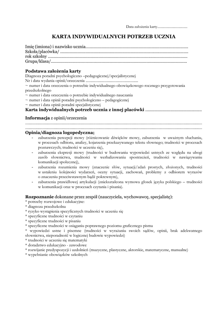 Karta indywidualnych potrzeb ucznia