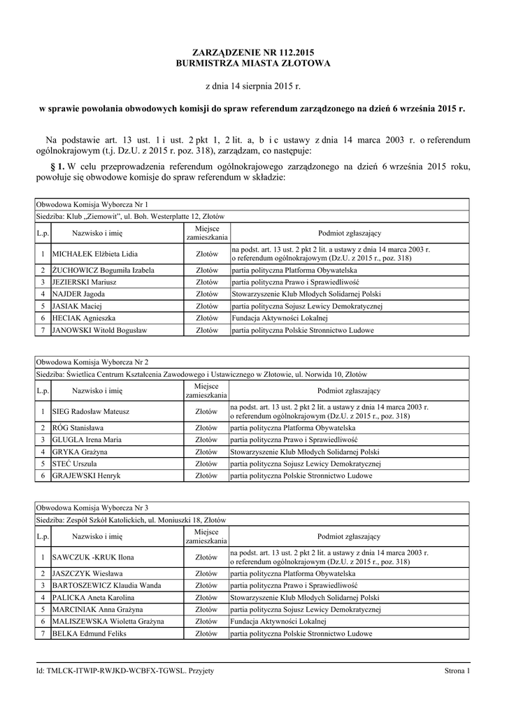 ZARZĄDZENIE NR 112.2015 BURMISTRZA MIASTA ZŁOTOWA z dnia 14 sierpnia 2015 r. w sprawie powołania obwodowych komisji do spraw referendum zarządzonego na dzień 6 września 2015 r. Na podstawie art. 13 ust. 1 i ust. 2 pkt 1, 2 lit. a, b i c ustawy z dnia 14 marca 2003 r. o referendum ogólnokrajowym (t.j. Dz.U. z 2015 r. poz. 318), zarządzam, co następuje: § 1. W celu przeprowadzenia referendum ogólnokrajowego zarządzonego na dzień 6 września 2015 roku, powołuje się obwodowe komisje do spraw referendum w składzie: Obwodowa Komisja Wyborcza Nr 1 Siedziba: Klub „Ziemowit”, ul. Boh. Westerplatte 12, Złotów L.p. Nazwisko i imię Miejsce zamieszkania Podmiot zgłaszający 1 MICHAŁEK Elżbieta Lidia Złotów na podst. art. 13 ust. 2 pkt 2 lit. a ustawy z dnia 14 marca 2003 r. o referendum ogólnokrajowym (Dz.U. z 2015 r., poz. 318) 2 ŻUCHOWICZ Bogumiła Izabela Złotów partia polityczna Platforma Obywatelska 3 JEZIERSKI Mariusz Złotów partia polityczna Prawo i Sprawiedliwość 4 NAJDER Jagoda Złotów Stowarzyszenie Klub Młodych Solidarnej Polski 5 JASIAK Maciej Złotów partia polityczna Sojusz Lewicy Demokratycznej 6 HECIAK Agnieszka Złotów Fundacja Aktywności Lokalnej 7 JANOWSKI Witold Bogusław Złotów partia polityczna Polskie Stronnictwo Ludowe Obwodowa Komisja Wyborcza Nr 2 Siedziba: Świetlica Centrum Kształcenia Zawodowego i Ustawicznego w Złotowie, ul. Norwida 10, Złotów L.p. Nazwisko i imię Miejsce zamieszkania Podmiot zgłaszający 1 SIEG Radosław Mateusz Złotów na podst. art. 13 ust. 2 pkt 2 lit. a ustawy z dnia 14 marca 2003 r. o referendum ogólnokrajowym (Dz.U. z 2015 r., poz. 318) 2 RÓG Stanisława Złotów partia polityczna Platforma Obywatelska 3 GLUGLA Irena Maria Złotów partia polityczna Prawo i Sprawiedliwość 4 GRYKA Grażyna Złotów Stowarzyszenie Klub Młodych Solidarnej Polski 5 STEĆ Urszula Złotów partia polityczna Sojusz Lewicy Demokratycznej 6 GRAJEWSKI Henryk Złotów partia polityczna Polskie Stronnictwo Ludowe Obwodowa Komisja Wyborcza Nr 3 Siedziba: Zespół Szkół Katolickich, ul. Moniuszki 18, Złotów L.p. Nazwisko i imię Miejsce zamieszkania Podmiot zgłaszający 1 SAWCZUK -KRUK Ilona Złotów na podst. art. 13 ust. 2 pkt 2 lit. a ustawy z dnia 14 marca 2003 r. o referendum ogólnokrajowym (Dz.U. z 2015 r., poz. 318) 2 JASZCZYK Wiesława Złotów partia polityczna Platforma Obywatelska 3 BARTOSZEWICZ Klaudia Wanda Złotów partia polityczna Prawo i Sprawiedliwość 4 PALICKA Aneta Karolina Złotów Stowarzyszenie Klub Młodych Solidarnej Polski 5 MARCINIAK Anna Grażyna Złotów partia polityczna Sojusz Lewicy Demokratycznej 6 MALISZEWSKA Wioletta Grażyna Złotów Fundacja Aktywności Lokalnej 7 BELKA Edmund Feliks Złotów partia polityczna Polskie Stronnictwo Ludowe Id: TMLCK-ITWIP-RWJKD-WCBFX-TGWSL. Przyjety Strona 1 Obwodowa Komisja Wyborcza Nr 4 Siedziba: Złotowskie Centrum Aktywności Społecznej, al. Piasta 26, Złotów L.p. Nazwisko i imię Miejsce zamieszkania Podmiot zgłaszający 1 MUZIOŁ Sylwia Złotów na podst. art. 13 ust. 2 pkt 2 lit. a ustawy z dnia 14 marca 2003 r. o referendum ogólnokrajowym (Dz.U. z 2015 r., poz. 318) 2 STANIEC Andrzej Złotów partia polityczna Prawo i Sprawiedliwość 3 GRYKA Magdalena Złotów Stowarzyszenie Klub Młodych Solidarnej Polski 4 MIŁOŚ Lech Stanisław Złotów partia polityczna Sojusz Lewicy Demokratycznej 5 SIKORSKA Anita Alina Złotów partia polityczna Polskie Stronnictwo Ludowe Obwodowa Komisja Wyborcza Nr 5 Siedziba: Sala sesyjna Urzędu Miejskiego w Złotowie, al. Piasta 1, Złotów L.p. Nazwisko i imię Miejsce zamieszkania Podmiot zgłaszający 1 MAŁACH Iwona Teresa Złotów na podst. art. 13 ust. 2 pkt 2 lit. a ustawy z dnia 14 marca 2003 r. o referendum ogólnokrajowym (Dz.U. z 2015 r., poz. 318) 2 BARTCZAK Barbara Monika Złotów partia polityczna Platforma Obywatelska 3 NURCZYK Krzysztof Złotów partia polityczna Prawo i Sprawiedliwość 4 PODMOKŁY Anna Złotów Stowarzyszenie Klub Młodych Solidarnej Polski 5 GRUNAU Lucyna Magdalena Złotów partia polityczna Sojusz Lewicy Demokratycznej 6 BIECKI Jarosław Złotów partia polityczna Polskie Stronnictwo Ludowe Obwodowa Komisja Wyborcza Nr 6 Siedziba: Stołówka Zespołu Szkół Samorządowych Nr 1, ul. Królowej Jadwigi 54/56, Złotów L.p. Nazwisko i imię Miejsce zamieszkania Podmiot zgłaszający 1 HERMANN Maciej Złotów na podst. art. 13 ust. 2 pkt 2 lit. a ustawy z dnia 14 marca 2003 r. o referendum ogólnokrajowym (Dz.U. z 2015 r., poz. 318) 2 CEGIELSKA Joanna Halina Złotów partia polityczna Platforma Obywatelska 3 GOLA Danuta Małgorzata Złotów partia polityczna Prawo i Sprawiedliwość 4 TWOREK Jolanta Złotów partia polityczna Sojusz Lewicy Demokratycznej 5 BELKA Krystyna Teresa Złotów partia polityczna Polskie Stronnictwo Ludowe Obwodowa Komisja Wyborcza Nr 7 Siedziba: Sala Przedszkola Publicznego Nr 2, ul. 8 -go Marca 18, Złotów L.p. Nazwisko i imię Miejsce zamieszkania Podmiot zgłaszający 1 PIĄTEK Alicja Anna Złotów na podst. art. 13 ust. 2 pkt 2 lit. a ustawy z dnia 14 marca 2003 r. o referendum ogólnokrajowym (Dz.U. z 2015 r., poz. 318) 2 MUZIOŁ Rozalia Złotów partia polityczna Platforma Obywatelska 3 PIĄTEK Jerzy Maciej Złotów partia polityczna Prawo i Sprawiedliwość 4 CZYŻ Adam Złotów Stowarzyszenie Klub Młodych Solidarnej Polski 5 CHODERA Barbara Maria Złotów partia polityczna Sojusz Lewicy Demokratycznej 6 MISZTAL Tadeusz Złotów partia polityczna Polskie Stronnictwo Ludowe Obwodowa Komisja Wyborcza Nr 8 Siedziba: Sala Gimnazjum Nr 2, ul. 8-go Marca 16, Złotów L.p. Nazwisko i imię Miejsce zamieszkania Id: TMLCK-ITWIP-RWJKD-WCBFX-TGWSL. Przyjety Podmiot zgłaszający Strona 2 1 BĄBIŃSKI Grzegorz Józef Złotów na podst. art. 13 ust. 2 pkt 2 lit. a ustawy z dnia 14 marca 2003 r. o referendum ogólnokrajowym (Dz.U. z 2015 r., poz. 318) 2 KOSELKE Agnieszka Monika Złotów partia polityczna Platforma Obywatelska 3 FIDURSKA Iwona Małgorzata