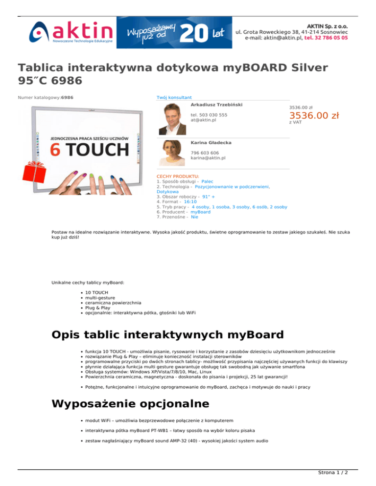 Tablica interaktywna dotykowa myBOARD Silver 95″C 6986 Numer katalogowy:6986 Twój konsultant Arkadiusz Trzebiński tel. 503 030 555 [email protected] NOWOŚĆ W OFERCIE 3536.00 zł 3536.00 zł z VAT Karina Gładecka 796 603 606 [email protected] CECHY PRODUKTU: 1. Sposób obsługi - Palec 2. Technologia - Pozycjonownanie w podczerwieni, Dotykowa 3. Obszar roboczy - 91" + 4. Format - 16:10 5. Tryb pracy - 4 osoby, 1 osoba, 3 osoby, 6 osób, 2 osoby 6. Producent - myBoard 7. Przenośne - Nie Postaw na idealne rozwiązanie interaktywne. Wysoka jakość produktu, świetne oprogramowanie to zestaw jakiego szukałeś. Nie szuka kup już dziś! Unikalne cechy tablicy myBoard: 10 TOUCH multi-gesture ceramiczna powierzchnia Plug & Play opcjonalnie: interaktywna pótka, gtośniki lub WiFi Opis tablic interaktywnych myBoard funkcja 10 TOUCH - umożliwia pisanie, rysowanie i korzystanie z zasobów dziesięciu użytkownikom jednocześnie rozwiązanie Plug & Play – eliminuje konieczność instalacji sterowników programowalne przyciski po dwóch stronach tablicy- możliwość przypisania najczęściej używanych funkcji do klawiszy płynnie działająca funkcja multi gesture gwarantuje obsługę tak swobodną jak używanie smartfona Obsługa systemów: Windows XP/Vista/7/8/10, Mac, Linux Powierzchnia ceramiczna, magnetyczna - doskonała do pisania i projekcji, 25 lat gwarancji! Potężne, funkcjonalne i intuicyjne oprogramowanie do myBoard, zachęca i motywuje do nauki i pracy Wyposażenie opcjonalne modut WiFi – umożliwia bezprzewodowe połączenie z komputerem interaktywna pótka myBoard PT-WB1 – łatwy sposób na wybór koloru pisaka zestaw nagłaśniający myBoard sound AMP-32 (40) - wysokiej jakości system audio Strona 1 / 2 Specyfikacja tablicy myBoard 95" C Technologia Model Obszar interaktywny [szer./wys. cm] Przekątna wymiaru interaktywnego [cm, (cale)] Wymiar zewnętrzny [szer./wys. cm] Przekątna wymiaru zewnętrznego [cm, (cale)] Format Rozdzielczość Grubość [cm] Waga [kg] Powierzchnia tablicy Funkcja myszy Cechy wyróżniające Technologia pozycjonowania w podczerwieni (dotykowa), możesz obsługiwać tablicę pisakiem, własnym palcem bądź dowolnym, innym przedmiotem. DTO-i89C 195,4 x 113,7 226,07cm (89″) 206,00 x 124,30 240,60cm (94,70″) 16:10 12800 x 9600 3 29 Ceramiczna o wysokiej odporności na zarysowania, uszkodzenia mechaniczne; powierzchnia matowa, nie skupiająca światła, bezpieczna dla oczu uczniów i nauczycieli. Łatwa do czyszczenia, dostosowana do używania pisaków suchościeralnych. TAK Funkcja 10-touch- jednoczesna praca dziesięciu osób bez konieczności dzielenia obszaru roboczego na 10 strefy! Technologia rozpoznawania gestów multi gesture Nie wymaga używania specjalnych pisaków – obsługiwana palcem Powierzchnia magnetyczna, umożliwiająca stosowanie pisaków suchościeralnych Rozwiązanie Plug&Play- bez potrzeby instalacji sterowników Czułość na nacisk Precyzja Tempo śledzenia sygnału Zasilanie Pobór mocy Czujniki IR odbierają nie tylko lekki dotyk, ale też zbliżenie pisaka/palca mniej niż 2 mm od powierzchni tablicy. ± 1mm 6ms – 12 ms Energia jest pobierana z komputera za pośrednictwem kabla USB. Strona 2 / 2 Powered by TCPDF (www.tcpdf.org)
