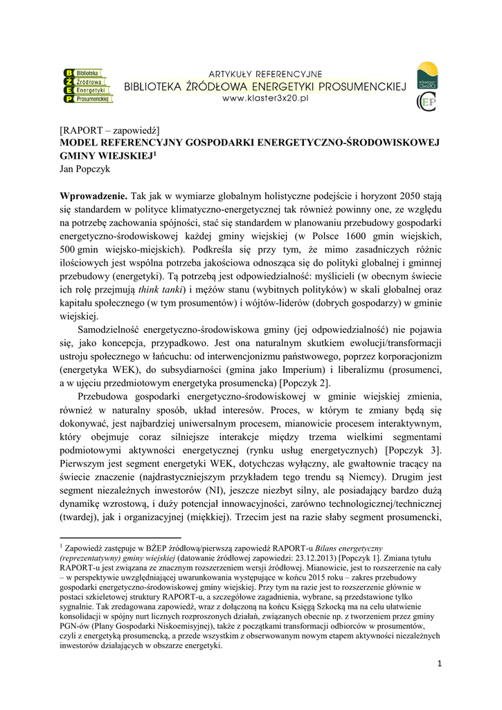 [RAPORT – zapowiedź] MODEL REFERENCYJNY GOSPODARKI ENERGETYCZNO-ŚRODOWISKOWEJ GMINY WIEJSKIEJ1 Jan Popczyk Wprowadzenie. Tak jak w wymiarze globalnym holistyczne podejście i horyzont 2050 stają się standardem w polityce klimatyczno-energetycznej tak również powinny one, ze względu na potrzebę zachowania spójności, stać się standardem w planowaniu przebudowy gospodarki energetyczno-środowiskowej każdej gminy wiejskiej (w Polsce 1600 gmin wiejskich, 500 gmin wiejsko-miejskich). Podkreśla się przy tym, że mimo zasadniczych różnic ilościowych jest wspólna potrzeba jakościowa odnosząca się do polityki globalnej i gminnej przebudowy (energetyki). Tą potrzebą jest odpowiedzialność: myślicieli (w obecnym świecie ich rolę przejmują think tanki) i mężów stanu (wybitnych polityków) w skali globalnej oraz kapitału społecznego (w tym prosumentów) i wójtów-liderów (dobrych gospodarzy) w gminie wiejskiej. Samodzielność energetyczno-środowiskowa gminy (jej odpowiedzialność) nie pojawia się, jako koncepcja, przypadkowo. Jest ona naturalnym skutkiem ewolucji/transformacji ustroju społecznego w łańcuchu: od interwencjonizmu państwowego, poprzez korporacjonizm (energetyka WEK), do subsydiarności (gmina jako Imperium) i liberalizmu (prosumenci, a w ujęciu przedmiotowym energetyka prosumencka) [Popczyk 2]. Przebudowa gospodarki energetyczno-środowiskowej w gminie wiejskiej zmienia, również w naturalny sposób, układ interesów. Proces, w którym te zmiany będą się dokonywać, jest najbardziej uniwersalnym procesem, mianowicie procesem interaktywnym, który obejmuje coraz silniejsze interakcje między trzema wielkimi segmentami podmiotowymi aktywności energetycznej (rynku usług energetycznych) [Popczyk 3]. Pierwszym jest segment energetyki WEK, dotychczas wyłączny, ale gwałtownie tracący na świecie znaczenie (najdrastyczniejszym przykładem tego trendu są Niemcy). Drugim jest segment niezależnych inwestorów (NI), jeszcze niezbyt silny, ale posiadający bardzo dużą dynamikę wzrostową, i duży potencjał innowacyjności, zarówno technologicznej/technicznej (twardej), jak i organizacyjnej (miękkiej). Trzecim jest na razie słaby segment prosumencki, Zapowiedź zastępuje w BŻEP źródłową/pierwszą zapowiedź RAPORT-u Bilans energetyczny (reprezentatywny) gminy wiejskiej (datowanie źródłowej zapowiedzi: 23.12.2013) [Popczyk 1]. Zmiana tytułu RAPORT-u jest związana ze znacznym rozszerzeniem wersji źródłowej. Mianowicie, jest to rozszerzenie na cały – w perspektywie uwzględniającej uwarunkowania występujące w końcu 2015 roku – zakres przebudowy gospodarki energetyczno-środowiskowej gminy wiejskiej. Przy tym na razie jest to rozszerzenie głównie w postaci szkieletowej struktury RAPORT-u, a szczegółowe zagadnienia, wybrane, są przedstawione tylko sygnalnie. Tak zredagowana zapowiedź, wraz z dołączoną na końcu Księgą Szkocką ma na celu ułatwienie konsolidacji w spójny nurt licznych rozproszonych działań, związanych obecnie np. z tworzeniem przez gminy PGN-ów (Plany Gospodarki Niskoemisyjnej), także z początkami transformacji odbiorców w prosumentów, czyli z energetyką prosumencką, a przede wszystkim z obserwowanym nowym etapem aktywności niezależnych inwestorów działających w obszarze energetyki. 1 1 z przyszłymi prosumentami, w których stopniowo będą się przekształcać obecni odbiorcy; przy tym szczególną kategorią prosumentów są prosumenci instytucjonalni (takim prosumentem jest potencjalnie każda gmina wiejska traktowana jako urząd/Imperium, z obiektami użyteczności publicznej). Ten segment ma również duży potencjał innowacyjności, zarówno twardej, jak i miękkiej. W nowej optyce energetykę WEK (w Polsce obecnie są to w szczególności cztery wielkie grupy energetyczne) trzeba widzieć w gminie wiejskiej przez pryzmat elektroenergetycznych sieci rozdzielczych średniego i niskiego napięcia (SN, nN). Niezależnych inwestorów (przede wszystkim małe i średnie przedsiębiorstwa) trzeba natomiast widzieć przez pryzmat rozproszonych technologii wytwórczych OZE i inteligentnej infrastruktury oraz charakterystycznych modeli biznesowych (skrajnie różnych od modeli biznesowych energetyki WEK, z właściwą dla małych i średnich przedsiębiorstw ekonomiką wysokiego ryzyka, w której dominują modele join venture, private eguity). Prosumentów trzeba natomiast widzieć przez pryzmat partycypacji prosumenckiej, która może już przybierać bardzo różnorodne formy, od prosumenckiego know how, poprzez inwestycje (w obszarze efektywności energetycznej, źródeł OZE i inteligentnej infrastruktury), aż po zarządzanie swoją (prosumencką) gospodarką energetyczno-środowiskową (w sferze użytkowania energii/paliw). PROPONOWANA STRUKTURA RAPORTU Przedstawiona poniżej struktura RAPORTU jest próbą zarysowania w miarę kompletnego (na obecnym etapie) zakresu bardzo szerokiego zagadnienia, jakim jest przebudowa gospodarki energetyczno-środowiskowej gmin wiejskich w Polsce. Celem tej próby jest zarazem rozpoczęcie budowy standardu postępowania umożliwiającego przyspieszenie przebudowy; jest bowiem oczywiste, że skalowanie modelu referencyjnego gospodarki energetycznośrodowiskowej gminy wiejskiej do warunków każdej indywidualnej gminy będzie bardzo proste, czyli zakres zastosowania modelu będzie bardzo szeroki (potencjalnie będzie dotyczył 2100 gmin, łącznie z gminami wiejsko-miejskimi). Oczywiście, budowę standardu rozumie się tu jako cel, który będzie miał postać stosunkowo mocno rozmytą, bo będzie on realizowany, głównie w przestrzeni internetowej, w sposób masowy, nieformalny. Podkreśla się przy tym, że rozmycie celu nie tylko nie jest jego słabą stroną (w kategoriach analizy SWOT), ale przeciwnie jest to mocna strona, bo chodzi przecież o stopniowe tworzenie silnie konkurencyjnego rynku usług energetycznych, którego jeszcze 