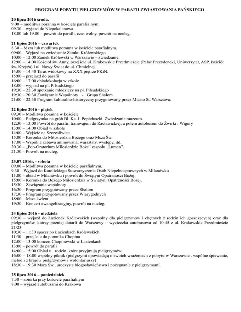 PROGRAM POBYTU PIELGRZYMÓW W PARAFII ZWIASTOWANIA PAŃSKIEGO 20 lipca 2016 środa. 9.00 – modlitwa poranna w kościele parafialnym. 09.30 – wyjazd do Niepokalanowa. 18.00 lub 19.00 – powrót do parafii, czas wolny, powrót na nocleg. 21 lipiec 2016 – czwartek 8.30 – Msza lub modlitwa poranna w kościele parafialnym. 09:00 – Wyjazd na zwiedzanie Zamku Królewskiego 10:00 – 12:00 Zamek Królewski w Warszawie – zwiedzanie. 12:00 – 14:00 Kościół św. Anny, przejście ul. Krakowskie Przedmieście (Pałac Prezydencki, Uniwersytet, ASP, kościół św. Krzyża) i ul. Nowy Świat do ul. Chmielnej. 14:00 – 14:40 Taras widokowy na XXX piętrze PKiN. 15:00 – przejazd do parafii 16:00 – 17:00 obiadokolacja w szkole 18:00 – wyjazd na pl. Piłsudskiego 19:30 – 22:30 spotkanie młodzieży na pl. Piłsudskiego 19:30 – 20:30 Zawiązanie Wspólnoty - Grupa Shalom 21:00 – 22:30 Program kulturalno-historyczny przygotowany przez Miasto St. Warszawa. 22 lipiec 2016 - piątek 09.30 – Modlitwa poranna w kościele 10:00 – Pielgrzymka na grób Bł. Ks. J. Popiełuszki. Zwiedzanie muzeum. 12:30 – 13:00 Powrót do parafii: tramwajem do Racławickiej, a potem autobusem do Żwirki i Wigury 13:00 – 14:00 Obiad w szkole 14:00 – Wyjście na Szczęśliwice. 15.00 – Koronka do Miłosierdzia Bożego oraz Msza Św. 17.00 – Wspólna zabawa animowana, warsztaty, występy, itd. 20.30 – „Pop-Oratorium Miłosierdzie Boże” zespołu „Lumen”. 21.30 – Powrót na nocleg. 23.07.2016r. - sobota 09.00 – Modlitwa poranna w kościele parafialnym. 9.30 – Wyjazd do Katolickiego Stowarzyszenia Osób Niepełnosprawnych w Milanówku 13.00 – obiad w Milanówku i powrót do Świątyni Opatrzności Bożej. 15:00 – Koronka do Bożego Miłosierdzia w Świątyni Opatrzności Bożej. 15:30 – Zawiązanie wspólnoty 16:30 – Program przygotowany przez Shalom 17:30 – Program przygotowany przez Wiarygodnych 18:00 – Msza święta 19:30 – Koncert ewangelizacyjny, powrót na nocleg. 24 lipiec 2016 - niedziela 09:30 – wyjazd do Łazienek Królewskich (wspólny dla pielgrzymów i chętnych z rodzin ich goszczących) oraz dla pielgrzymów, którzy później dotarli do Warszawy – wycieczka autobusowa od 10.45 z ul. Krakowskie Przedmieście 21/23 10:30 – 11:30 spacer po Łazienkach Królewskich 11:30 – przejście do pomnika Chopina 12:00 – 13:00 koncert Chopinowski w Łazienkach 13:00 – powrót do parafii 14:00 – 15:00 Obiad u rodzin, które przyjmują pielgrzymów. 16:00 – 18:00 wspólny piknik (pielgrzymi opowiadają o swoich wrażeniach z pobytu w Warszawie , wspólne śpiewanie, melodii z krajów pielgrzymów i wolontariuszy) 18:30 – 19:30 Msza Św., uroczyste błogosławieństwo i pożegnanie z pielgrzymami. 25 lipca 2016 – poniedziałek 7.30 – zbiórka przy kościele parafialnym 8.00 – wyjazd autobusami do Krakowa