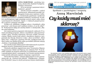 ANNA MARCINIAK psycholog, tera peuta, absolwentka Akademii Teologii Ka tolickiej w Warszawie. Od 20 lat pracuje z pacjentami indywi dualnymi i „parami". Autorka licznych artykułów i audycji poświęconych odmienności psychiki i po strzegania świata przez mężczyzn i kobie ty. Zwolenniczka pojednania i możliwości uzyskania porozumienia w związkach osobistych i zawodowych. W prak tyce psychologicznej ciągle poszukuje nowych metod, unika rutyny i przywiązania do schematów. Zajęcia w większych grupach prowa dzi w oparciu o programy autorskie. Wydała m.in. publikację „Osiągnąć sukces w kontaktach z płcią przeciwną", serię broszur pod wspólnym tytułem „Co ja źle robię?”. W Wydawnictwie Wilga jest autorką tekstów w miesięczniku „Mię dzy nami kobietami”. Jest częstym gościem programów telewizyjnych i radiowych. W ra mach autorskiego programu „Sukces w kontaktach z płcią przeciwną” wydała 3 płyty: Początek znajomości, Pierwsza randka, Porozma wiajmy. Między innymi brała udział w charakterze eksperta w pro gramach: Ewy Drzyzgi „Rozmowy w toku”, „Kawa czy herbata” „Dzień dobry TVN”, w filmowym reportażu TVP info, współpracowała z Ra diem Lublin oraz Radiem Rytm, gdzie prowadziła cyklicznie audycję „Godzina z Czarodziejską Różdżką”. Jest autorką terapii relaksacyjnych ukierunkowanych na przeciw działanie stresowi i podniesienie poczucia wartości. Ukończyła szkolenia organizowane przez Towarzystwo Hipnozy Terapeutycznej i Badań nad Hipnozą oraz szkolenia NLP. W jej do robku znajduje się program nastawiony na podniesienie samooceny i samoakceptacji oparty o autosugestię. Jest również autorką innowa cyjnej metody pokonania napięcia związanego z egzaminami. Od lat aktywnie działa w akcjach edukacyjnych na rzecz porozu mienia płci, np. „Festiwal dwie połówki”. Współpracuje z „Dzienni kiem Wschodnim” pisząc do rubryki poświęconej relacjom międzyludzkim. Spotkanie z psychologiem i terapeutą Anną Marciniak Czy każdy musi mieć sklerozę? Im jesteśmy starsi, tym trudniej nam uczyć się nowych rzeczy, pogar sza się pamięć. Jest to naturalne zjawisko związane z tym, że z biegiem cza su komórki mózgowe ulegają niszczeniu, a nie mają one zdolności do odna wiania się. Niedotlenienie, odkładające się w mózgu metale ciężkie i wolne rodniki – to wszystko nie jest obojętne dla układu nerwowego. Jeżeli jed nak zaburzenia pamięci i koncentracji są łagodne i nie utrudniają nam co dziennego funkcjonowania, możemy być spokojni i uznać swój stan za pra widłowy. Kilka przyczyn które powodu ją problemy z pamięcią Leki Wiele leków może powodować pro blemy z pamięcią. Wśród nich najsil niej działają leki uspokajające (np. Va lium, Xanax). Każdy lek powodujący senność może zaburzać koncentrację i przyswajanie nowych faktów – takich leków jest wiele, w tym dostępne bez recepty leki antyhistaminowe. (…) Sze roko stosowane betablokery zmniej szają emocjonalny ładunek pewnych wspomnień. Także stosowany w ane stezjologii propofol może wymazać kil ka minut z naszego życia. Nie leczona choroba serca, miażdżyca, cukrzyca Alkohol Powoduje postępujący zanik mó zgu i zaburzenia połączeń pomiędzy re jonami mózgu biorącymi udział w prze chowywaniu i przywoływaniu wspo mnień. W ekstremalnych przypadkach alkoholik może całkowicie stracić pa mięć długotrwałą. (…) Nadużywanie al koholu może także powodować niedo bór witamin B1 i B12, który negatywnie wpływa na pamięć. Siedzący tryb życia Ćwiczenia fizyczne i umysłowe ma ją kluczowe znaczenie dla dobrego funk cjonowania pamięci. Mózg, tak jak każ dy organ, odnosi korzyści ze zwiększo nego przepływu krwi podczas aktywności fizycznej. Jego tkanki ulegają wzmoc nieniu, gdy są intensywnie wykorzysty wane. Dodatkowo badania wykazują, że osoby lepiej wykształcone oraz ak tywne intelektualnie rozwijają „rezer wę poznawczą”, która zmniejsza nasi lenie objawów, gdy ich mózg zaatakuje choroba Alzheimera. Pomóż swojej pamięci. W aptekach możemy kupić środki, które, zgodnie z informacjami zawarty mi w ulotkach, mają mieć korzystny wpływ na pamięć i koncentrację poprzez poprawę ukrwienia mózgu. Niestety, nie możemy ich traktować jako jedyne go sposobu na zaburzenia pamięci i kon centracji. Aby jak najdłużej cieszyć się sprawnością naszego umysłu, należy: • systematycznie ćwiczyć pamięć – nie ma lepszego lekarstwa na kondycję naszego umysłu niż przyswajanie no wych informacji, nauka języków obcych, rozwiązywanie krzyżówek, gry logiczne itd., jak najwięcej przebywać na świe żym powietrzu, dbać o aktywność fi zycznąstosować zdrową dietę bogatą w owoce i warzywa oraz produkty bogate w kwasy omega – 3 oraz witaminę E, • zrezygnować z picia herbaty z cy tryną – cytryna wiąże glin zawarty w herbacie, co sprawia, że łatwiej odkła da się on w naszym organizmie, m.in. w mózgu, • prowadzić aktywne życie towa rzyskie – kontakty z ludźmi stymulują nasz mózg i przyczyniają się do uspraw niania jego funkcji. Czy na starość trzeba mieć „sklerozę” Wiele osób zbyt późno zgłasza się do lekarzy z trudnościami z pamięcią uważając, że „przecież w moim wieku to naturalne”. Często osoby z najbliż szego otoczenia również bagatelizują objawy przypisując je naturalnemu pro cesowi starzenia się. Wczesne rozpo znanie problemów z pamięcią daje ogromną szansę na opóźnienie proce sów utraty pamięci. Poznanie pro stych ćwiczeń wspomagających procesy, koncentracji i pamięć da je szansę na poprawę. Zapraszam na spotkanie, proszę nie zapomnieć. Spotkanie z psychologiem i terapeutą Anną Marciniak Czy każdy musi mieć sklerozę? Spotkanie z projekcją filmów odbędzie się w środę 11 maja 2016 r. o godz. 18.00 w sali widowiskowej Domu Kultury LSM w Lublinie, ul. K. W