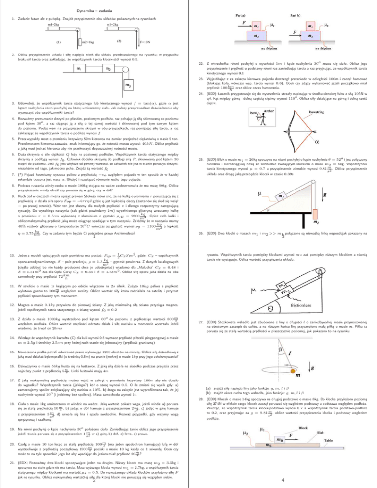 Dynamika – zadania 1. Zadanie łatwe ale z pułapką. Znajdź przyspieszenie obu układów pokazanych na rysunkach m1=2kg m1=2kg (1) (2) m2=1kg F=10N 2. Oblicz przyspieszenie układu i siłę napięcia nitek dla układu przedstawionego na rysunku; w przypadku braku sił tarcia oraz zakładając, że współczynnik tarcia klocek-stół wynosi 0.5. m1 m2 m3 3. Udowodnij, że współczynnik tarcia statycznego lub kinetycznego wynosi f = tan(α), gdzie α jest kątem nachylenia równi pochyłej na której umieszczmy ciało. Jak nalezy przeprowadzać doświadczenie aby wyznaczyć oba współczynniki tarcia? 22. Z wierzchołka równi pochyłej o wysokości 1m i kącie nachylenia 30o zsuwa się ciało. Oblicz jego przyspieszenie i prędkość u podstawy równi raz zaniedbując tarcia a raz przyjnując, że współczynnik tarcia kinetycznego wynosi 0.1 23. Wyjeżdżając z za zakrętu kierowca pojazdu dostrzegł przeszkode w odległości 100m i zaczął hamować (blokując koła, wówczas wsp. tarcia wynosi 0.6). Oceń czy zdąży wyhamować jeżeli początkowo miał prędkość 100 km oraz oblicz czzas hamowania. h 24. (EDX) Łucznik przygotowuje się do wystrzelenia strzały napinając w środku cienciwę łuku z siłą 105N w tył. Kąt między górną i dolną częścią cięciwy wynosi 110o . Oblicz siły działające na górną i dolną cześć cięciw. 4. Rozważmy przesuwanie skrzyni po płaskim, poziomym podłożu, raz pchając ją siłą skierowaną do poziomu pod kątem 30o , a raz ciągnąc ją z siłą o tej samej wartości i skierowanej pod tym samym kątem do poziomu. Podaj wzór na przyspieszenie skrzyni w obu przypadkach, raz pomijając siłę tarcia, a raz zakładając że współczynnik tarcia o podłoże wynosi f 5. Przez wypukły most o promieniu krzywizny 50m kierowca ma zamiar przejechać ciężarówką o masie 5 ton. Przed mostem kierowca zauważa, znak informujący go, że nośność mostu wynosi: 40kN . Oblicz prędkość z jaką musi jechać kierowca aby nie przekroczyć dopuszczalnej nośności mostu. 6. Duża skrzynia o sile ciężkości Q leży na poziomej podłodze. Współczynnik tarcia statycznego między skrzynią a podłogą wynosi f0 . Człowiek dociska skrzynię do podłogi siłą P , skierowaną pod kątem 30 stopni do poziomu. Jeśli f0 jest większe od pewnej wartości, to człowiek nie jest w stanie poruszyć skrzyni, niezależnie od tego, jak mocno pcha. Znajdź tą wartość f0 7. (*) Pojazd kosmiczny wyrzuca paliwo z prędkością −vo względem pojazdu w ten sposób że w każdej sekundzie tracona jest masa α. Ułożyć i rozwiązać równanie ruchu tego pojazdu. 25. (EDX) Blok o masie m1 = 26kg spoczywa na równi pochyłej o kącie nachylenia θ = 52o i jest połączony nieważka i nierozciągliwą nitką ze swobodnie zwisającym klockiem o masie m2 = 6kg. Współczynnik tarcia kinetycznego wynosi µ = 0.7 a przyspieszenie ziemskie wynosi 9.81 m . Oblicz przyspieszenie s2 układu oraz drogę jaką przebędzie klocek w czasie 0.39s 8. Podczas ruszania windy osoba o masie 100kg stojąca na wadze zaobserwowała że ma masę 90kg. Oblicz przyspieszenie windy określ czy porusza się w górę, czy w dół? 9. Ruch ciał w cieczach można opisać prawem Stokesa mówi ono, że na kulkę o promieniu r poruszającą się z prędkością v działa siła oporu F~op = −6πrη~ v gdzie η jest lepkością cieczy (zastanów się skąd się wziął − po prawej stronie). Wzór ten jest słuszny dla małych prędkości v i dlatego rozpatrzymy następującą sytuację. Do wysokiego naczynia (tak gdzieś powiedzmy 2m) wypełnionego gliceryną wrzucamy kulkę kg o promieniu r = 0.5cm wykonaną z aluminium o gęstości ρAl = 2600 3 . Opisz ruch kulki i m oblicz maksymalną prędkość jaką może osiągnąc spadając w tym naczyniu. Załóżmy że w naczyniu mamy kg 40% roztwór gliceryny o temperaturze 20o C wówczas jej gęstość wynosi ρg = 1100 3 a lepkość m kg η = 3.75 ms . Czy w zadaniu tym będzie Ci potrzebne prawo Archimedesa? 1 2 10. Jeden z modeli opisujących opór powietrza ma postać: Fop = 1 2 Cx Sρv , gdzie: Cx – współczynnik kg oporu aerodynamicznego, S – pole przekroju, ρ = 1.3 3 – gęstość powietrza. Z danych katalogowych m (ciężko zdobyć bo nie każdy producent chce je udostępniać) wiadomo dla „Malucha” Cx = 0.48 i S = 1.51m2 zaś dla Opla Corsy Cx = 0.35 i S = 1.73m2 . Oblicz siłę oporu jaka działa na oba samochody przy prędkości 72 km h 26. (EDX) Dwa klocki o masach m1 i m2 >> m1 połączone są nieważką linką wsposóbjak pokazany na 3 rysunku. Współczynnik tarcia pomiędzy klockami wynosi mu zaś pomiędzy niższym klockiem a równią tarcie nie występuje. Oblicz wartość przyspiezenia układu. 11. W satelicie o masie 1t krążącym po orbicie włączono na 2s silnik. Zużyto 10kg paliwa a prędkość wylotowa gazów to 100 m s względem satelity. Oblicz wartość siły która zadziałała na satelitę i przyrost pędkości spowodowany tym manewrem. 12. Magnes o masie 0.1kg przywiera do pionowej ściany. Z jaką minimalną siłą ściana przyciąga magnes, jeżeli współczynnik tarcia statycznego o ścianę wynosi f0 = 0.2 13. Z działa o masie 1000kg wystrzelono pod kątem 60o do poziomu z prędkościąo wartości 800 m s względem podłoża. Oblicz wartość prędkości odrzutu działa i siłę nacisku w momencie wystrzału jeżeli wiadomo, że trwał on 20ms 27. (EDX) Stożkowate wahadło jest zbudowane z liny o długości l o zaniedbywalnej masie przymocowanej na obrotowym zaczepie do sufitu, a na niższym końcu liny przyczepiono małą piłkę o masie m. Piłka ta porusza się ze stałą wartością prędkości w płaszczyźnie poziomej, jak pokazano to na rysunku: 14. Wiedząc że współczynnik kształtu (C) dla kuli wynosi 0.5 wyznacz prędkość piłeczki pingpongowej o masie m = 2.5g i średnicy 3.5cm przy której ruch stanie się jednostajny (prędkość graniczną) 15. Nowoczesna pralka p