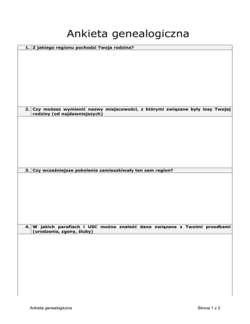 Ankieta genealogiczna 1. Z jakiego regionu pochodzi Twoja rodzina? 2. Czy możesz wymienić nazwy miejscowości, z którymi związane były losy Twojej rodziny (od najdawniejszych) 3. Czy wcześniejsze pokolenia zamieszkiwały ten sam region? 4. W jakich parafiach i USC można znaleźć dane związane z Twoimi przodkami (urodzenia, zgony, śluby) Ankieta genealogiczna Strona 1 z 2 5. Jeśli znasz imiona, daty i miejsca urodzenia swoich przodków – podaj je 6. Czy wiesz coś o ich rodzinach? Chodzi przede wszystkim o braci i siostry (które po zamążpójściu zmieniły nazwisko) 7. Czy znasz osoby o takim samym nazwisku, jak Twoje i czy na podstawie tego, co wiesz o swojej rodzinie, potrafisz ustalić, czy jesteście spokrewnieni? 8. Czy wiesz coś na temat zawodów wykonywanych przez przodków, urzędów, które pełnili, kariery naukowej, godności itp. 9. Czy ktoś z Twojej rodziny interesuje się genealogią? 10. Ankietę wyślij na adres mailowy Jeśli jesteś zainteresowany poszukiwaniami swoich przodków i chcesz się przyłączyć do naszej grupy osób poszukujących korzeni rodziny ……………………………………, wypełnij ankietę i zaproś do współpracy osoby o tym samym nazwisku. Przekaż mu ankietę. Ankieta genealogiczna Strona 2 z 2