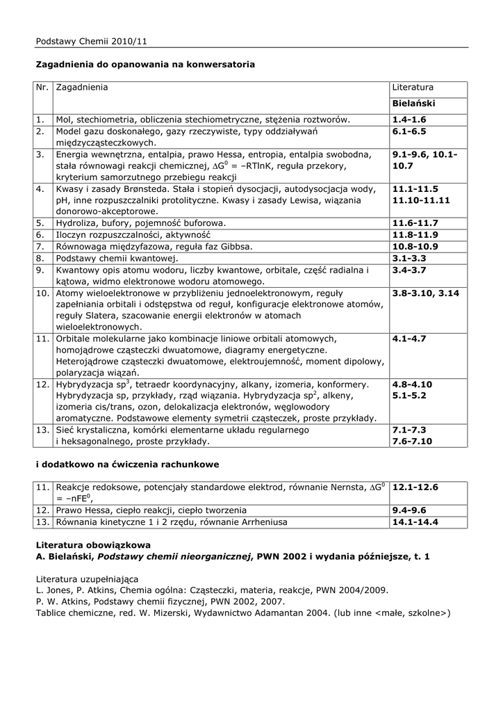 Podstawy Chemii 2010/11 Zagadnienia do opanowania na