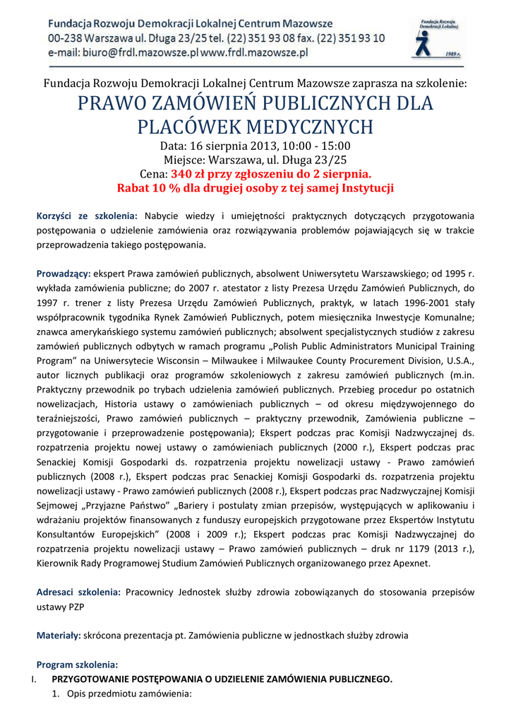 Fundacja Rozwoju Demokracji Lokalnej Centrum Mazowsze zaprasza na szkolenie: PRAWO ZAMÓWIEŃ PUBLICZNYCH DLA PLACÓWEK MEDYCZNYCH Data: 16 sierpnia 2013, 10:00 - 15:00 Miejsce: Warszawa, ul. Długa 23/25 Cena: 340 zł przy zgłoszeniu do 2 sierpnia. Rabat 10 % dla drugiej osoby z tej samej Instytucji Korzyści ze szkolenia: Nabycie wiedzy i umiejętności praktycznych dotyczących przygotowania postępowania o udzielenie zamówienia oraz rozwiązywania problemów pojawiających się w trakcie przeprowadzenia takiego postępowania. Prowadzący: ekspert Prawa zamówień publicznych, absolwent Uniwersytetu Warszawskiego; od 1995 r. wykłada zamówienia publiczne; do 2007 r. atestator z listy Prezesa Urzędu Zamówień Publicznych, do 1997 r. trener z listy Prezesa Urzędu Zamówień Publicznych, praktyk, w latach 1996-2001 stały współpracownik tygodnika Rynek Zamówień Publicznych, potem miesięcznika Inwestycje Komunalne; znawca amerykańskiego systemu zamówień publicznych; absolwent specjalistycznych studiów z zakresu zamówień publicznych odbytych w ramach programu „Polish Public Administrators Municipal Training Program” na Uniwersytecie Wisconsin – Milwaukee i Milwaukee County Procurement Division, U.S.A., autor licznych publikacji oraz programów szkoleniowych z zakresu zamówień publicznych (m.in. Praktyczny przewodnik po trybach udzielenia zamówień publicznych. Przebieg procedur po ostatnich nowelizacjach, Historia ustawy o zamówieniach publicznych – od okresu międzywojennego do teraźniejszości, Prawo zamówień publicznych – praktyczny przewodnik, Zamówienia publiczne – przygotowanie i przeprowadzenie postępowania); Ekspert podczas prac Komisji Nadzwyczajnej ds. rozpatrzenia projektu nowej ustawy o zamówieniach publicznych (2000 r.), Ekspert podczas prac Senackiej Komisji Gospodarki ds. rozpatrzenia projektu nowelizacji ustawy - Prawo zamówień publicznych (2008 r.), Ekspert podczas prac Senackiej Komisji Gospodarki ds. rozpatrzenia projektu nowelizacji ustawy - Prawo zamówień publicznych (2008 r.), Ekspert podczas prac Nadzwyczajnej Komisji Sejmowej „Przyjazne Państwo” „Bariery i postulaty zmian przepisów, występujących w aplikowaniu i wdrażaniu projektów finansowanych z funduszy europejskich przygotowane przez Ekspertów Instytutu Konsultantów Europejskich” (2008 i 2009 r.); Ekspert podczas prac Komisji Nadzwyczajnej do rozpatrzenia projektu nowelizacji ustawy – Prawo zamówień publicznych – druk nr 1179 (2013 r.), Kierownik Rady Programowej Studium Zamówień Publicznych organizowanego przez Apexnet. Adresaci szkolenia: Pracownicy Jednostek służby zdrowia zobowiązanych do stosowania przepisów ustawy PZP Materiały: skrócona prezentacja pt. Zamówienia publiczne w jednostkach służby zdrowia Program szkolenia: I. PRZYGOTOWANIE POSTĘPOWANIA O UDZIELENIE ZAMÓWIENIA PUBLICZNEGO. 1. Opis przedmiotu zamówienia: II. a) Kryteria identyfikacji zamówienia (zasady agregacji zamówień publicznych): b) Podobieństwo przedmiotowe (pojęcie usługi tego samego rodzaju lub o podobnym przeznaczeniu), c) Podobieństwo czasowe, d) Dostępność, 2. Znak towarowy, patent lub pochodzenie w opisie przedmiotu zamówienia – ustawowe przesłanki stosowania; obowiązki wykonawcy, który powołuje się na rozwiązania równoważne opisywanym przez zamawiającego, 3. Wybrane aspekty ustalenia wartości zamówienia a) Podstawy ustalenia wartości zamówienia w zależności od przedmiotu zamówienia: • ustalenie wartości zamówienia na dostawy lub usługi jednorazowe, • ustalenie wartości zamówienia na dostawy lub usługi powtarzające się okresowo, • ustalenie wartości zamówienia na roboty budowlane. b) Zasady postępowania przy udzielaniu zamówień nieplanowanych, c) Ustalanie wartości zamówienia w sytuacji udzielania zamówień w częściach: • różnica pomiędzy dopuszczalnym a niedopuszczalnym podziałem zamówienia na części, • zasady szacowania zamówienia w sytuacji braku rozstrzygnięcia postępowania w części, • udzielanie zamówień na część dostawy lub usługi, której wartość nie przekracza 80 000 € oraz część robót budowlanych o wartości do 1 000 000 € (art. 6a). WYBRANE ASPEKTY TWORZENIA SIWZ. 1. Warunki udziału w postępowaniu oraz opis sposobu dokonywania oceny spełniania tych warunków a) Warunek związany i proporcjonalny do przedmiotu zamówienia - najczęściej popełniane błędy przy ustalaniu warunków podmiotowych; b) Dokumentowanie spełniania warunków udziału w postępowaniu. 2. Konstruowanie kryteriów oceny ofert na wyroby medyczne w specyfikacji istotnych warunków zamówienia: a) Dobór kryteriów oceny ofert – oferta z najniższą ceną, czy oferta najkorzystniejsza ekonomicznie? b) Opis kryteriów oceny, c) Waga (znaczenie) kryteriów oceny ofert, d) Opis sposobu oceny ofert: • Kryteria wymierne, • Kryteria niewymierne – zasady kwantyfikacji, e) Przykłady pozacenowych kryteriów oceny ofert: • kryteria przedmiotowe, • kryteria podmiotowe w postępowaniu o zamówienie na usługi niepriorytetowe. 3. Wyjaśnienie treści SIWZ i wprowadzanie do niej zmian – różnica pomiędzy wyjaśnieniem, a zmianą SIWZ. ZGŁOSZENIE PRAWO ZAMÓWIEŃ PUBLICZNYCH DLA PLACÓWEK MEDYCZNYCH Data: 16 sierpnia 2013, 10:00 - 15:00 Miejsce: Warszawa, ul. Długa 23/25 Cena: 340 zł przy zgłoszeniu do 2 sierpnia. Rabat 10 % dla drugiej osoby z tej samej Instytucji Instytucja: ........................................................................................................................... Adres: ................................................................................................................................. NIP: ..................................................................................................................................... L.p. Imię i nazwisko Wydział tel. e-mail 1.....................................................................