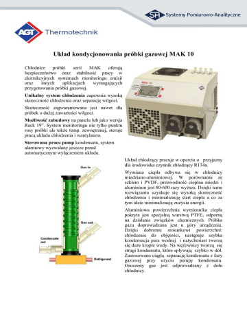 Układ kondycjonowania próbki gazowej MAK 10 Chłodnice próbki serii MAK oferują bezpieczeństwo oraz stabilność pracy w ekstrakcyjnych systemach monitoringu emisji oraz innych aplikacjach wymagających przygotowania próbki gazowej. Unikalny system chłodzenia zapewnia wysoką skuteczność chłodzenia oraz separację wilgoci. Skuteczność zagwarantowana jest nawet dla próbek o dużej zawartości wilgoci. Możliwość zabudowy na panelu lub jako wersja Rack 19”. System monitoringu nie tylko punktu rosy próbki ale także temp. zewnętrznej, steruje pracą układu chłodzenia i wentylatora. Sterowana praca pomp kondensatu, system alarmowy wyzwalany jeszcze przed automatycznym wyłączeniem układu. Układ chłodzący pracuje w oparciu o przyjazny dla środowiska czynnik chłodzący R134a. Wymiana ciepła odbywa się w chłodnicy miedziano-aluminiowej. W porównaniu ze szkłem i PVDF, przewodność cieplna miedzi i aluminium jest 80-600 razy wyższa. Dzięki temu rozwiązaniu uzyskuje się wysoką skuteczność chłodzenia i minimalizację start ciepła a co za tym idzie minimalizację zużycia energii. Aluminiowa powierzchnia wymiennika ciepła pokryta jest specjalną warstwą PTFE, odporną na działanie związków chemicznych. Próbka gazu doprowadzana jest u góry urządzenia. Dzięki dobremu stosunkowi powierzchni: chłodzenie do objętości, następuje szybka kondensacja para wodnej i natychmiast tworzą się duże krople wody. Na wężownicy tworzą się strugi kondensatu, które spływają szybko w dół. Zastosowano ciągłą separację kondensatu z fazy gazowej przy użyciu pompy kondensatu. Osuszony gaz jest odprowadzany z dołu chłodnicy. Model MAK10-1 MAK10-2 MAK10-4 Parametry pracy Ilość torów próbki Przepływ próbki 1 2 125 l/h 125 l/h - temp. punktu rosy na wlocie Przepływ próbki 100 l/h 65°C 175 l/h 175 l/h - temp. punktu rosy na wlocie 55°C Temp. próbki na wlocie 140°C -maksymalna temp. próbki 140°C Temp. pracy 5-45°C Ciśnienie próbki 140 l/h 0,5 do 2,2, bar Temp. punkt rosy na wylocie 3°C ±0,3 Spadek ciśnienia 5 mbar (V=125 l/h) Martwa objętość układu Gotowość do pracy 4 26ml < 5 min. Moc przy temp 45 C < 10 min. 220 W < 15 min. 300 W Materiały Wymiennik ciepła-rdzeń Aluminium Powierzchnia chłodząca pokryta PTFE Obudowa/uszczelnienie PVDF/Viton Dane techniczne Szerokość 310 mm 449 mm Wysokość 266 mm 266 mm Głębokość 271 mm 271 mm Waga 16 kg Obudowa 17 kg 20 kg montaż naścienny Obudowa 19” opcja Kolor RAL 7032 Podłączenia próbki PVDF DN 4/6 Podłączenia kondensatu PVDF DN 4/6 Dane elektryczne Podłączenie zasilania Alarm Ustawienia progu alarmowego wtyczka EUR 250 V, 1A, 50 VA < +2°C/ > +8°C Obudowa IP 20 EN 60529/EN 61010 Zasilanie 230 V, 50 Hz ±15 % Pobór mocy Zasilanie Pobór mocy Zasilanie Pobór mocy 152 W 214 W 230 V, 60 Hz ±10 % 182 W 245 W 115 V, 50/60 Hz ±10 % 190 W Przedstawiciel firmy AGT na terenie Polski: SPA Systemy Pomiarowo-Analityczne Sp. z o.o. www.spa-systemy.pl; [email protected] 265 W